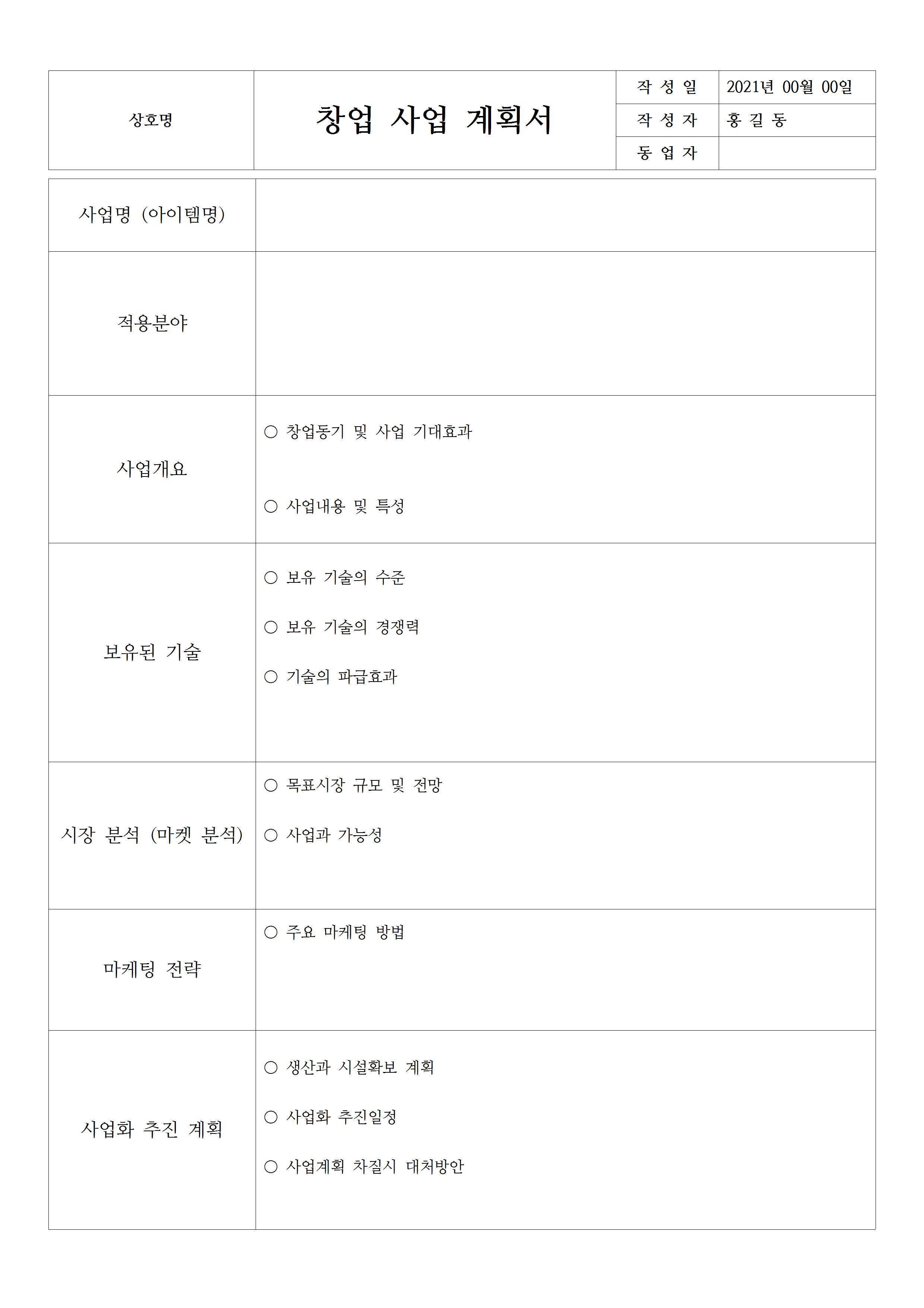 창업 사업계획서 양식 무료 다운로드 받으실 수 있도록 hwp 파일로 각각 첨부를 했습니다.