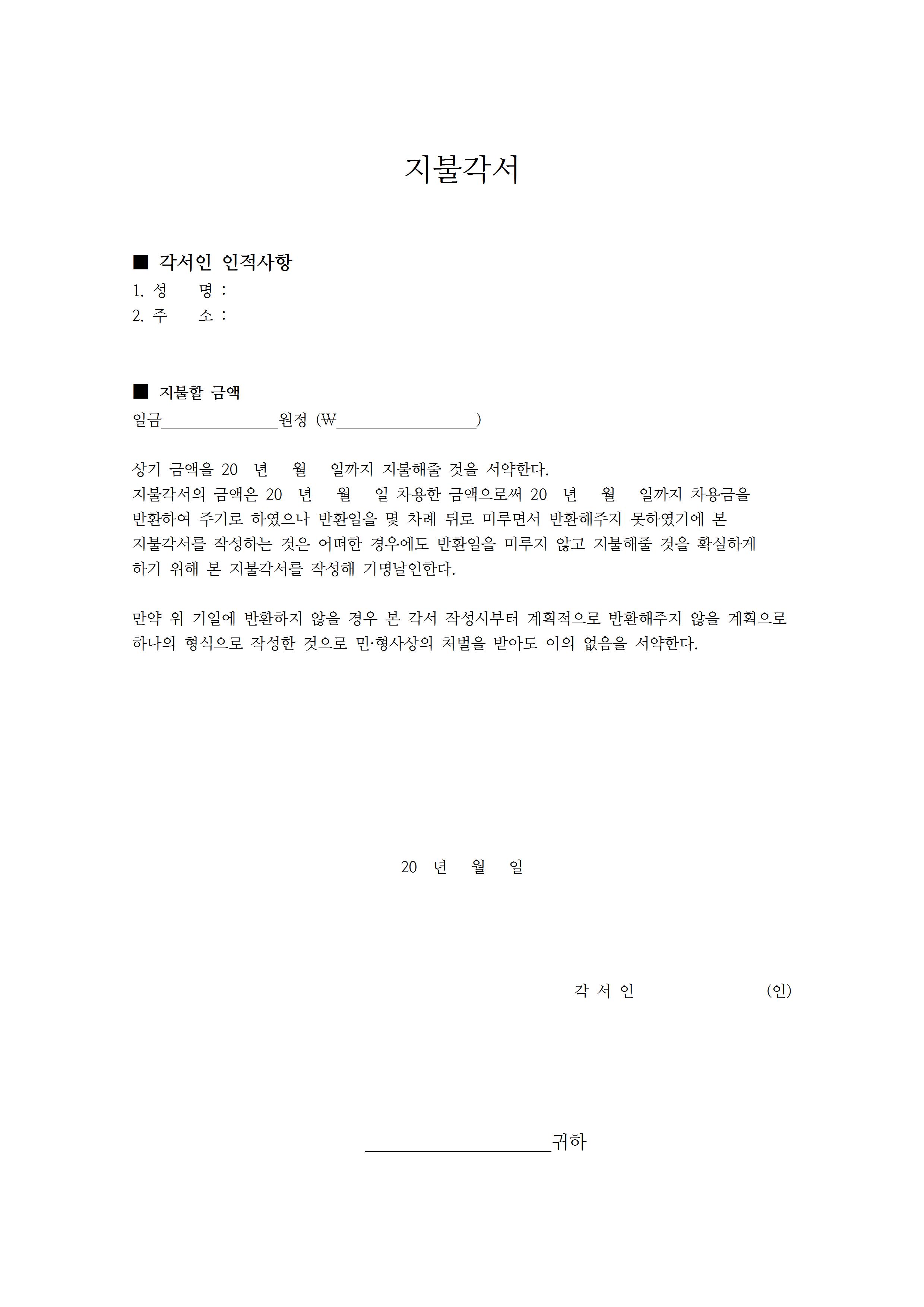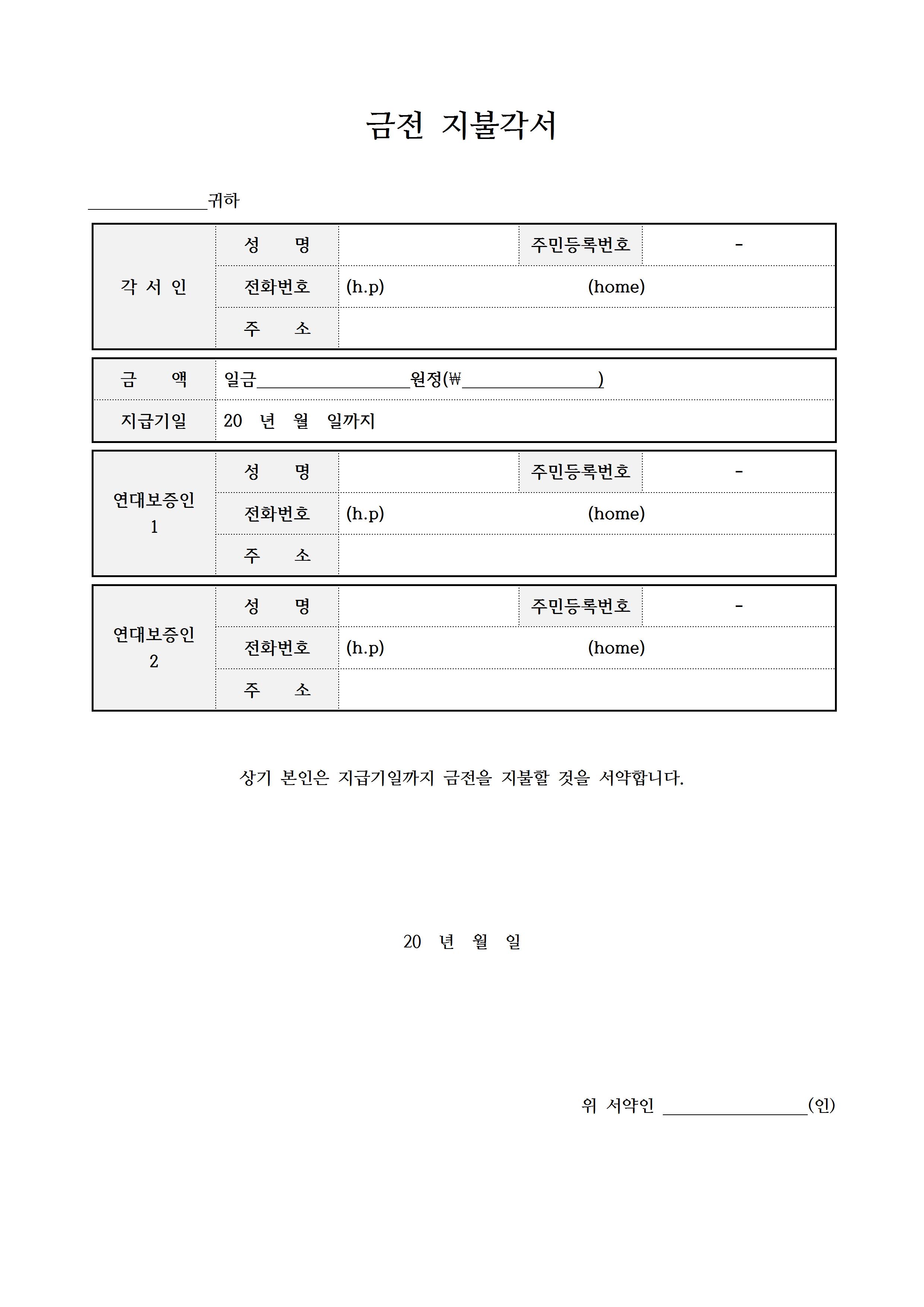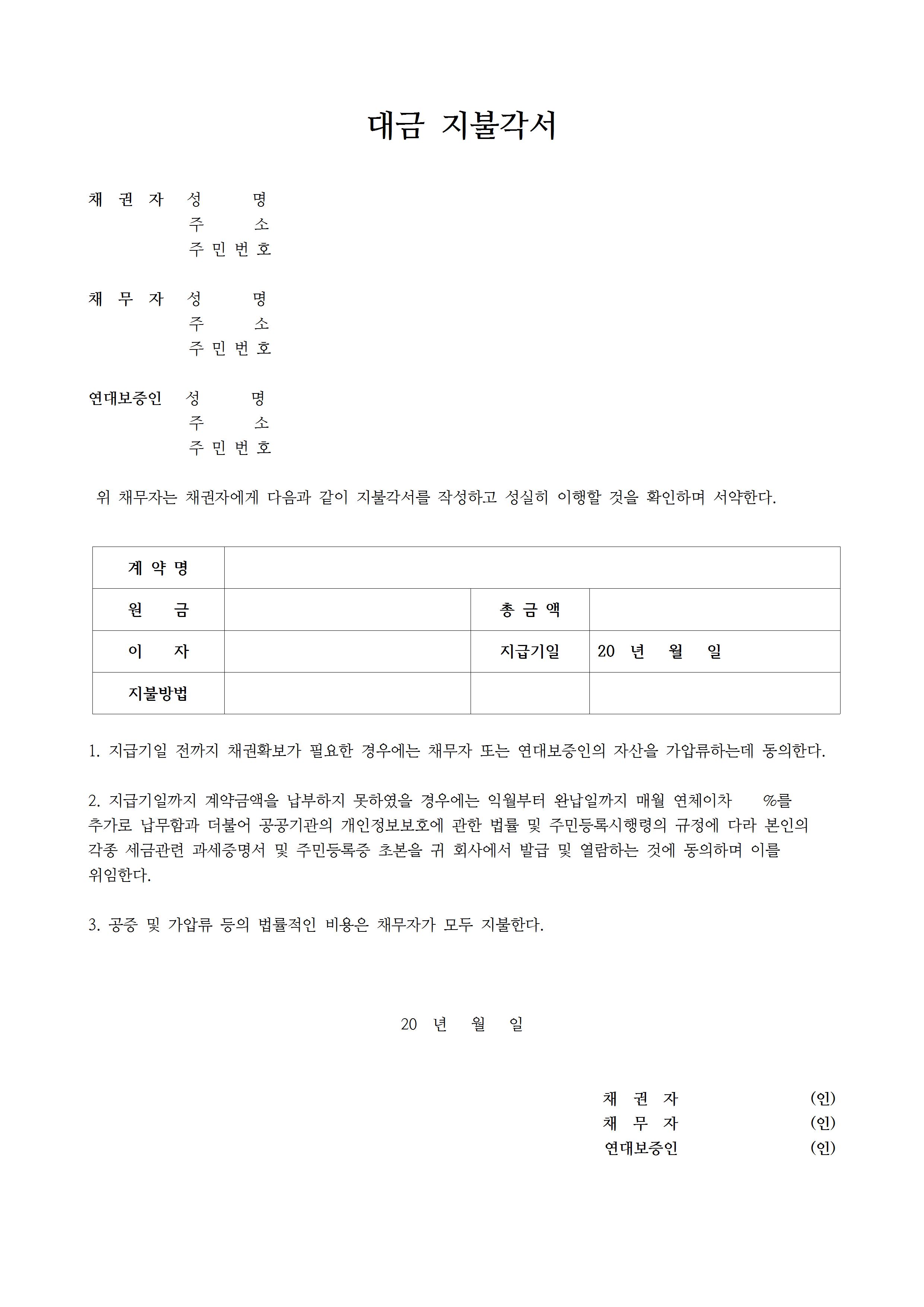 무료 다운로드가 가능한 금전 대금 채무 지불각서 양식 모음을 한글 hwp 파일로 첨부했습니다.