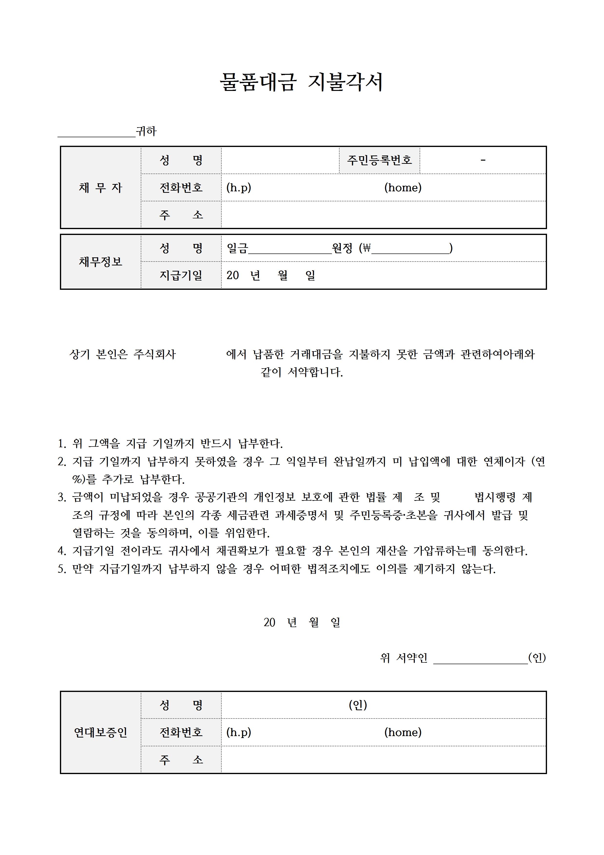 다음은 물품 대금지불각서 양식입니다. 마찬가지로 채무자와 채무정보에 대한 인적사항과 정보들을 기재할 수 있습니다. 납품한 물품에 대한 거래대금을 완납일까지 지불하겠다는 내용을 담은 양식입니다. 지급 기일까지 납부를 해야 한다는 내용과 지급해야 할 기일까지 납부를 하지 못했을 경우에는 그 익일부터 완납일까지 연체이자를 추가로 납부를 한다는 내용 등이 작성되어 있으며, 연대보증인에 대한 인적사항은 제일 하단에 기재할 수 있는 서식입니다.