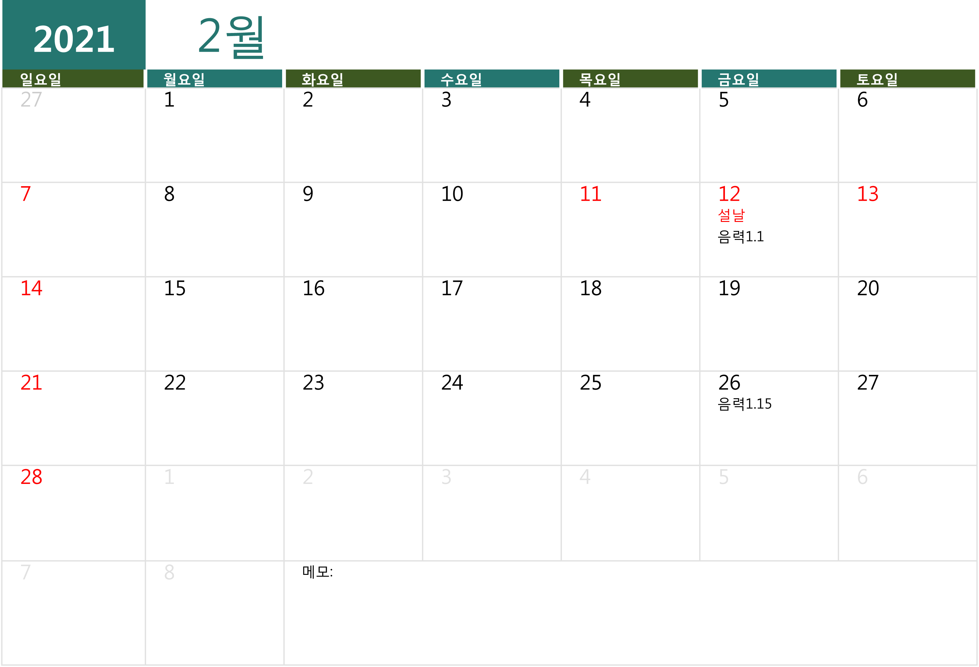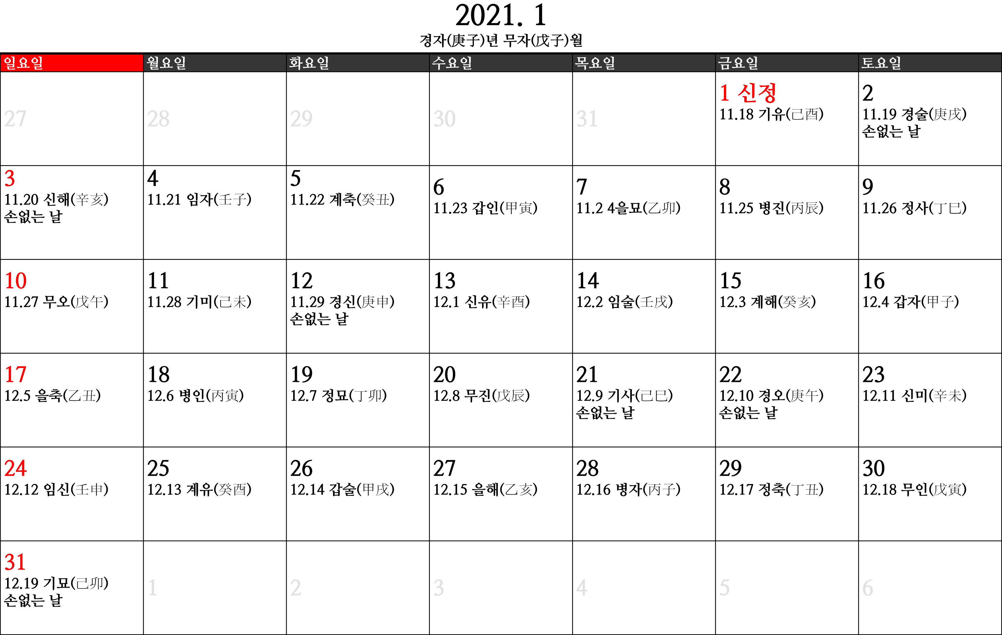 2021년 2월은 대망의 설날 연휴가 있는 달입니다. 11일부터 설날 연휴가 시작이 되고요. 음력 1월1일이 양력으로 12일, 금요일이 설날이 됩니다.
