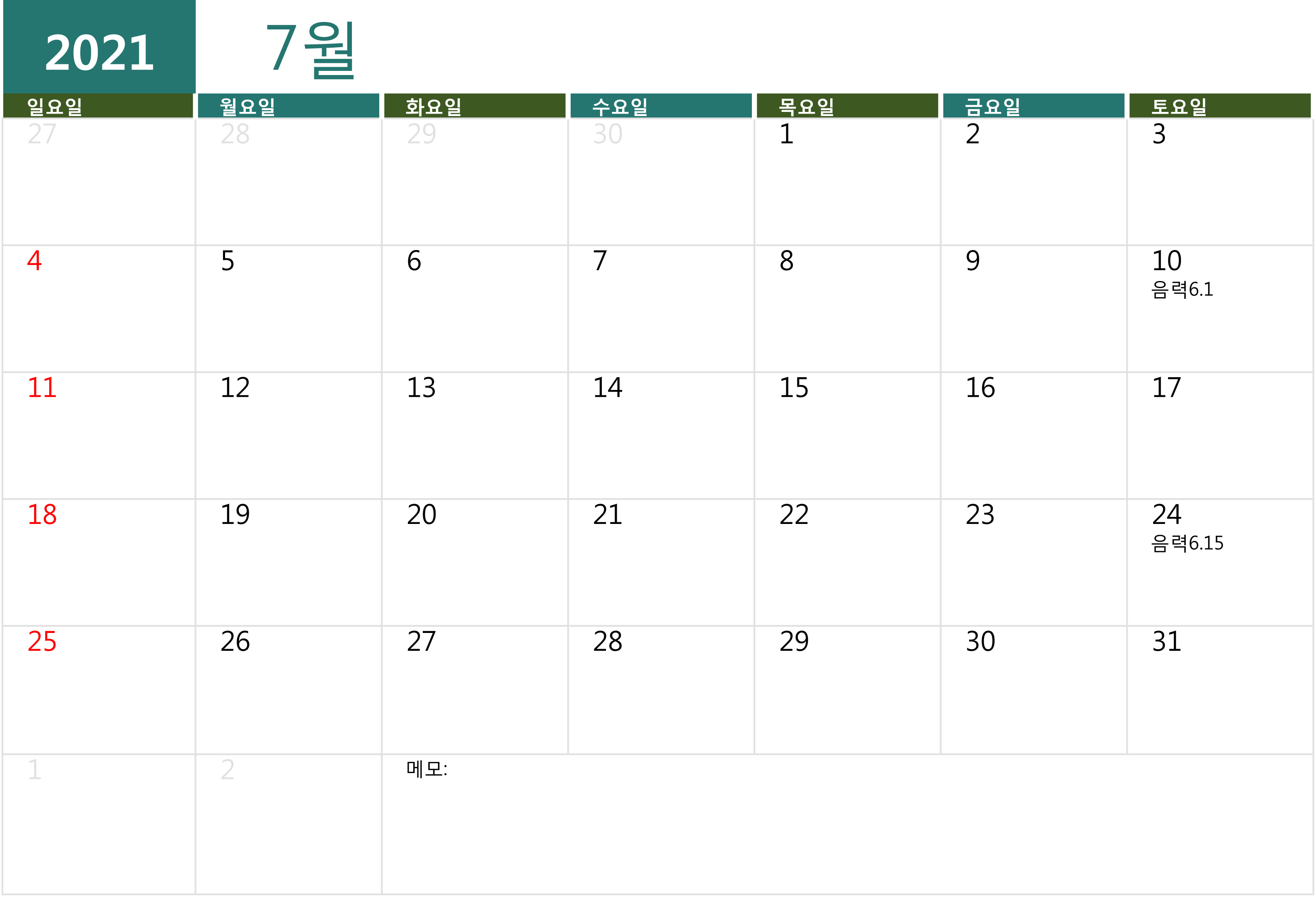 7월은 목요일부터 1일이 시작이 되고요. 말일이 31일 토요일입니다.