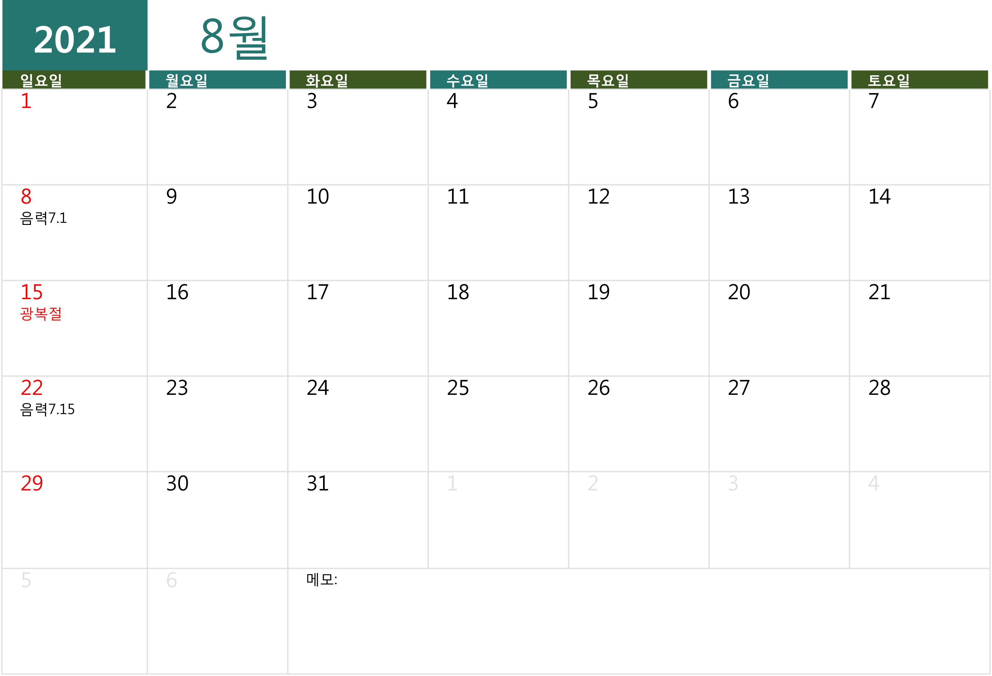 8월 15일 광복절도 일요일입니다. 1일부터 31일까지 있네요.