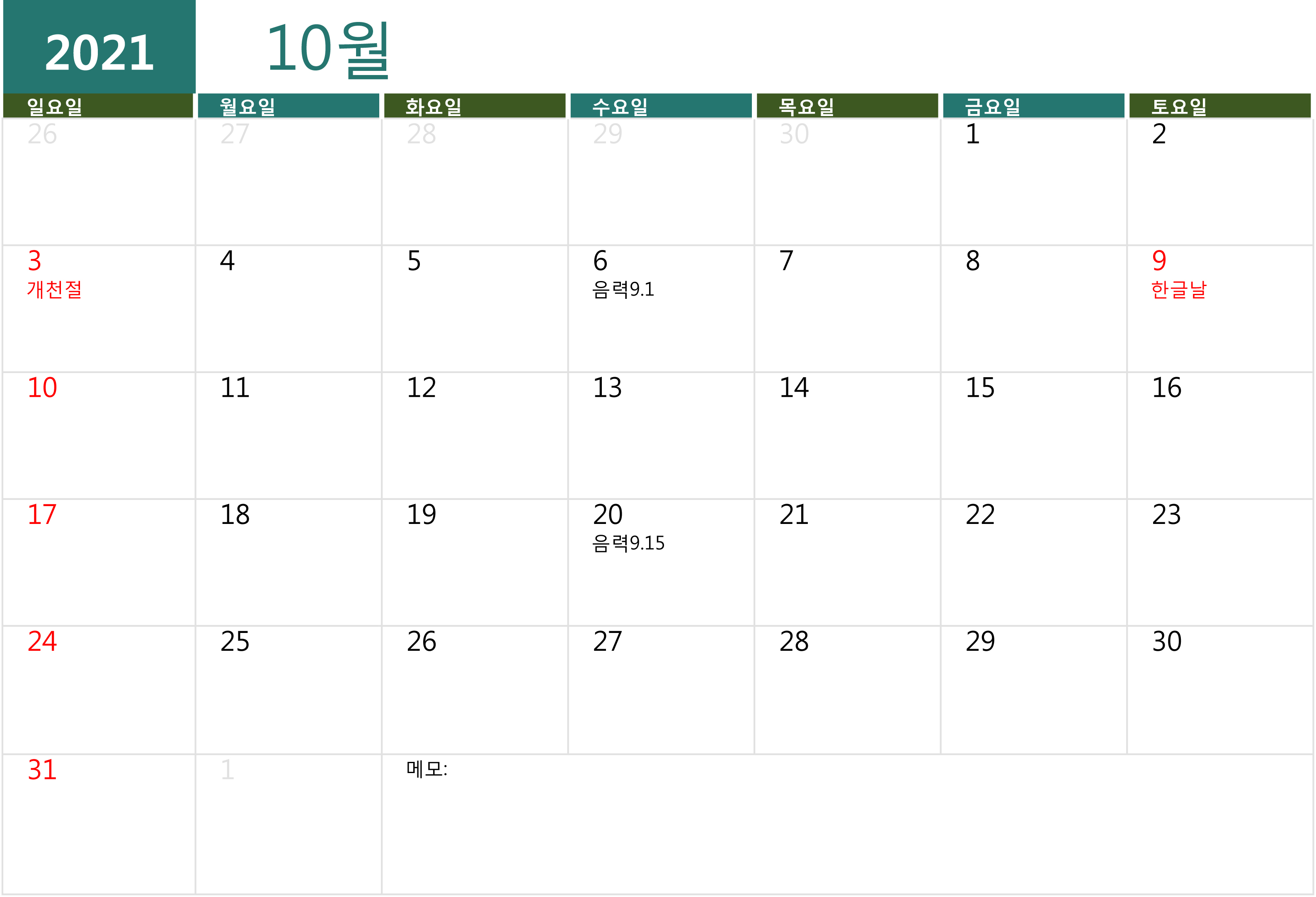10월은 9일 한글날이 토요일에 있고요. 3일 개천절이 일요일로 되어 있습니다. 공휴일이 이틀이지만 모두 토요일과 일요일, 주말로 잡혀있는 날이네요.