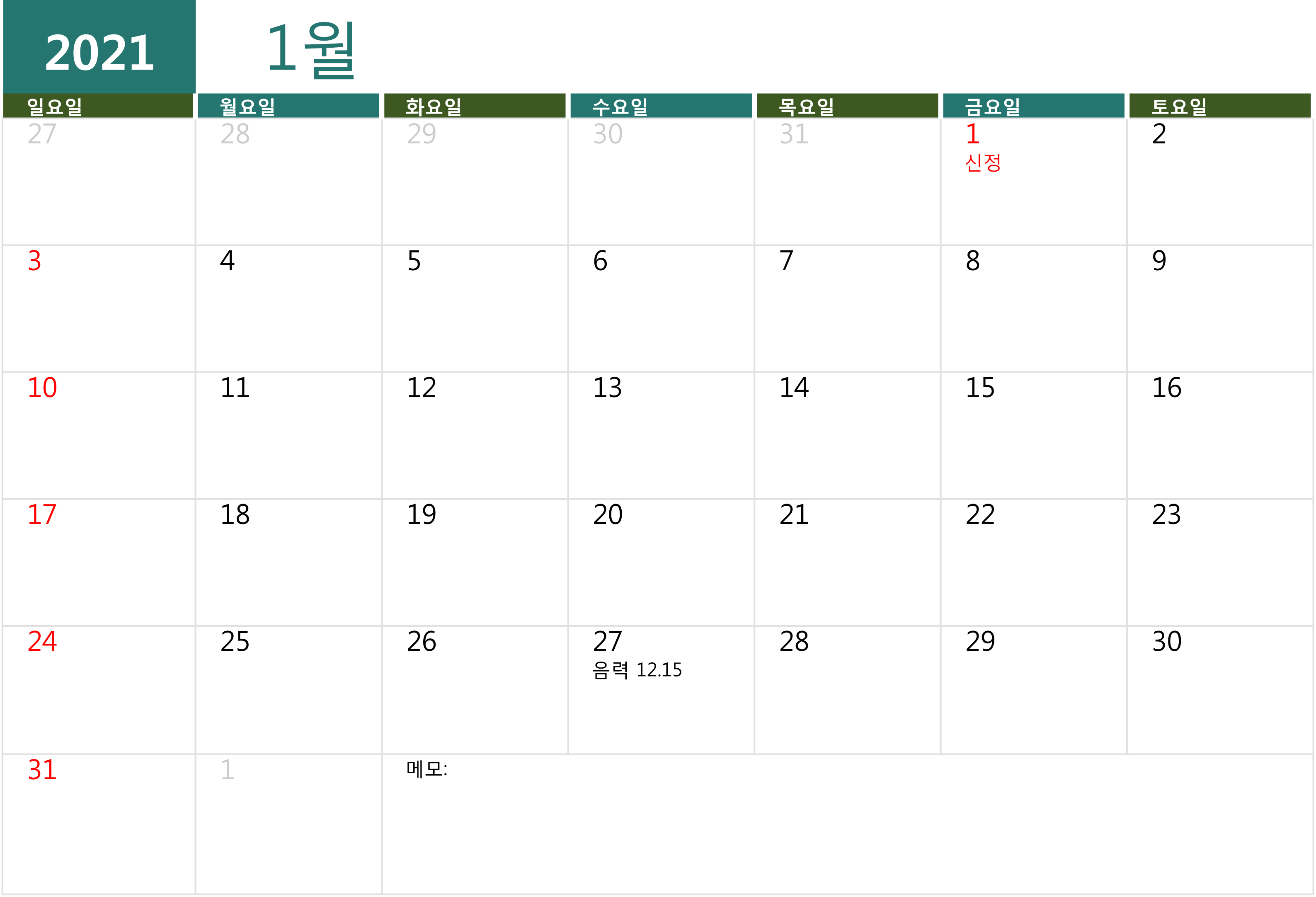 또한 앞전에 시골집이나 고향집에 붙어있었던 달력의 느낌을 참조하여 만들어본 2021년 아날로그 달력입니다. 디자인이 예쁘게 들어가있는 달력보다 오히려 이런 느낌이 눈에 익숙하신 분들도 많이 계실 것 같네요. 마찬가지로 음력이 표기된 12 간지 달력이지만 동물 그림은 생략했습니다. 이렇게 오늘은 2021년 달력 다운 가능한 엑셀 파일들을 모음으로 첨부를 해봤습니다. 개인용 또는 가정용이나 사무용 등 개인 활용 용도로만 활용해주시고 재배포는 금하며 댓글과 공감은 저에게 큰 힘이 됩니다.