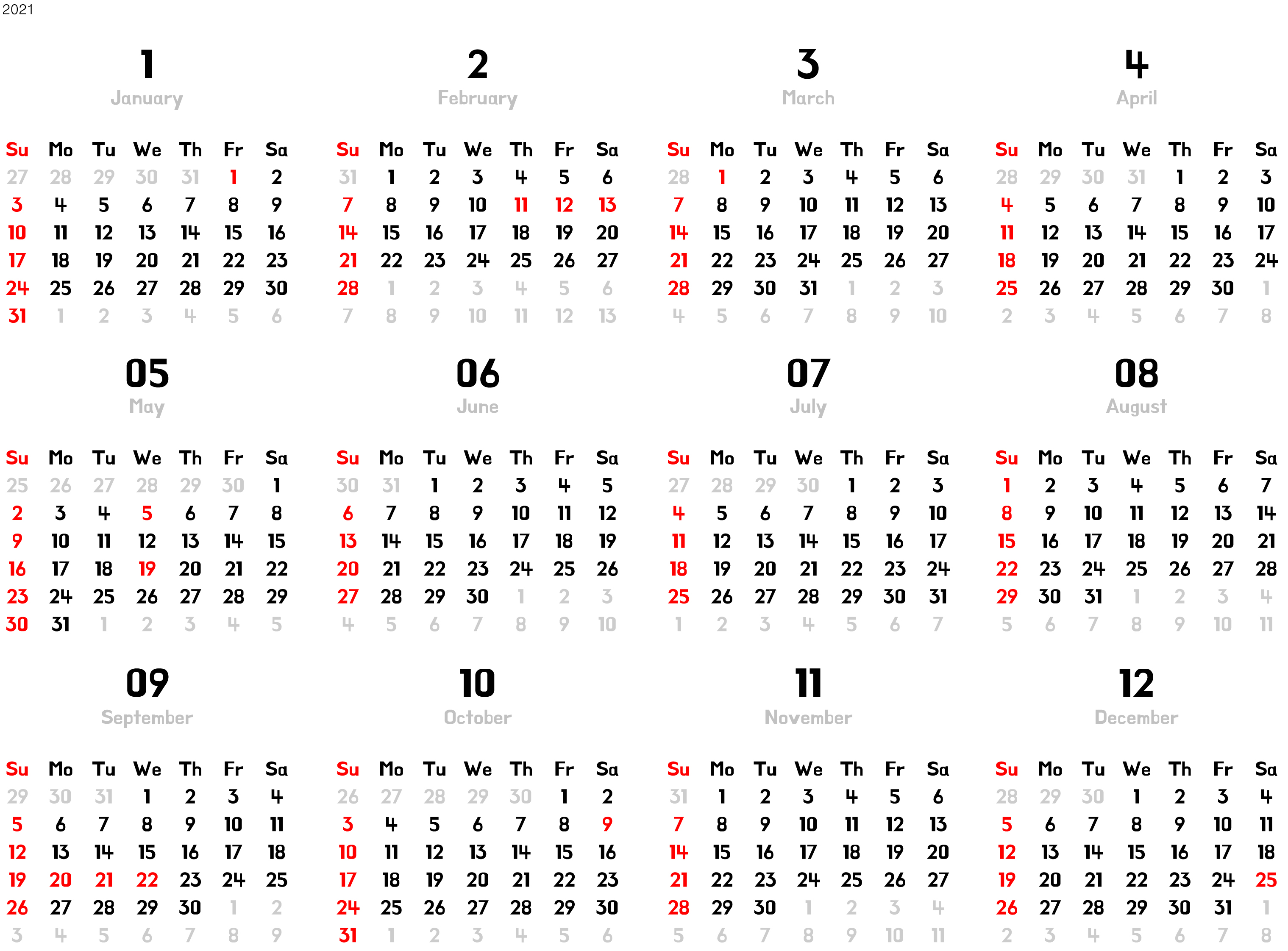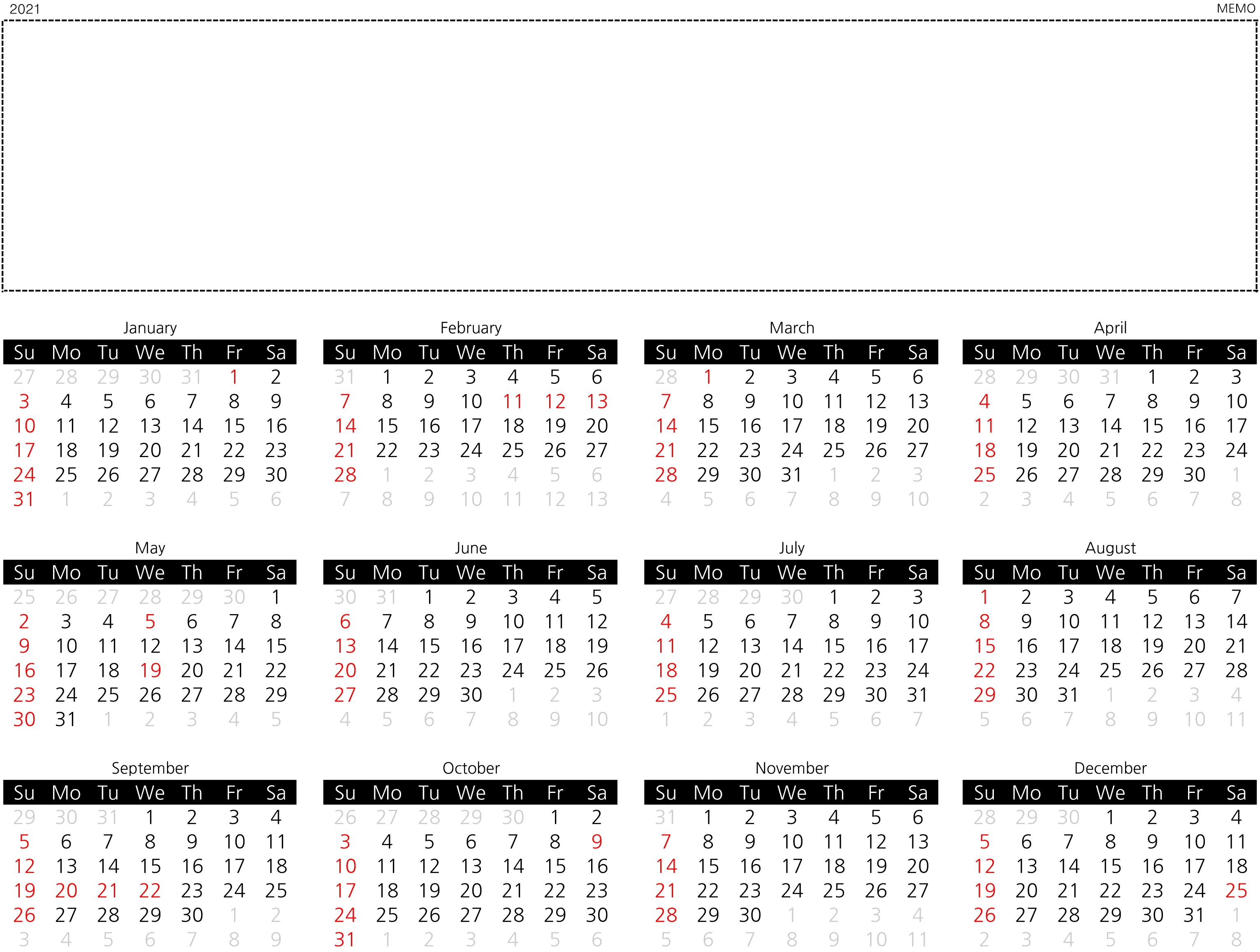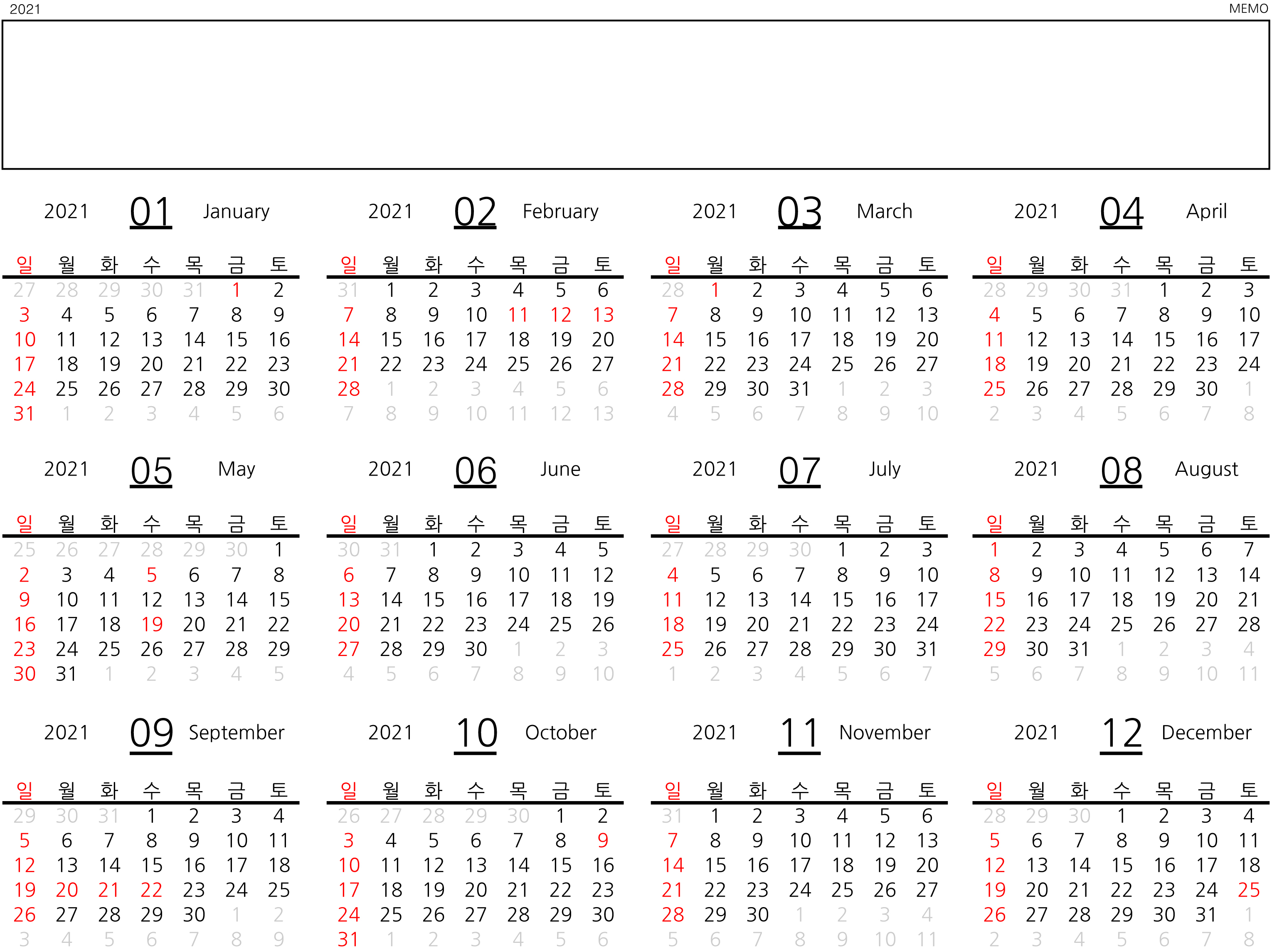 우선 모든 달력은 국가공휴일에 빨간색으로 체크를 했습니다. 상단부에 메모란이 있고요. 전월 달과 다음달이 이어지는 날짜는 옅은 회색으로 표기를 했습니다. 우선 아까 잠시 언급했었던 총 6개의 시트 중에 첫 번째 시트의 달력의 모습이고요. 1월부터 2월, 3월, 4월, 5월, 6월, 7월, 8월과 9월, 10월, 11월 및 12월까지 총 12개의 달이 한 장으로 제작이 되어있습니다.