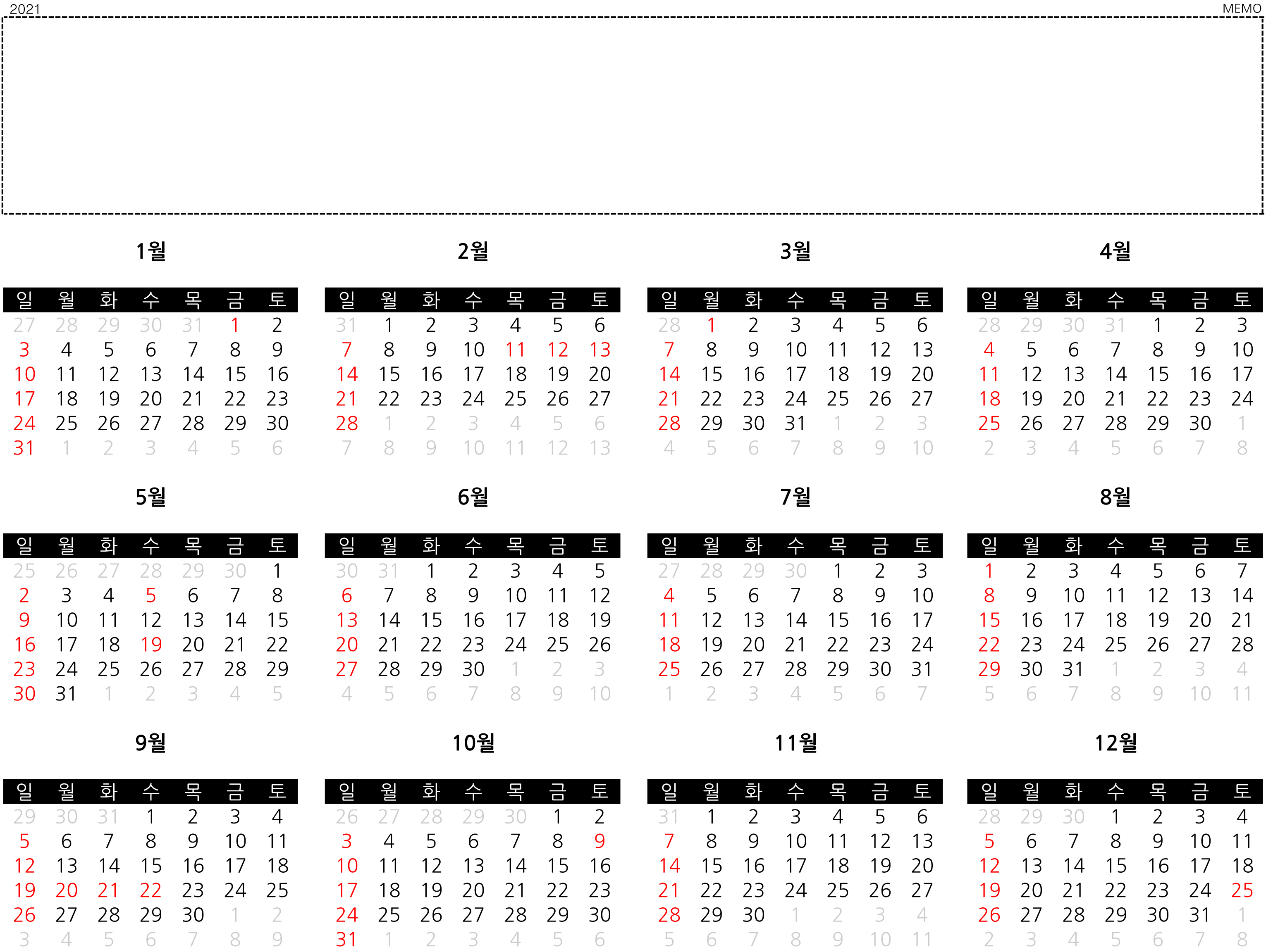 조금 더 깔끔한 달력을 선호하신다면 검은색 띠만 선으로 표기되어 있는 달력도 적합할 것 같네요. 1월부터 12월까지 마찬가지로 한 화면, A4 한 장으로 모두 표기가 되어있으며 요일은 모두 한글로 되어있습니다.