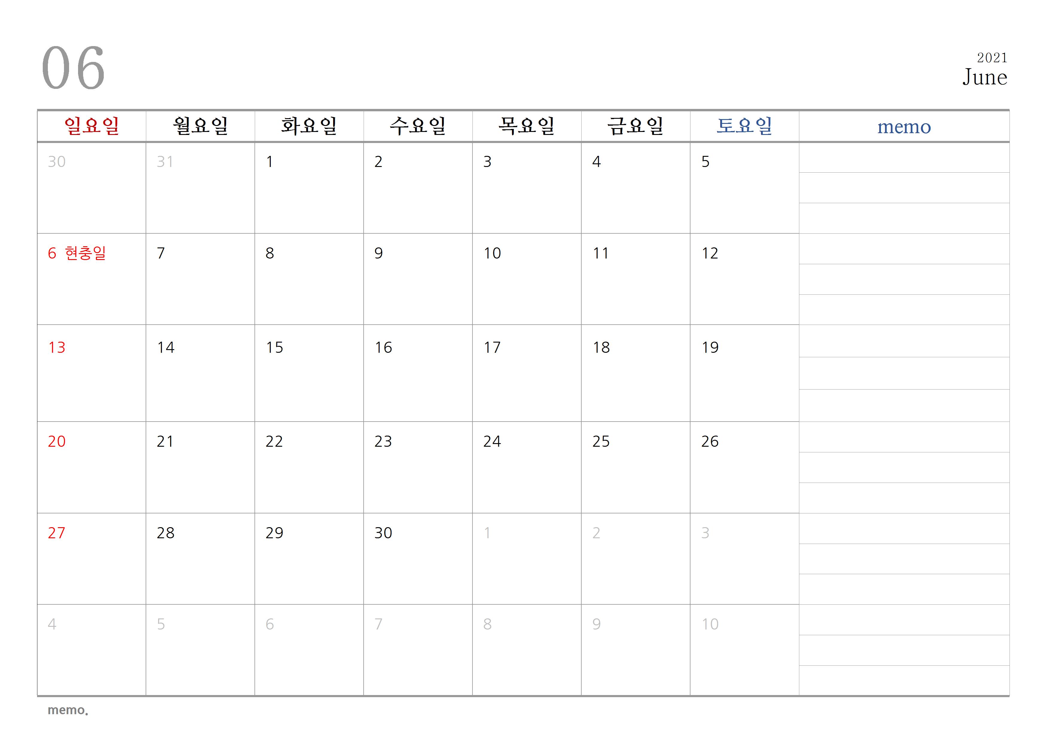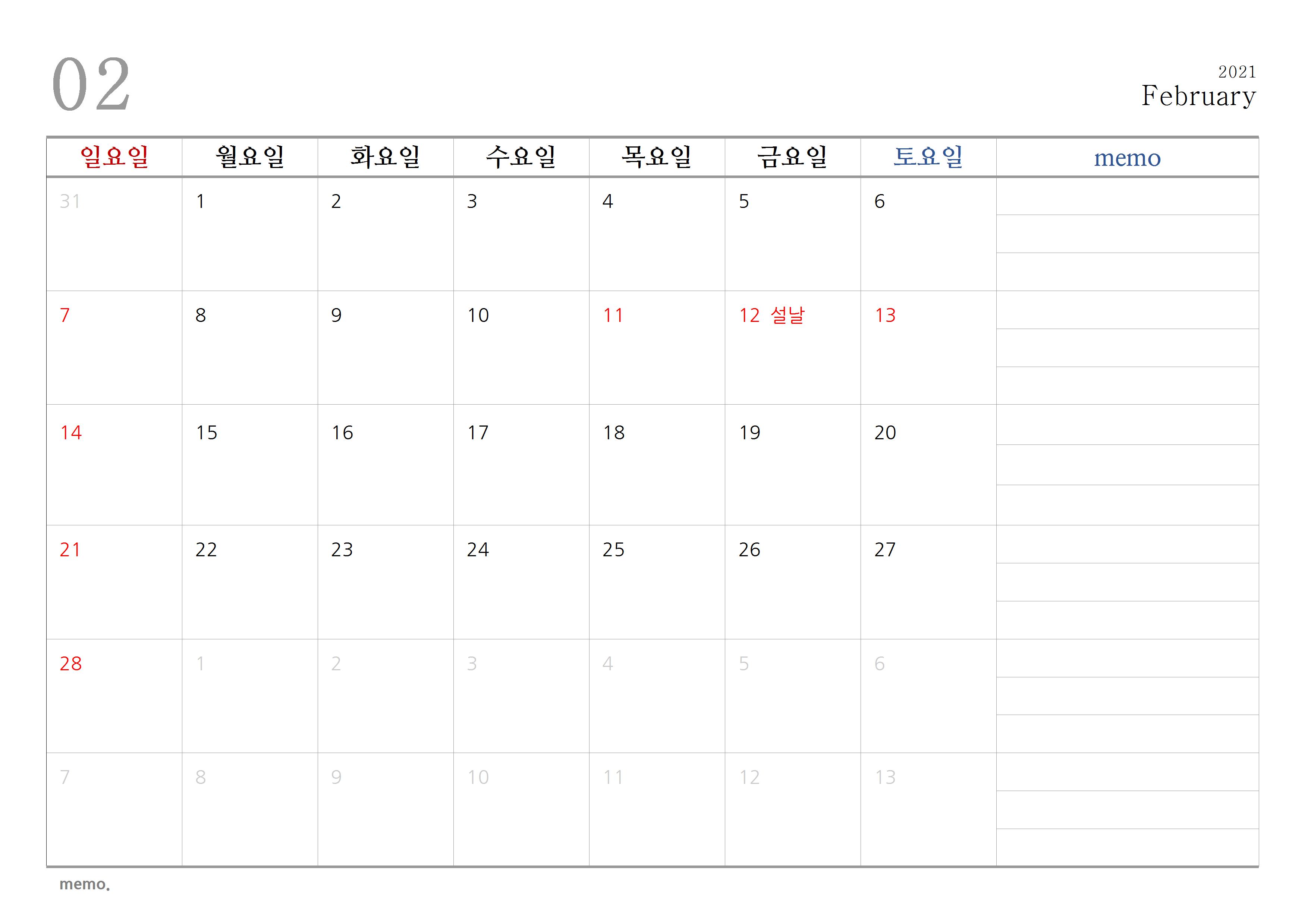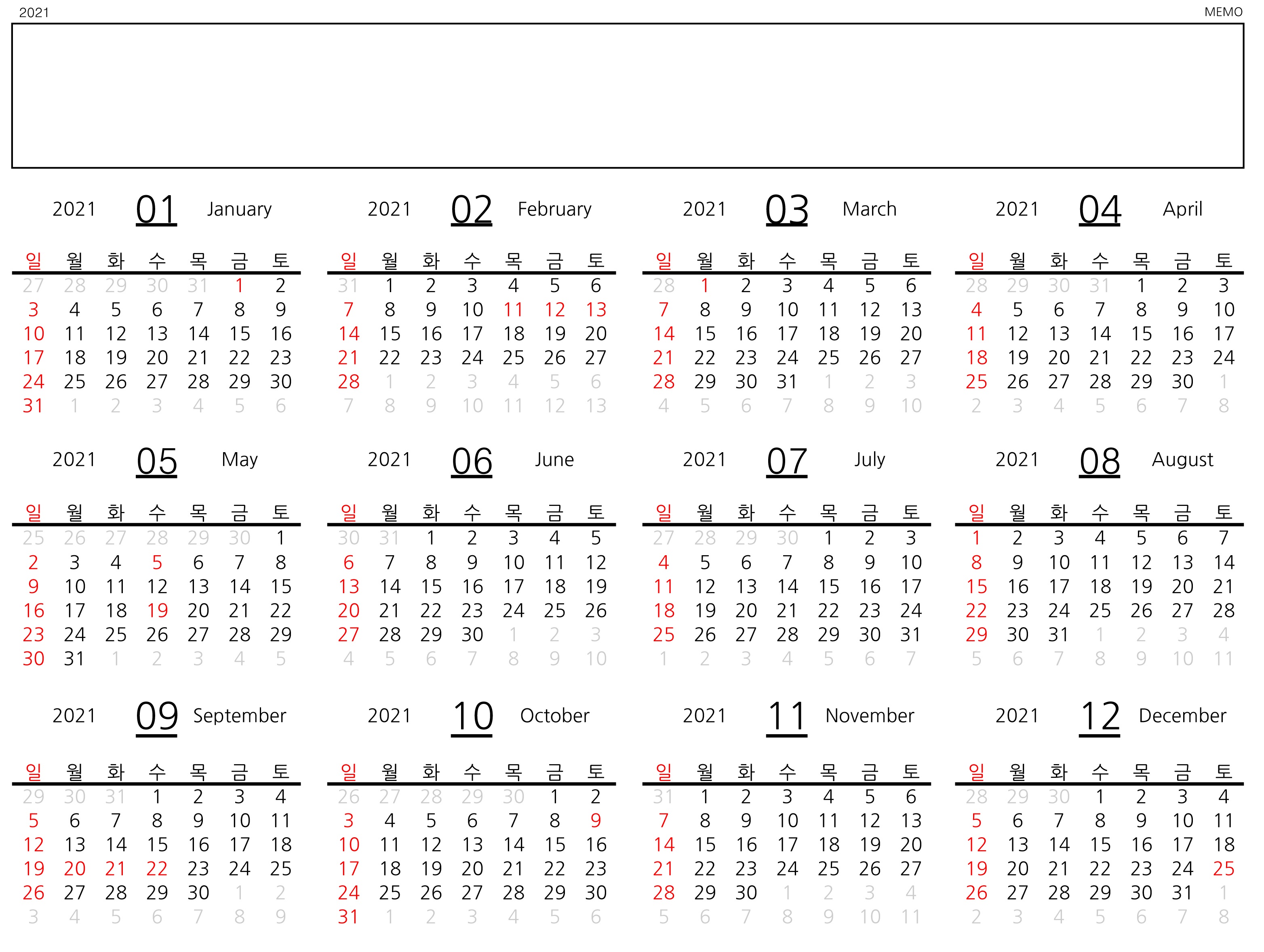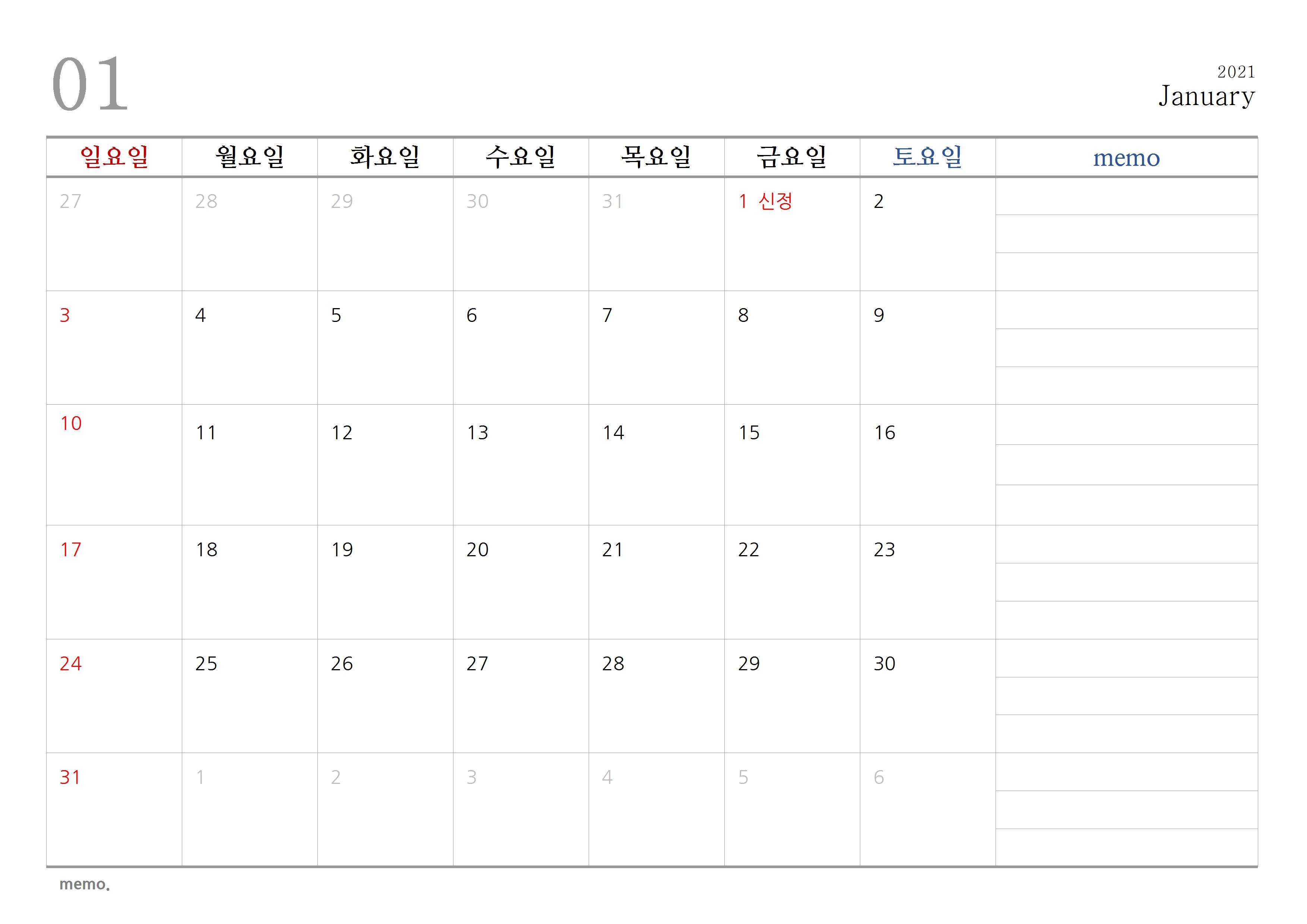 다음 달력은 일요일, 월요일, 화요일, 수요일, 목요일, 금요일, 토요일 순으로 요일의 명칭을 한글로 수정하였으며, 오른쪽에 메모란을 별도로 만들어 더욱 더 다양한 사항들을 기입할 수 있는 달력입니다. 디자인이나 전체적인 서식 느낌과 구성은 처음에 봤던 2021년 달력 한글파일 양식과 동일하지만 메모란과 요일 입력란만 다르다고 생각하시면 되겠네요. 마찬가지로 1월부터 2월, 3월, 4월, 5월, 6월 그리고 7월, 8월, 9월과 10월, 11월, 12월까지 하나씩 살펴보도록 하죠.