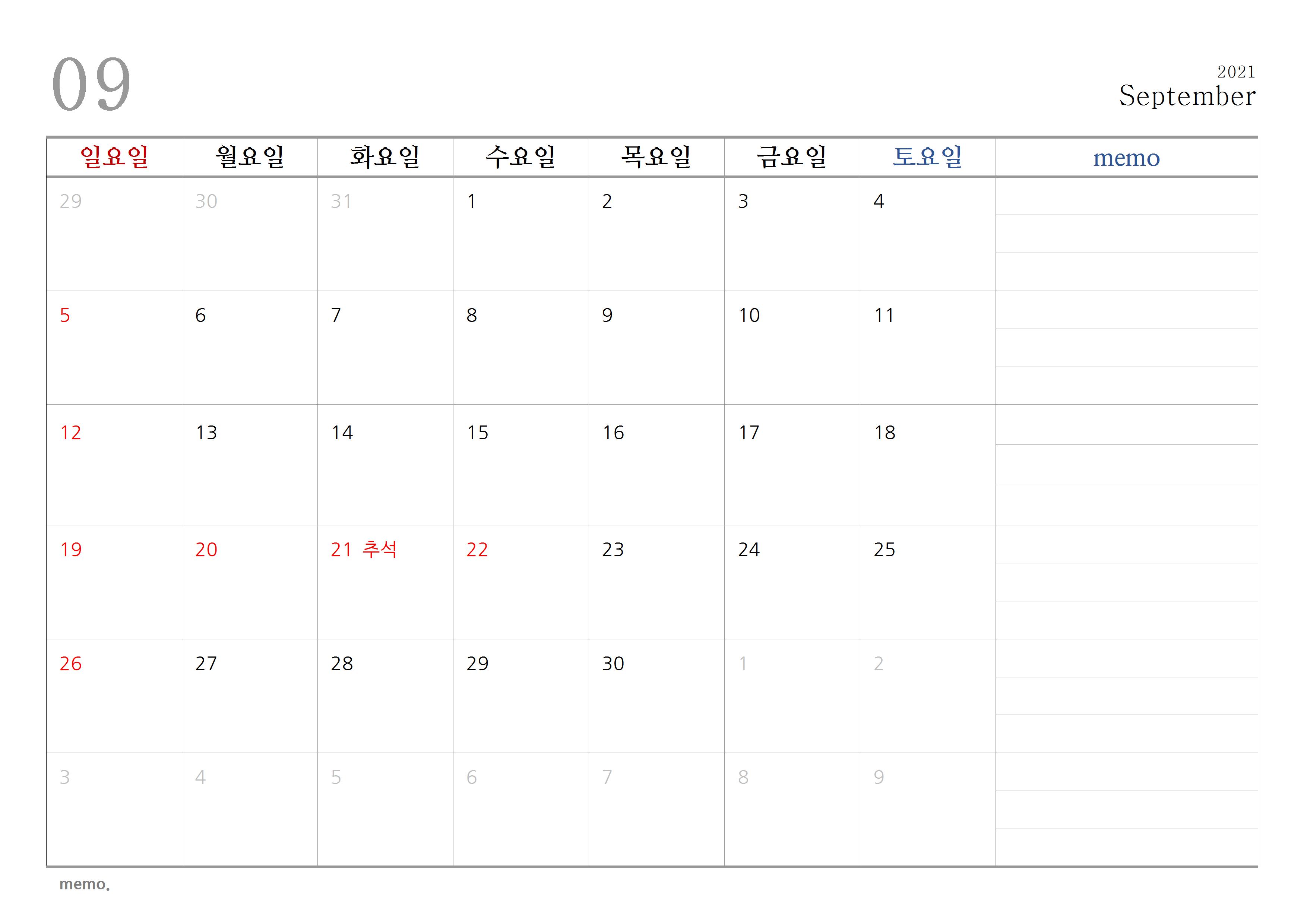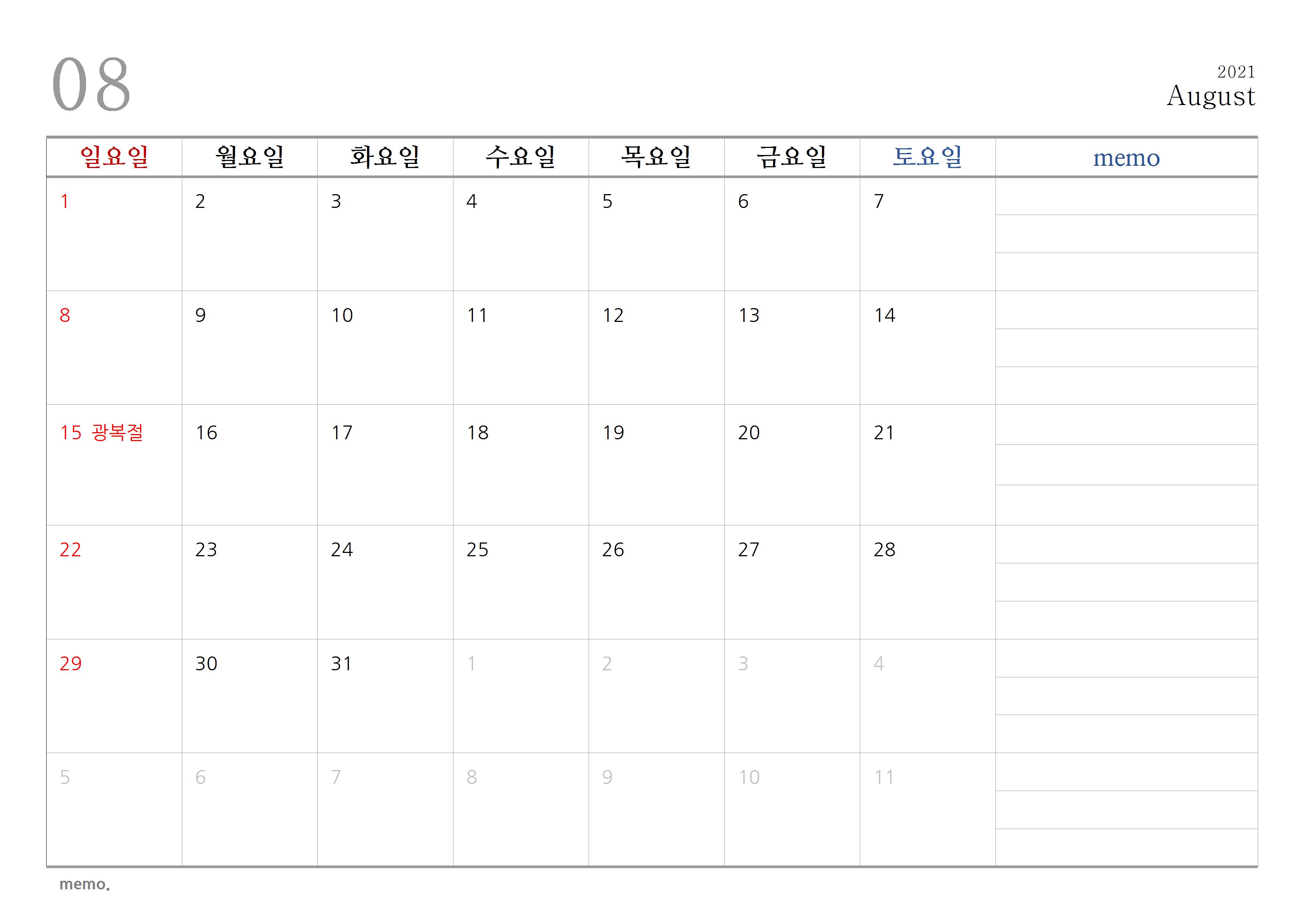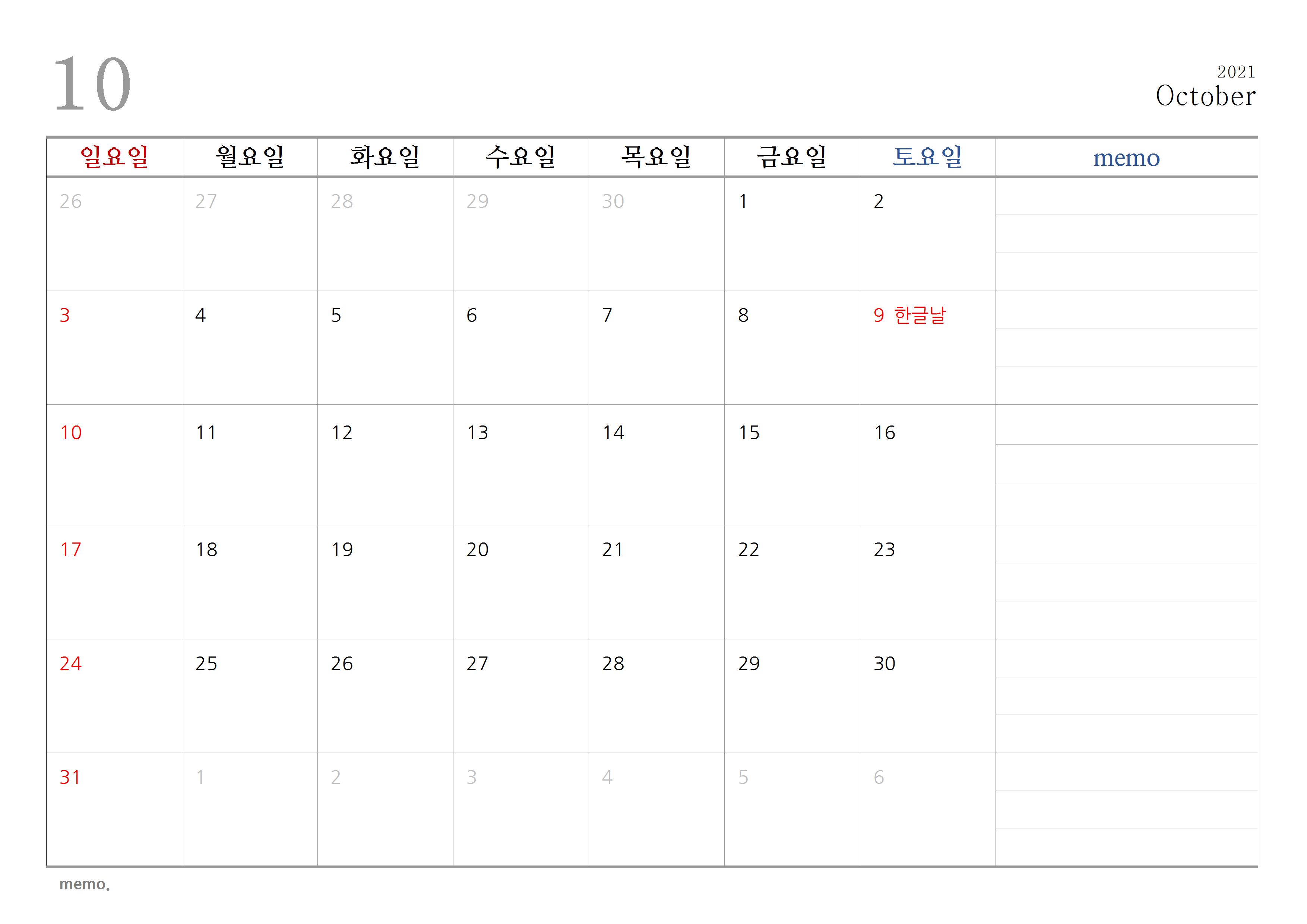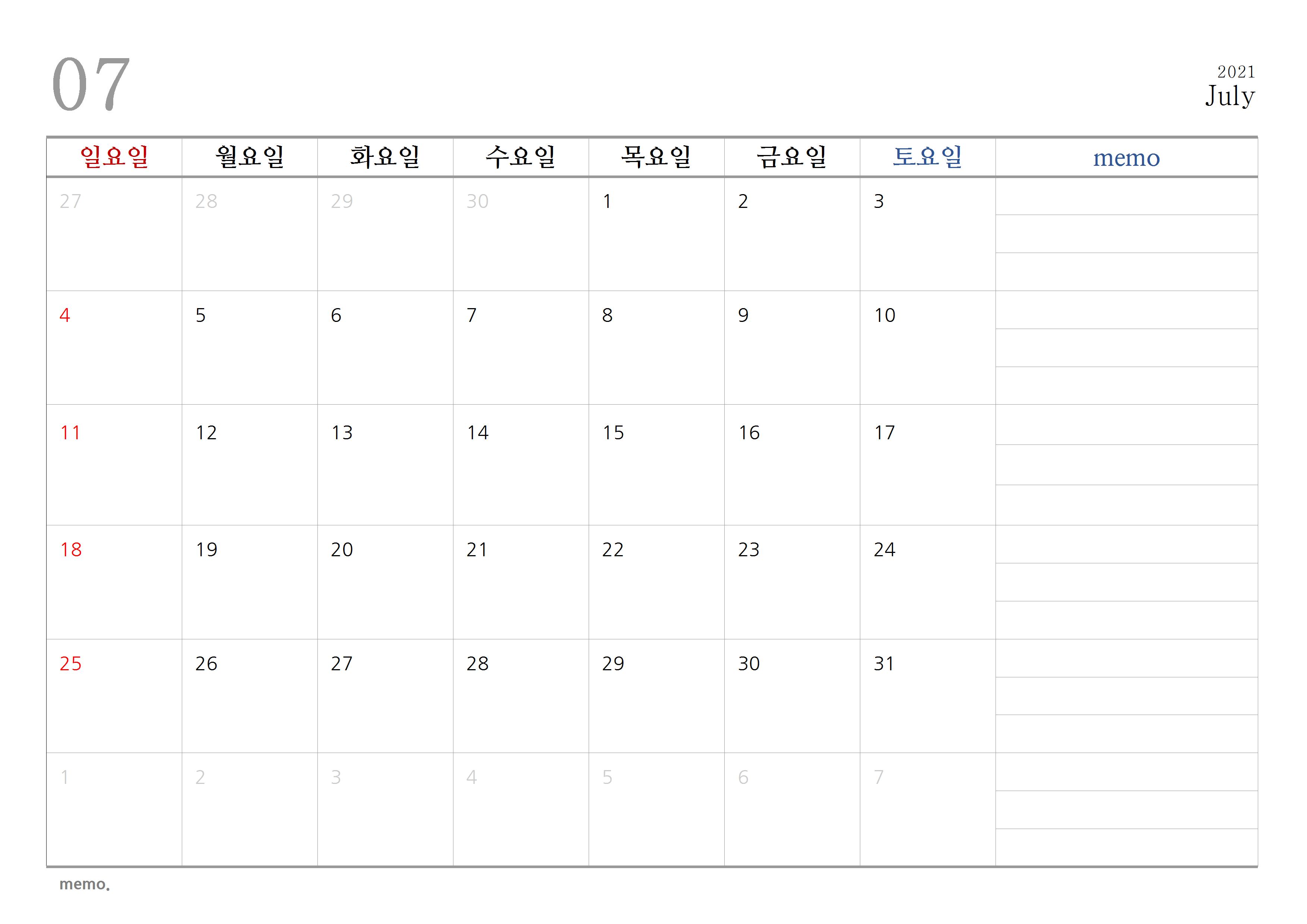 다음 달력은 일요일, 월요일, 화요일, 수요일, 목요일, 금요일, 토요일 순으로 요일의 명칭을 한글로 수정하였으며, 오른쪽에 메모란을 별도로 만들어 더욱 더 다양한 사항들을 기입할 수 있는 달력입니다. 디자인이나 전체적인 서식 느낌과 구성은 처음에 봤던 2021년 달력 한글파일 양식과 동일하지만 메모란과 요일 입력란만 다르다고 생각하시면 되겠네요. 마찬가지로 1월부터 2월, 3월, 4월, 5월, 6월 그리고 7월, 8월, 9월과 10월, 11월, 12월까지 하나씩 살펴보도록 하죠.