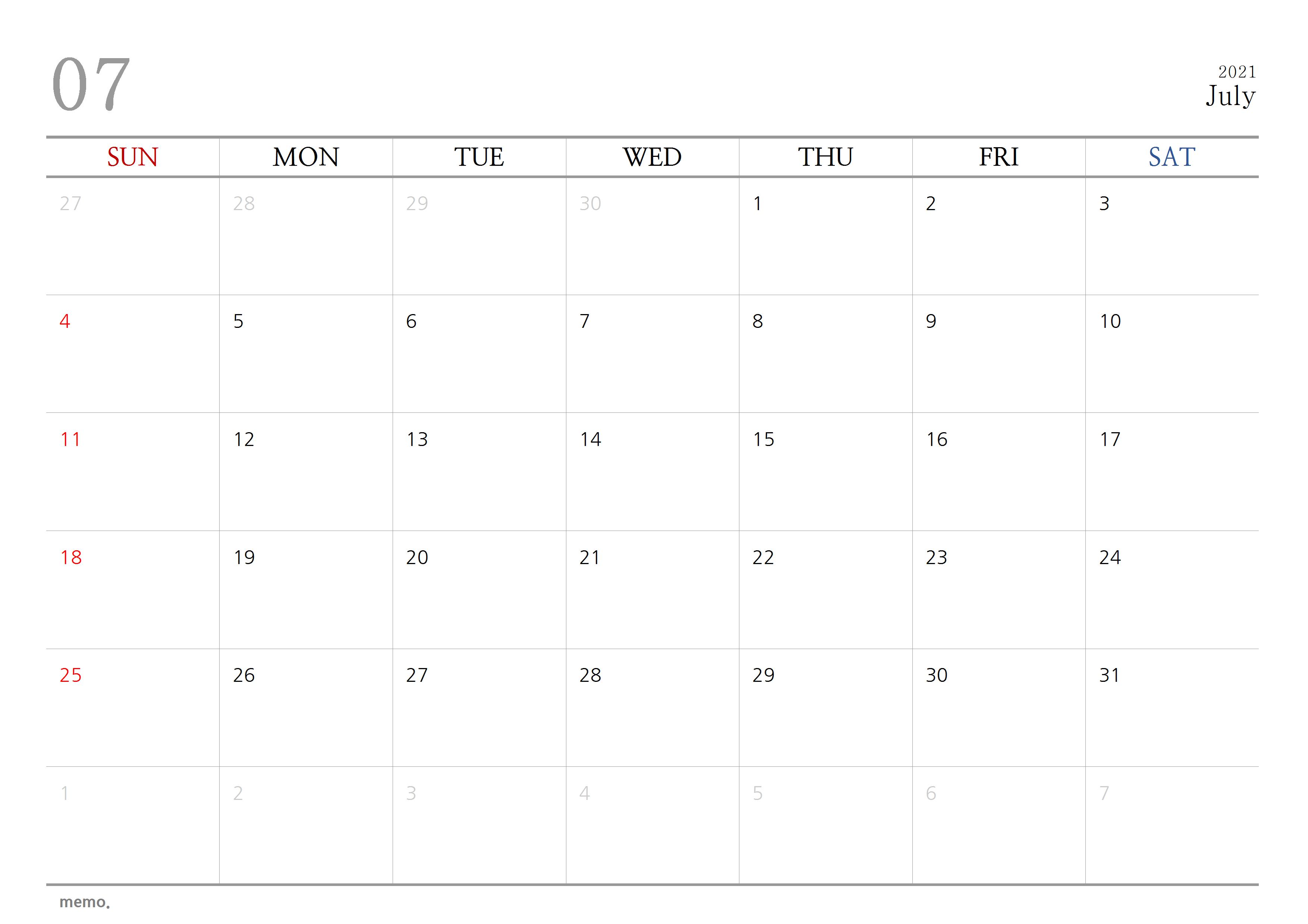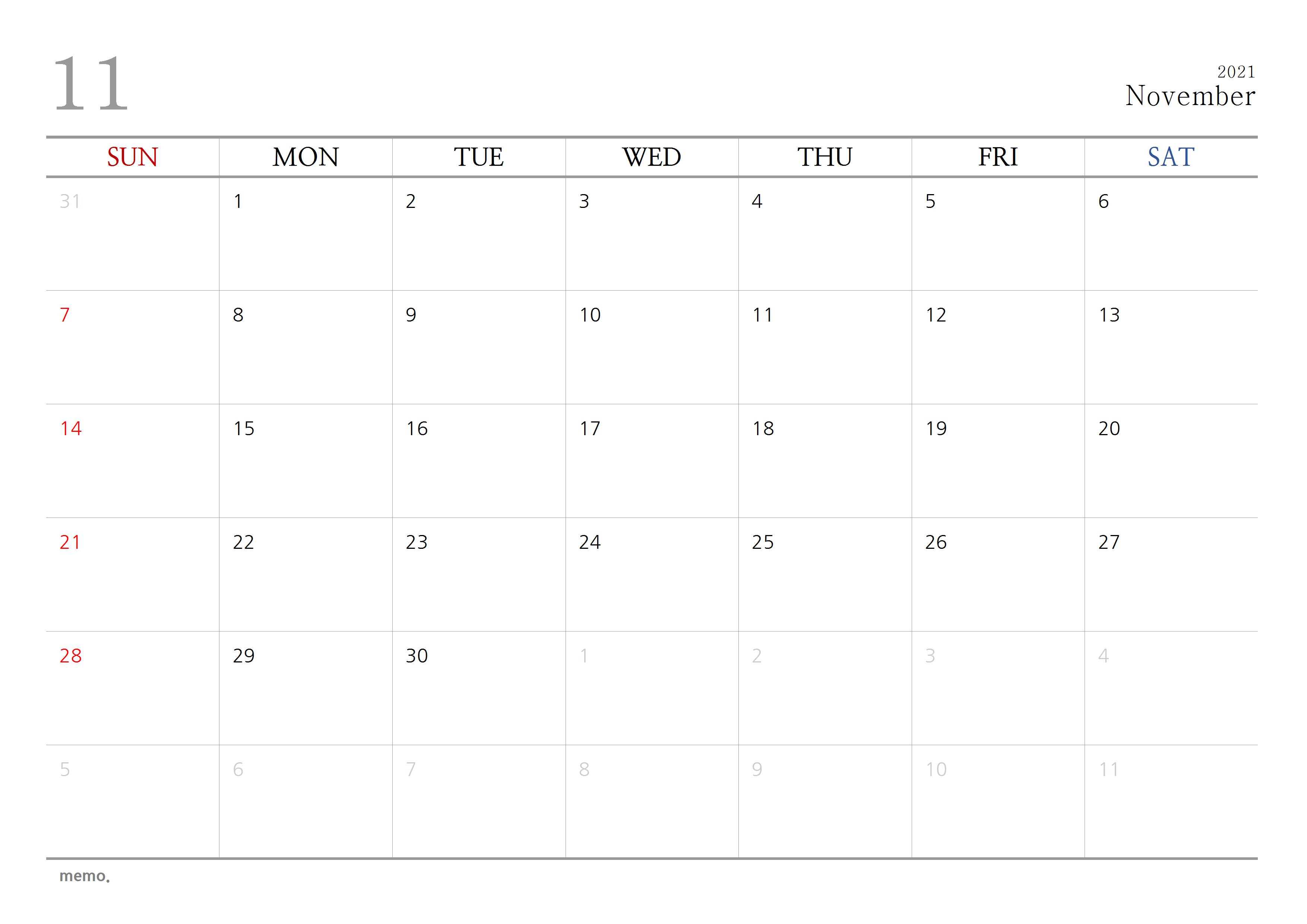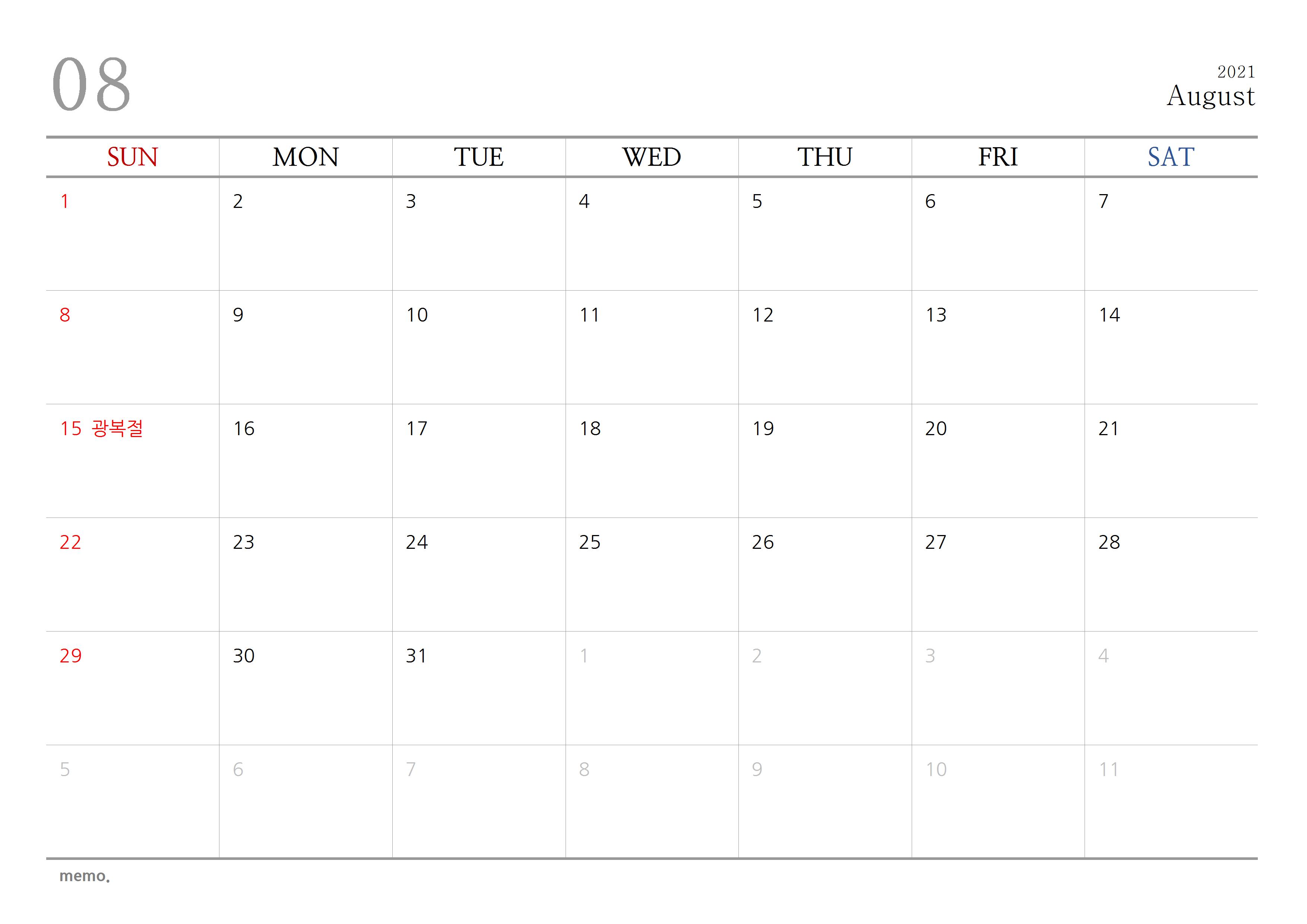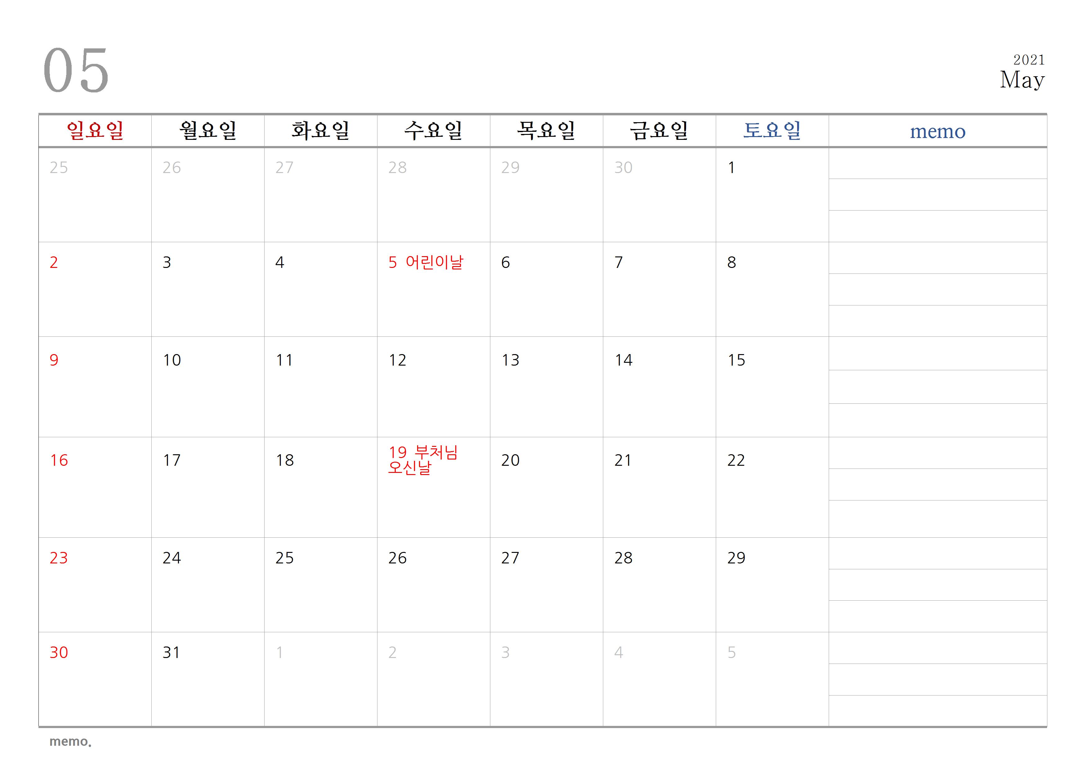 다음 달력은 일요일, 월요일, 화요일, 수요일, 목요일, 금요일, 토요일 순으로 요일의 명칭을 한글로 수정하였으며, 오른쪽에 메모란을 별도로 만들어 더욱 더 다양한 사항들을 기입할 수 있는 달력입니다. 디자인이나 전체적인 서식 느낌과 구성은 처음에 봤던 2021년 달력 한글파일 양식과 동일하지만 메모란과 요일 입력란만 다르다고 생각하시면 되겠네요. 마찬가지로 1월부터 2월, 3월, 4월, 5월, 6월 그리고 7월, 8월, 9월과 10월, 11월, 12월까지 하나씩 살펴보도록 하죠.