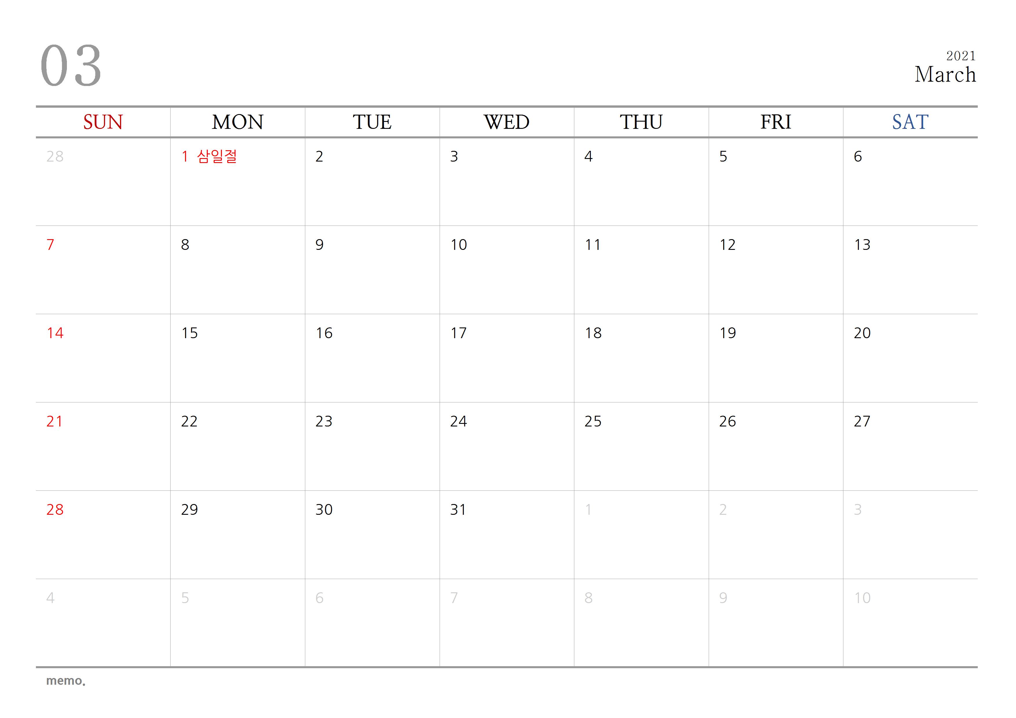 해당 2021년 달력 한글파일 이미지의 모습입니다. 우선 대체공휴일은 그 해의 정책에 따라서 달리질 수 있기 때문에 공식적인 국가공휴일만 빨간색으로 공휴일의 명칭을 기재를 했으며 나머지 구성은 모두 일반적인 달력 양식으로 제작되었습니다. 또한 달력 안에는 하단에 3~4줄 입력이 가능하며 개인 기념일이나 다니고 있는 직장의 행사 또는 개인적인 메모를 기재할 수 있습니다. 그럼 1월부터 12월까지 스크롤을 내려서 하나씩 감상을 해보도록 하죠.