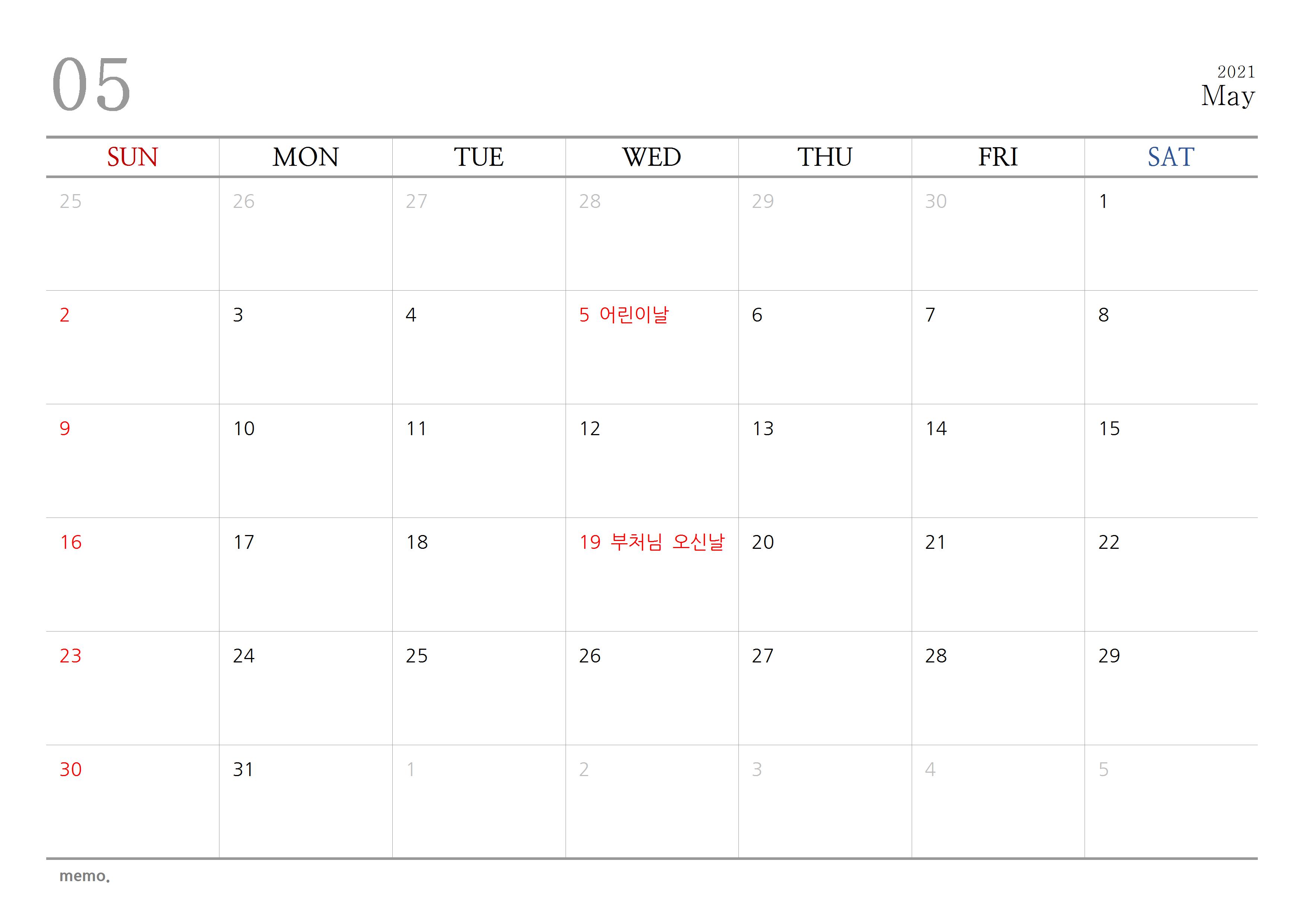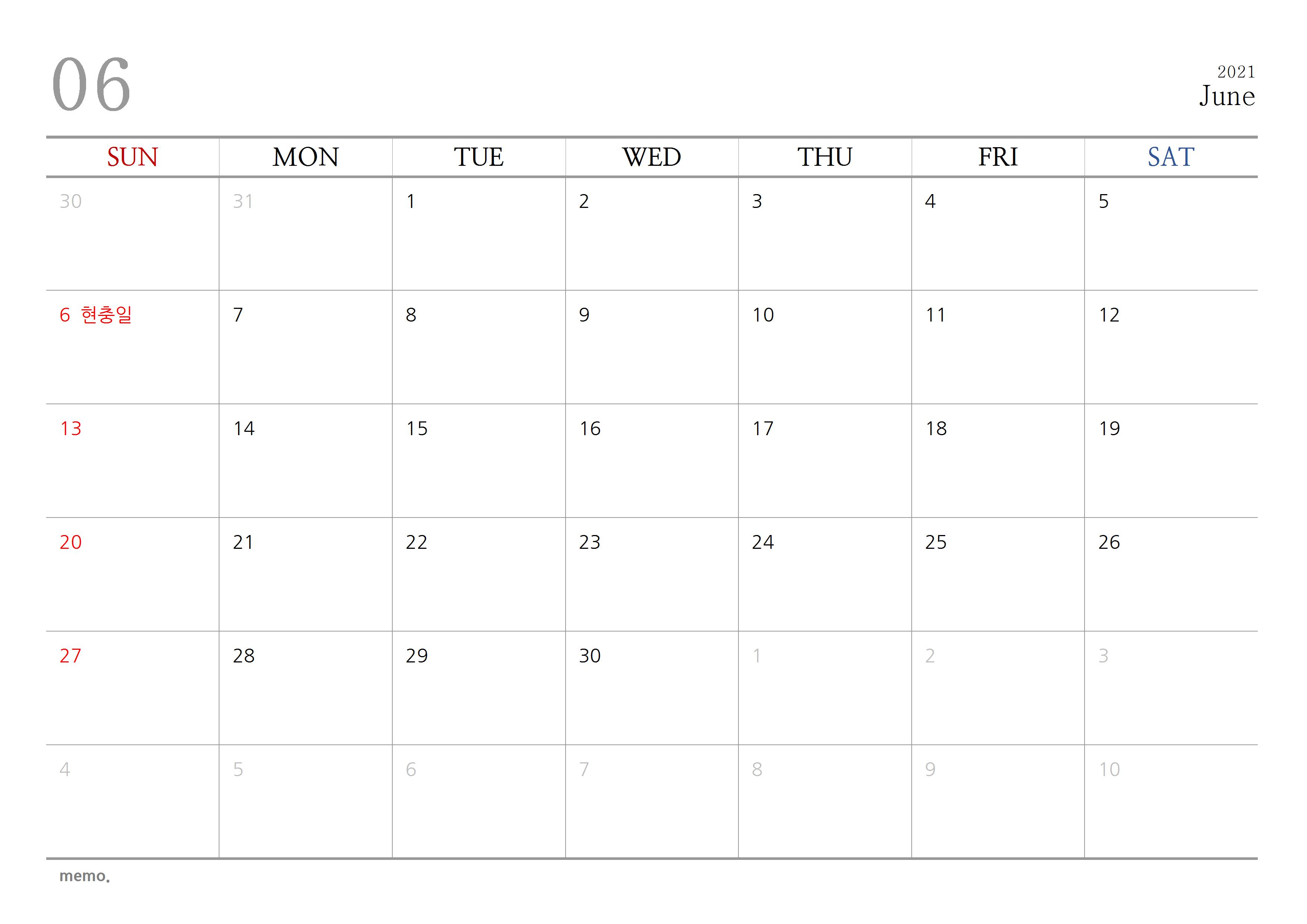 탁상달력이나 사무용 또는 가정용이나 개인용으로 프린트나 출력 또는 개인 메모 용도로 무난하게 사용할 수 있는 무료 다운로드가 가능한 2021년 달력을 hwp 한글 파일 양식으로 첨부를 했습니다. 디자인이 너무 화려하게 들어가 있는 달력은 아무래도 보기에도 복잡하고 예쁘게 꾸며졌다고 한들 지저분한 느낌이 드는 경우도 있기 때문에 이번에는 최대한 깔끔한 양식의 느낌으로 만들어봤는데요.