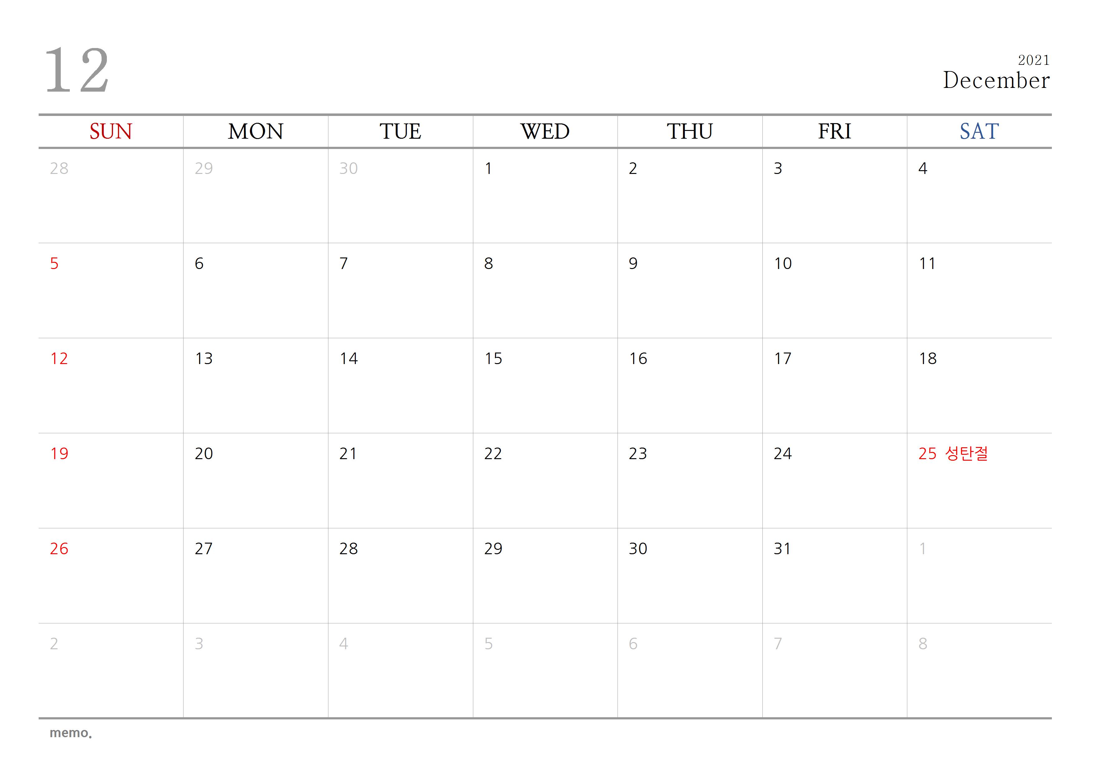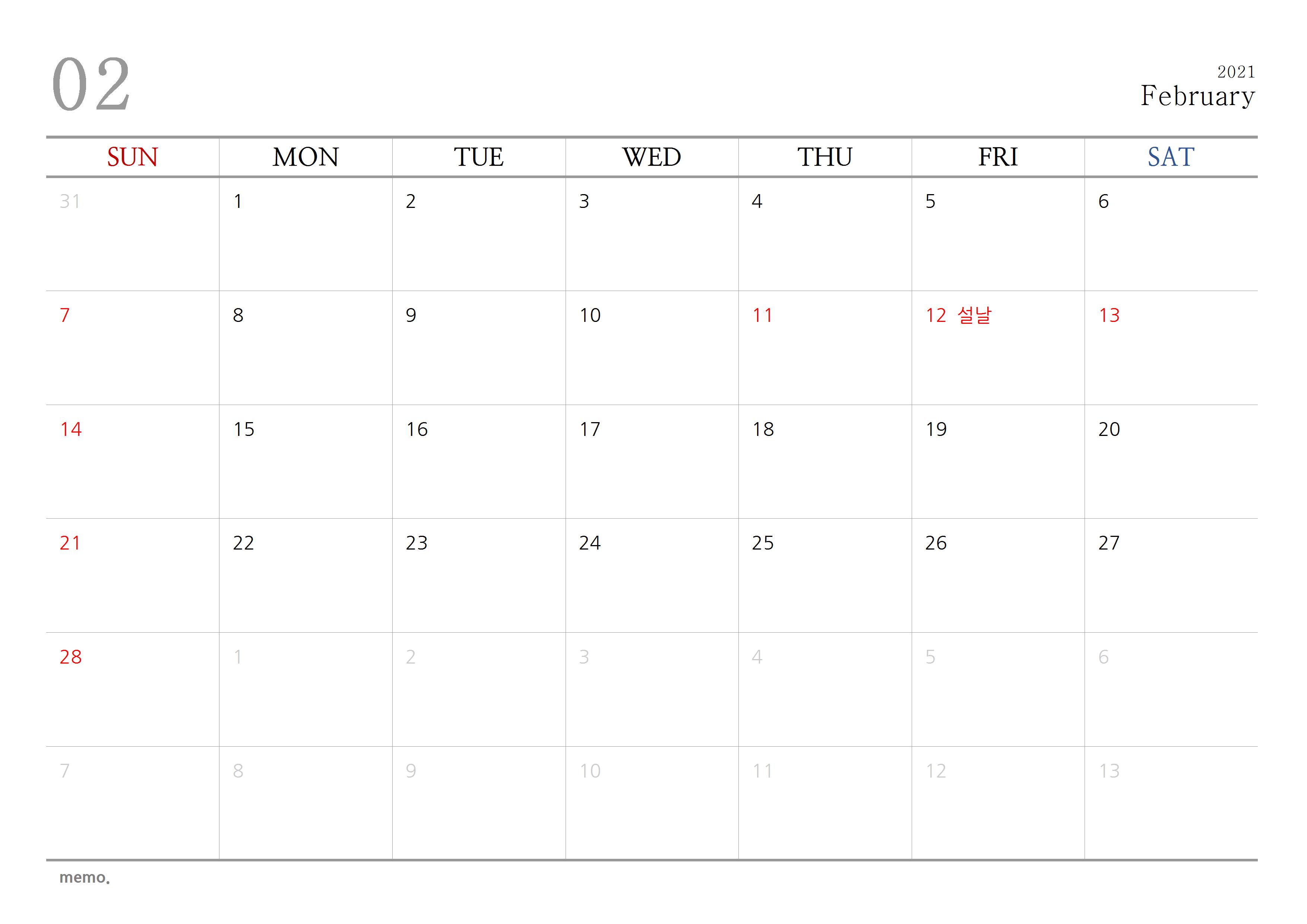 셀의 크기나 간격은 모두 같은 사이즈로 제작되었으며 첨부된 모든 달력들은 A4 가로 사이즈로 한 장에 딱 맞게 들어가도록 제작되었기 때문에 프린트나 인쇄할 수 있습니다. 마찬가지로 위의 달력을 HWP 파일로 무료 다운로드하고자 한다면 바로 위에 첨부가 되어있는 '2 2021년 달력 한글파일 메모란 추가' 파일을 저장하시면 됩니다.
