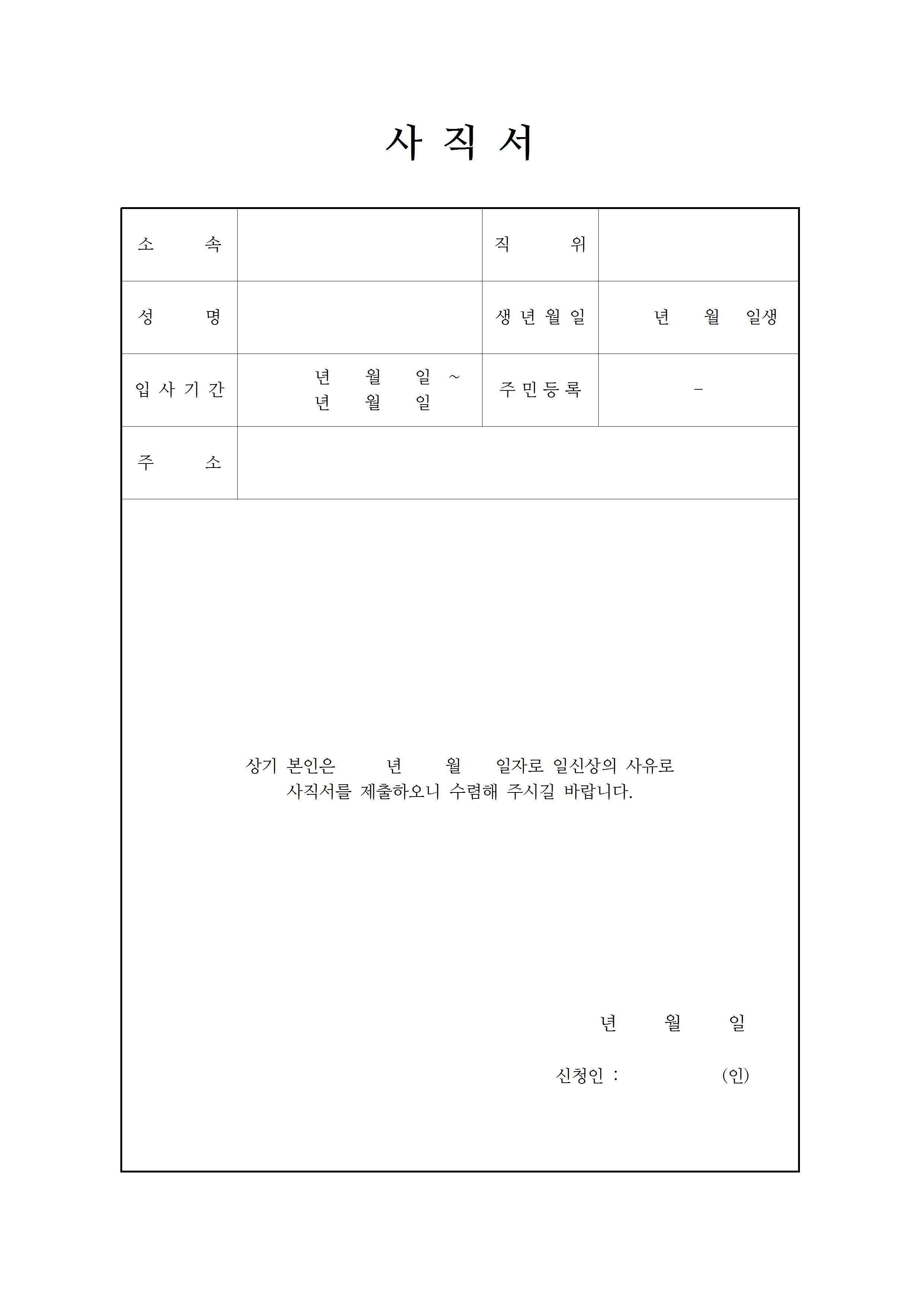 1번부터 5번까지는 테두리에 선이 있는 가독성이 좋은 서식인데요. 위에 2번 사직서 양식에도 테두리에 하나의 검은 실선이 그려져 있고 그 안에 문구들을 기입할 수 있는 내용들이 들어가 있습니다. 소속과 직위, 성명과 생년월일, 입사 기간과 주민번호와 주소, 그리고 신청 날짜와 신청인의 성명과 사인을 기록하는 란으로 구성되어 있습니다.