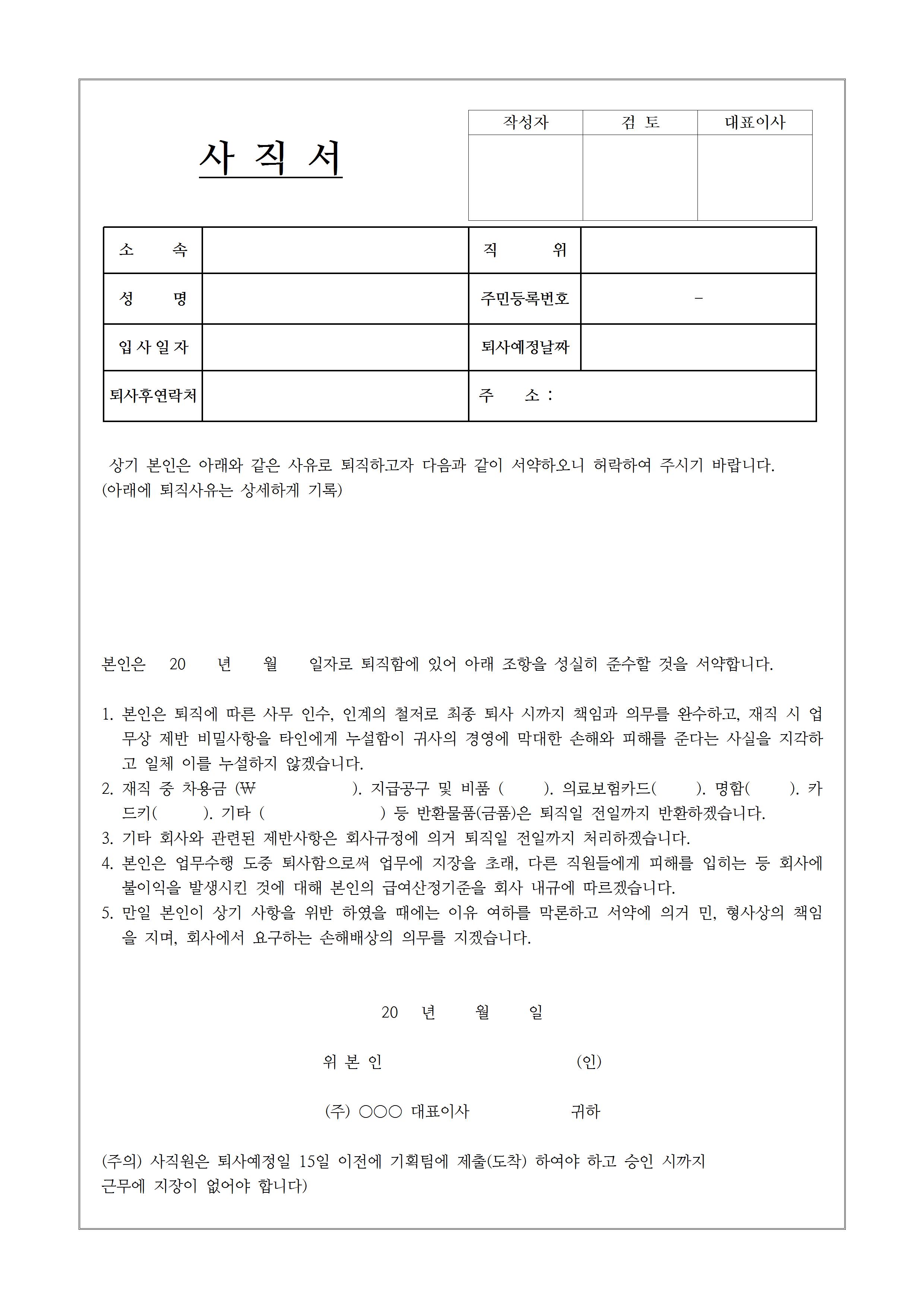 다음은 회사마다 또는 일을 해왔던 직군마다 다르겠지만 약관 내용들을 기재하는데 적합한 사직서 양식입니다. 근무할때 지급받았던 물품들이나 카드나 명함, 차용금 등 여러 가지 사항들을 기입할 수 있습니다. 위에 조항들은 예시이니 다니고 있는 회사의 특성에 맞는 문구들을 수정하셔서 활용하시면 됩니다.