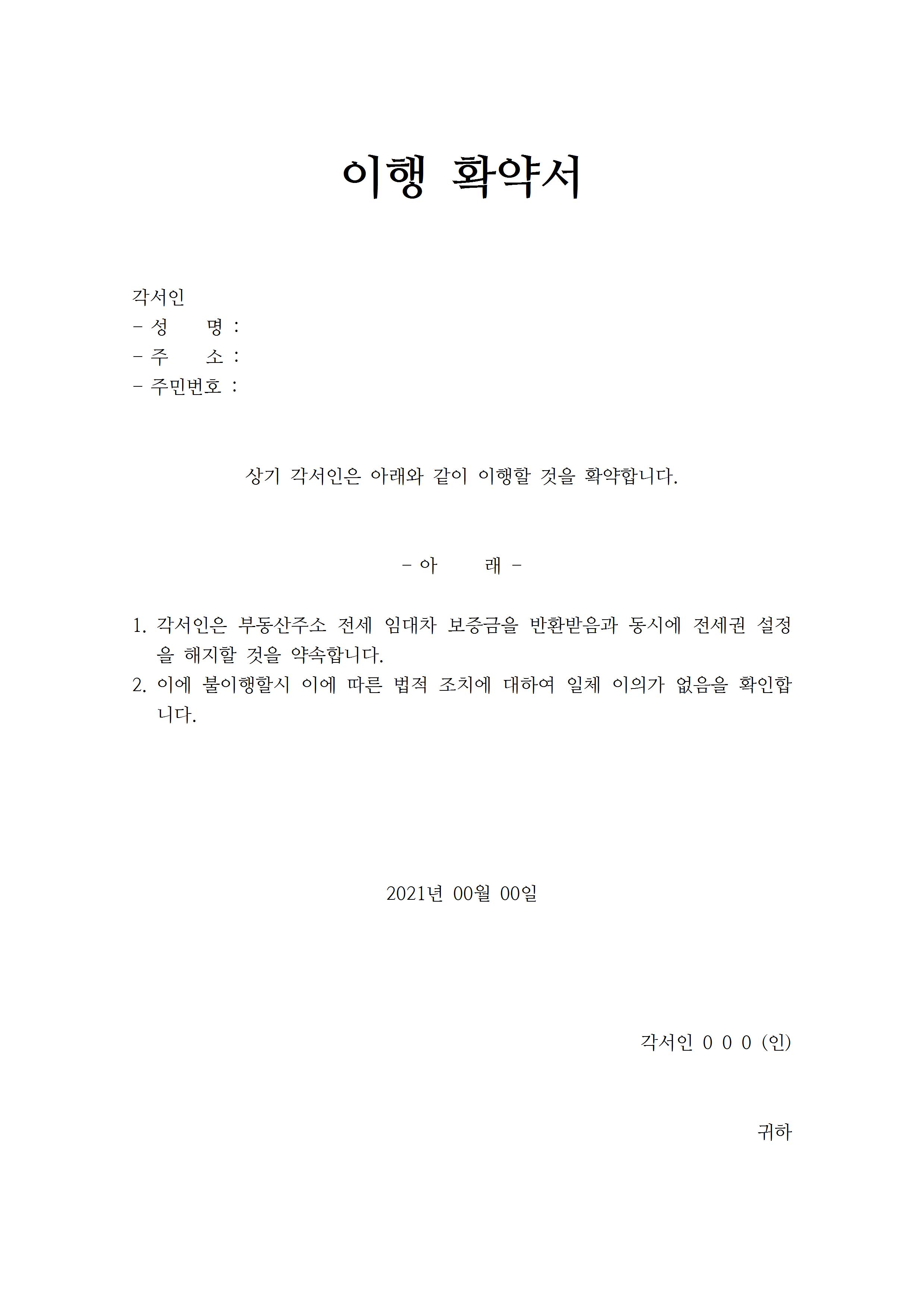 다음은 일반적으로 많이 활용되고 있는 부동산 이행 확약서 양식입니다. 부동산 계약을 진행을 하게 되면 계약서를 작성함과 동시에 매도인 또는 매수인께서 이행확약서를 요청을 하는 경우가 많습니다. 그 이유는 각서와 다르게 공증 문서를 받지 않더라도 법적인 효력이 발생되기 때문입니다. 혹시라도 생겨날 수 있는 상황, 예를 들면 상대방이 계약 내용대로 이행을 하지 않게 되었을 때 내용증명을 보낸 다음 소송을 한 후 판결까지의 복잡한 과정을 밟게 되지만, 이행 확약서가 있다면 몇 가지의 과정들을 딛지 않아 시간을 절약할 수 있다는 장점이 있습니다. 그래서 이러한 부분들도 공인중개사나 부동산, 법무사의 자문을 받아 작성하는 것이 좋습니다.
