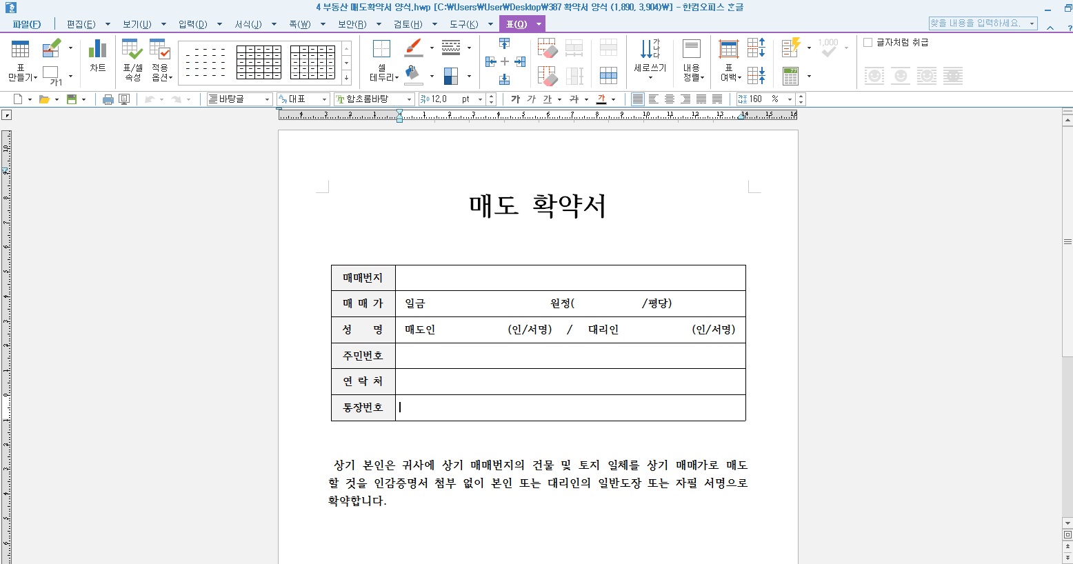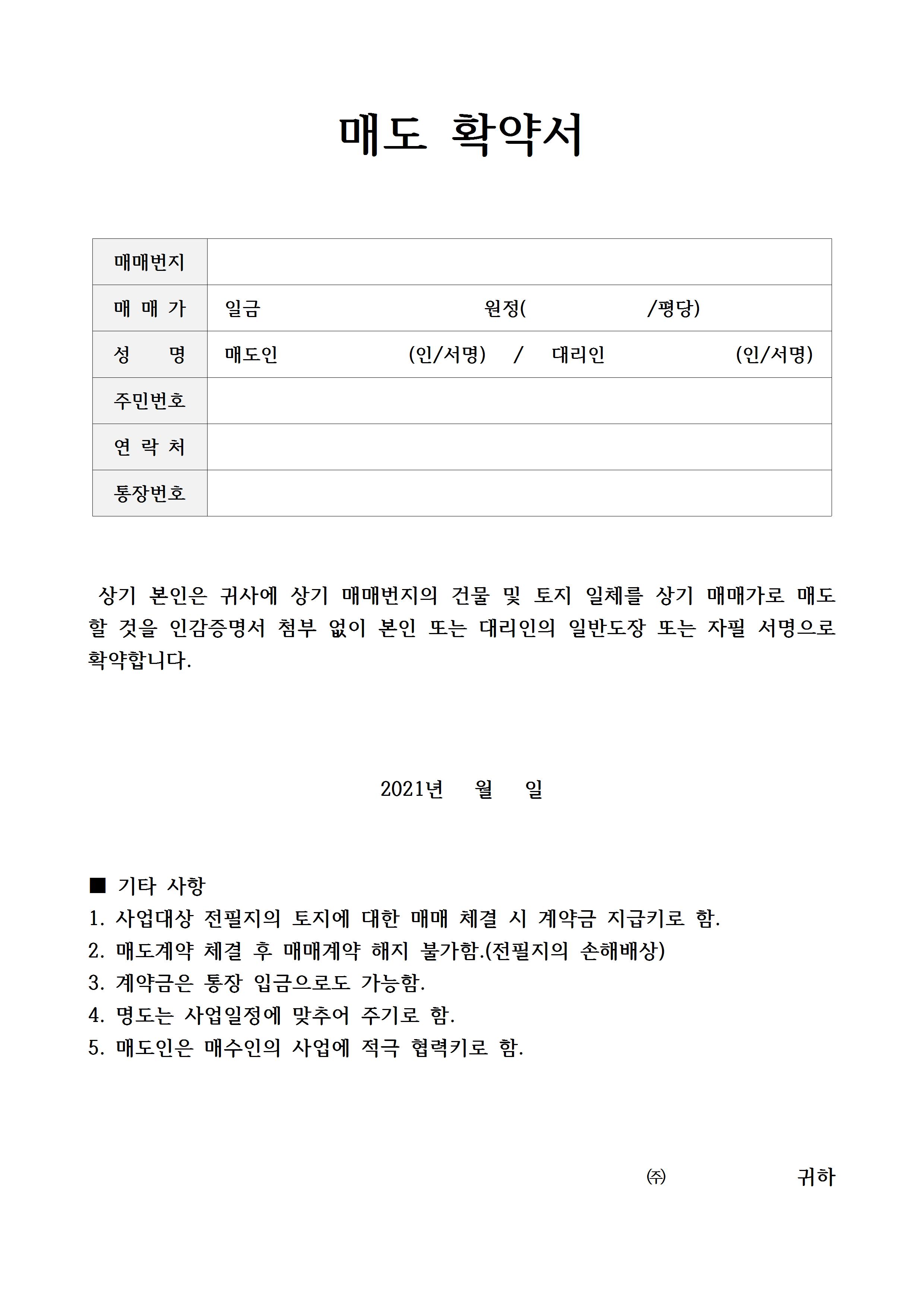다음은 부동산 매도확약서 양식입니다. 매매 번지와 매매가 및 평당 가격, 매도인과 대리인의 서명 사인을 작성할 수 있는 성명, 주민번호, 연락처, 통장 계좌번호를 작성하는 칸이 상단에 위치해 있으며, 매매 번지의 건물이나 토지 일체를 상기 매매가로 매도할 것을 인감증명서 첨부 없이 본인 또는 자필 서명으로 확약한다는 내용이 기재되어 있습니다. 기타 사항으로는 전 필지의 토지에 대한 매매 체결 시 계약금을 지급키로 약속한다는 내용, 매도계약 체결을 한 후 매매계약 해지는 불가하다는 내용, 계약금은 통장 입금으로 가능하다는 내용 등이 들어가 있으며 사업을 하기 위한 계약이 아닌 개인 간 부동산 거래 매도 확약서로 작성되는 경우에는 4번, 5번의 내용을 제외하셔도 됩니다.