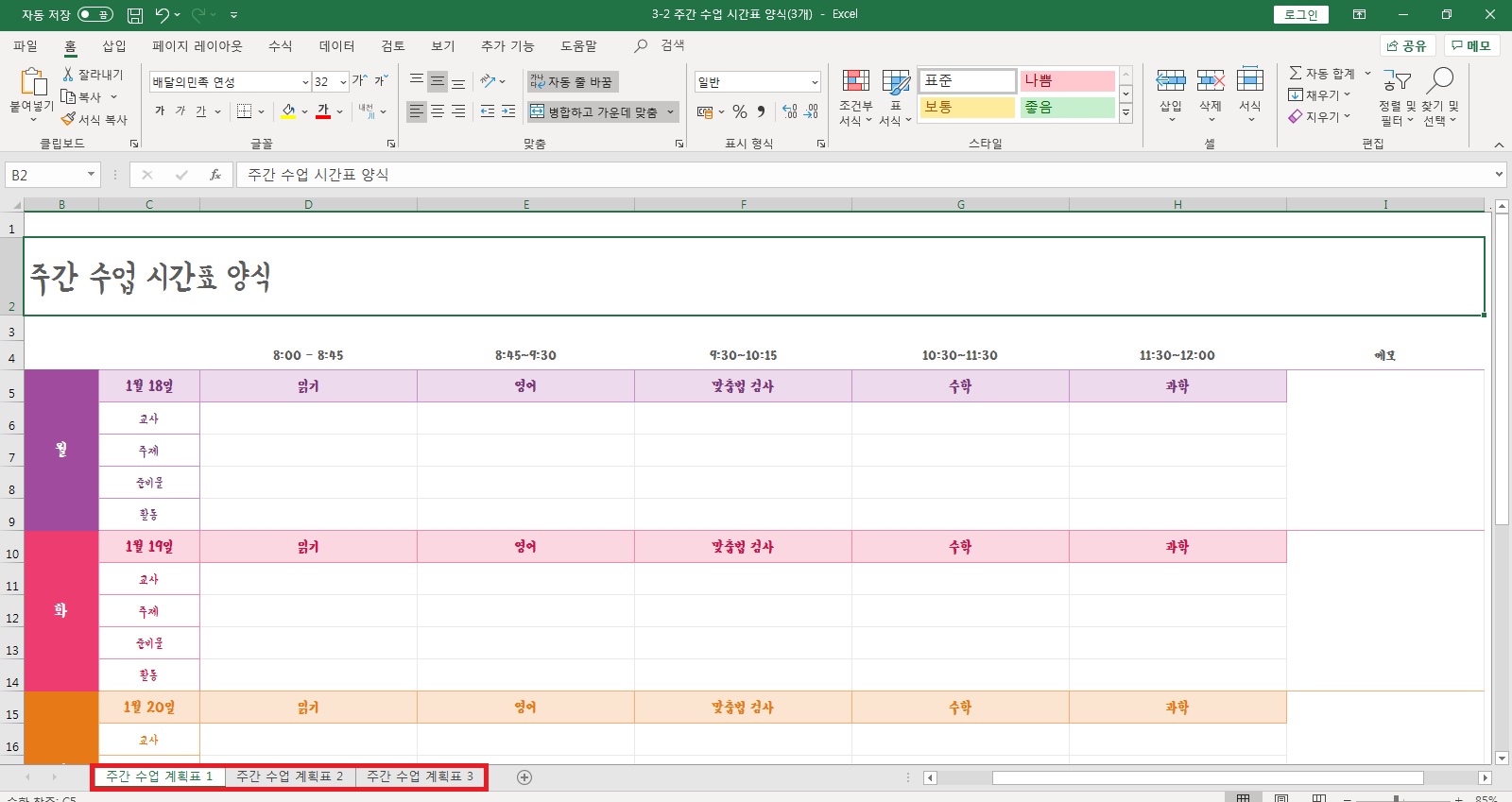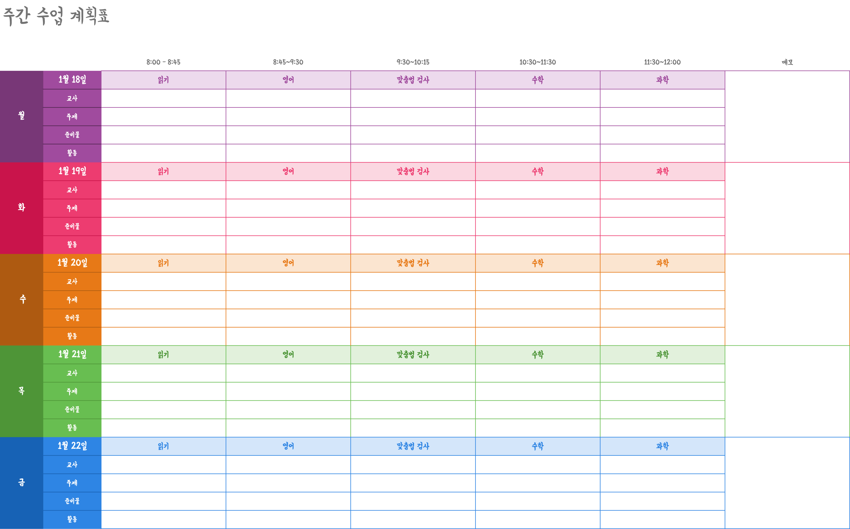 그리고 두번째 파일은 알록달록 예쁘고 귀엽게 제작된 수업 시간표 양식입니다. 왼쪽에는 요일이 있고 오른쪽에는 수업시간대별로 과목 및 교사, 주제, 활동 등을 입력을 할 수 있는 칸이 나열되어 있습니다. 우선 이 엑셀에는 총 세가지의 양식이 들어가 있습니다. 날짜와 요일은 자동으로 입력이 되는 방식이며, 그 주에 저장하면 그 주에 해당되는 요일과 날짜가 표기가 되는 형태입니다. 하나씩 이미지로 감상해보도록 하겠습니다.