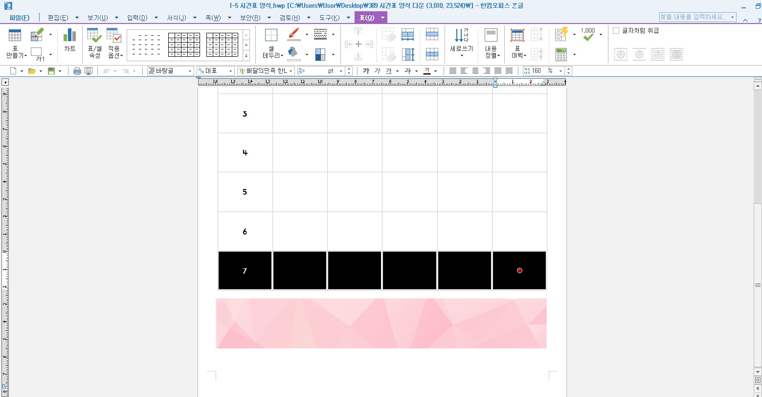 역시 저는 디자인적인 감각은 떨어지나 봅니다. 취향에 맞게 내가 마음에 드는 이미지를 직접 넣어서 제작하시면 좋을 것 같고요. 표 또한 테두리 부분을 누른 뒤 마우스나 키보드의 방향 표시로 자유롭게 위치를 조금씩 수정하실 수 있습니다. 만약 초등생인 경우 시간표가 5~6 정도로 끝나는 경우가 많기 때문에 셀을 지우셔야 하는데 셀을 지우는 방법 또한 간단합니다.
