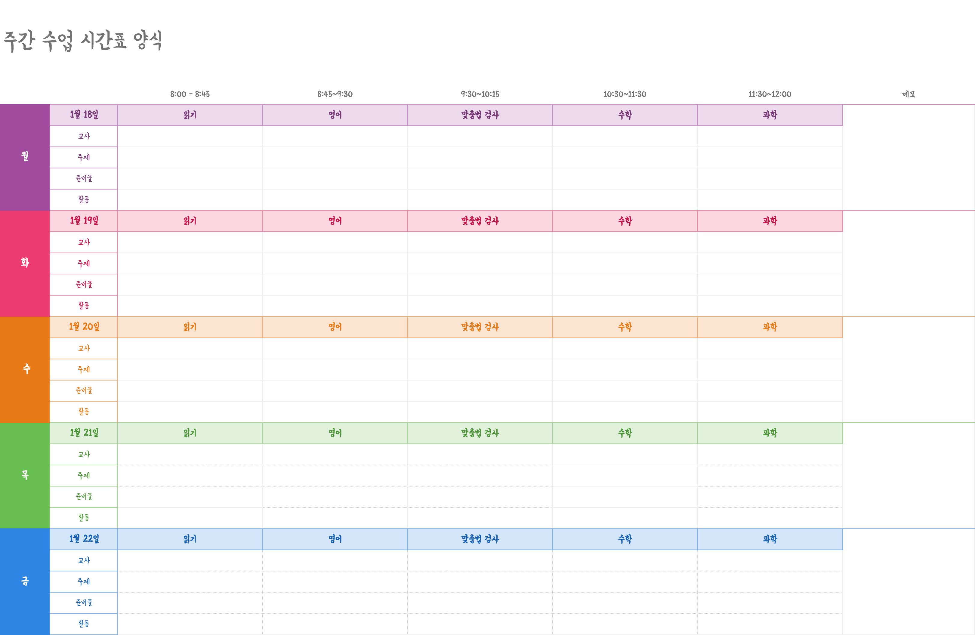 학교나 초등학생 또는 고등학교 수업, 대학교 강의 회사원 및 직장인까지 사용층에 따라서 활용이되는 용도는 조금씩 다르기 때문에 여러가지 시간표 양식들을 모음들로 구성을 해봤는데요. 한글 hwp 원본 파일과 엑셀 시간표 양식 파일로 각각 첨부했습니다. 스크롤을 천천히 내려보면서 내가 찾는 양식이 있는지 골라본 후 각 이미지 밑에 첨부된 한글과 엑셀 원본을 잘 다운로드 받으시면 됩니다.