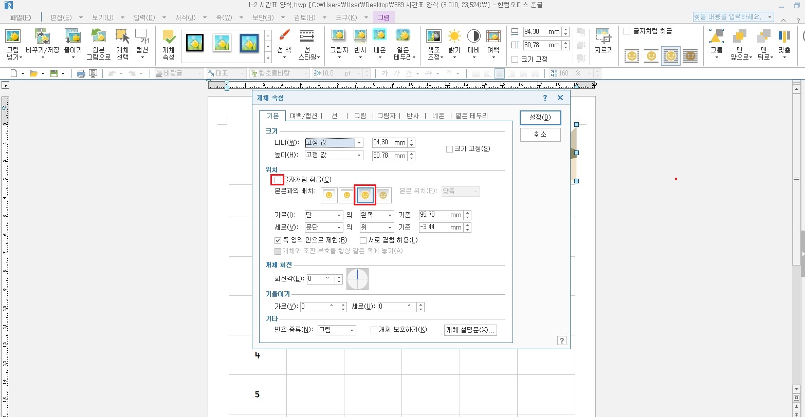 우선 이미지를 삽입하거나 수정 또는 배치하는 방법은 간단합니다. 위에 화면처럼 배치를 해보도록 할텐데요. 우선 마음에 드는 이미지를 다른 곳에서 저장을 해 온 다음 한글에 끌어온 뒤 이미지를 더블 클릭합니다.
