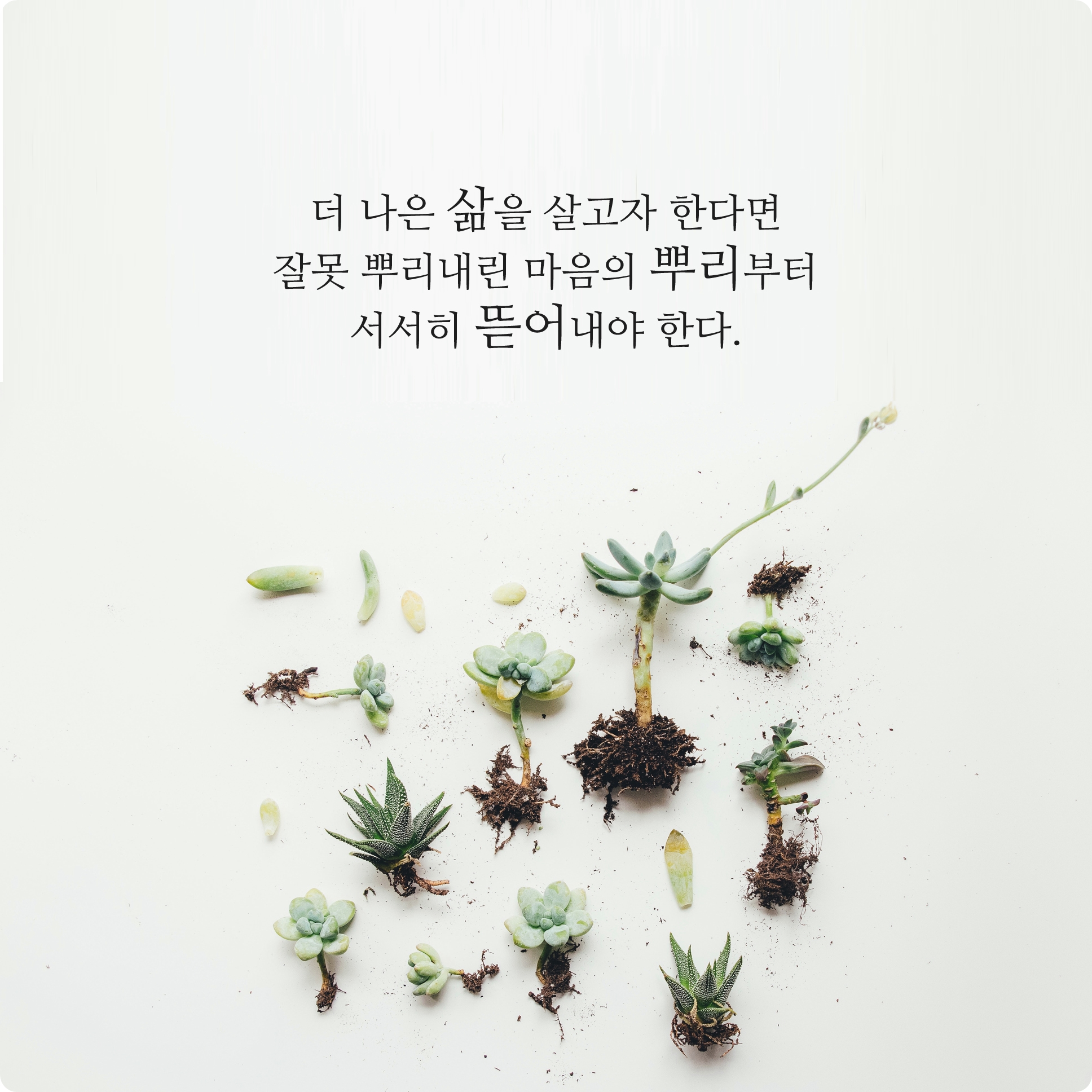 좀 더 나은 삶을 바라고 있다면 아무래도 지금 현재의 문제점 또한 있을지도 몰릅니다. 혹시라도 잘못 형성되어있는 마음적인 뿌리가 있다면 그 마음의 뿌리는 내가 좀 더 개선시켜야 한다고 느끼는 것이 있다면 안좋은 마음들을 서서히 걷어내며 나에게 필요한 마음의 뿌리들로 다시 자라나게 해야합니다.