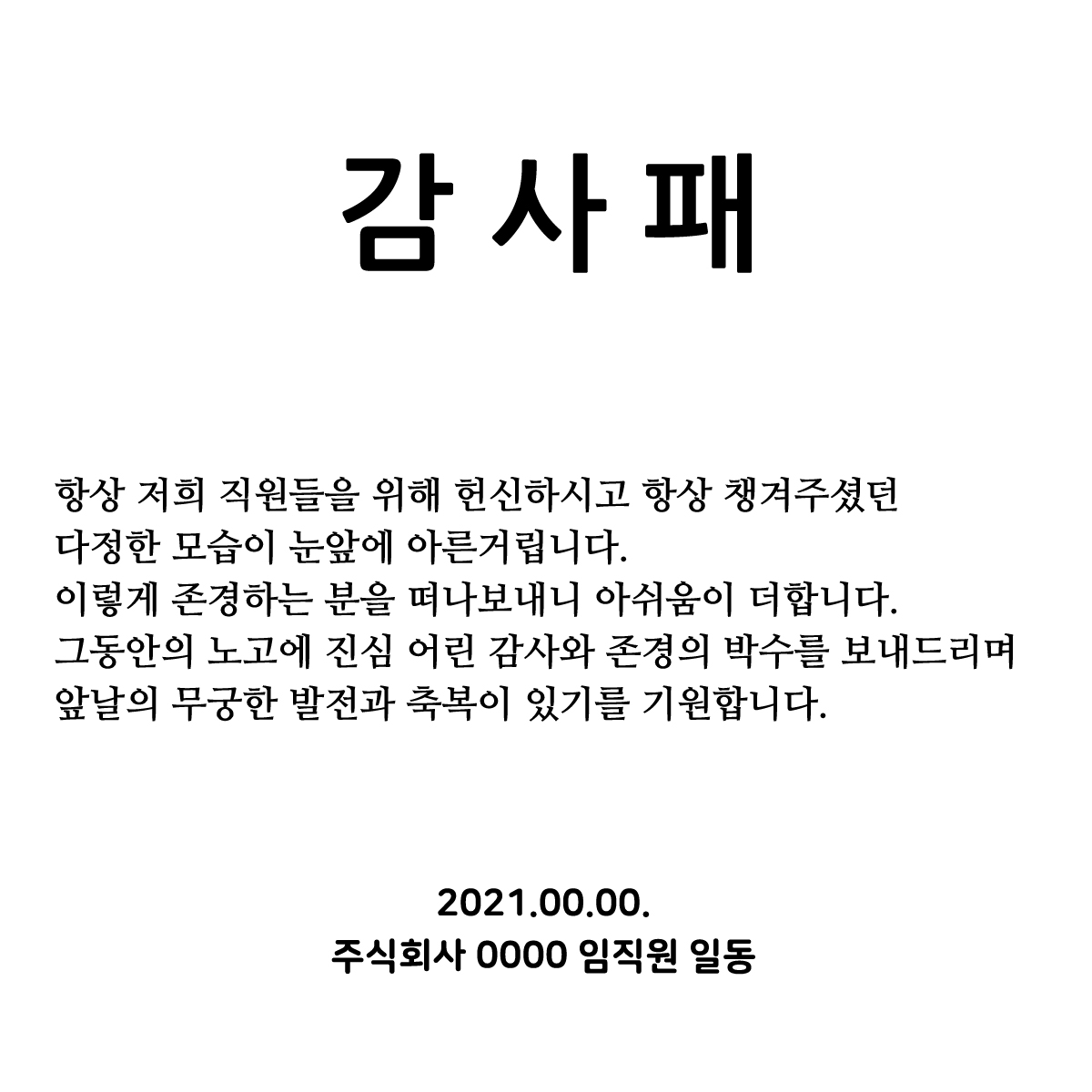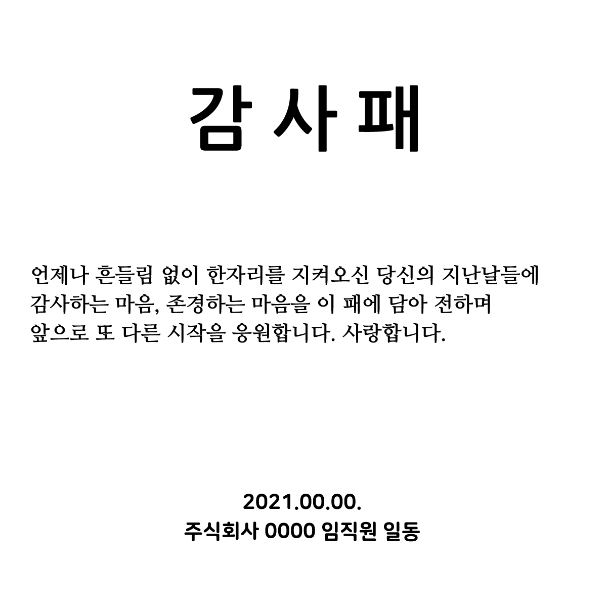평생을 저희 0000에 열정과 헌신으로 몸담아주신 공로에 저희 임직원들 모두 머리 숙여 감사의 말씀 전합니다. 한결같은 노력과 정성으로 함께 많은 시간들을 보내왔던 추억과 이별의 아쉬움을 이 패에 담아 전합니다. 앞날에 건강과 행복이 가득하시길 기원합니다.