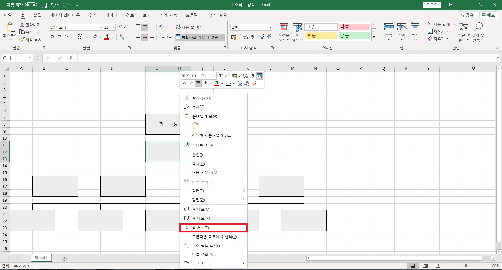 우선 하단에 나열할 이미지 밑에 있는 1번 조직도 양식을 저장하고 파일을 열었을때의 모습입니다. 보시면 모든 이미지는 제작된 문서 파일로 구성되어있습니다. 간단하게 편집하는 방법도 설명드려볼게요. 우선 엑셀 파일에는 각 셀을 구분하는 실선이 있으며 여기 실선 위에서 셀을 선택하고 표를 그리게 되면 그 표만 그려져서 나타나기 때문에 각 셀로 된 실선들은 무시하시면 됩니다. 예시로 선을 하나 지워보도록 하겠습니다. 우선 회장 밑에 부분을 선택을 하고 마우스 오른쪽 버튼을 누릅니다.