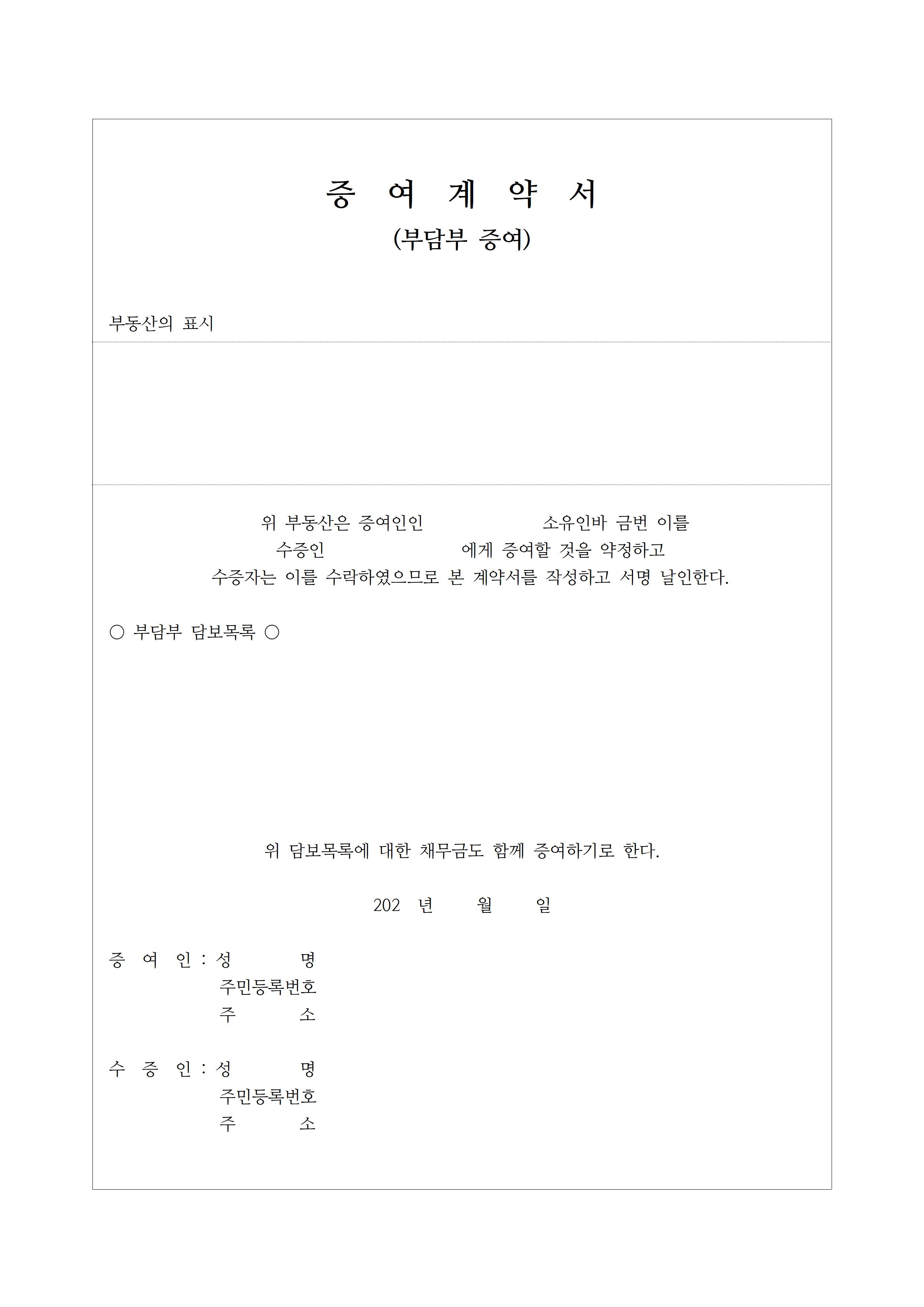 이것이 해당 부담부 증여계약서 양식입니다. 작성하는 방법은 소유권 이전 또는 인도에 대한 사항과 계약일과 물건지 등을 빠짐없이 작성을 해야하며 증서 및 서류를 첨부하여 등기소에 접수를 하면 증여 계약이 모두 마무리가 됩니다.