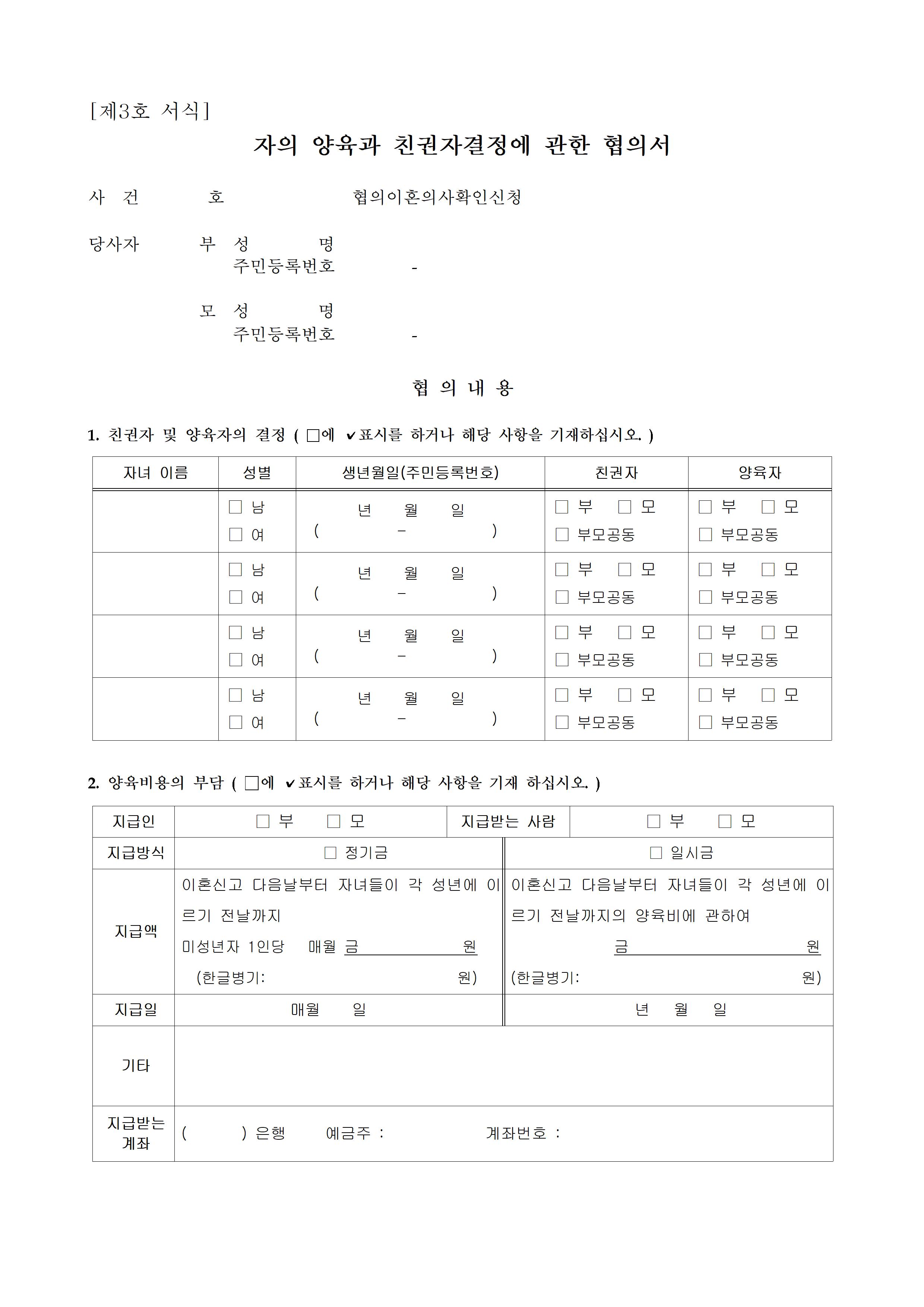 다음은 자녀가 있는 경우에 작성하는 협의이혼의사확인 신청서 양식입니다. 마찬가지로 이미지와 원본 파일 순으로 아래 순서대로 나열했습니다.