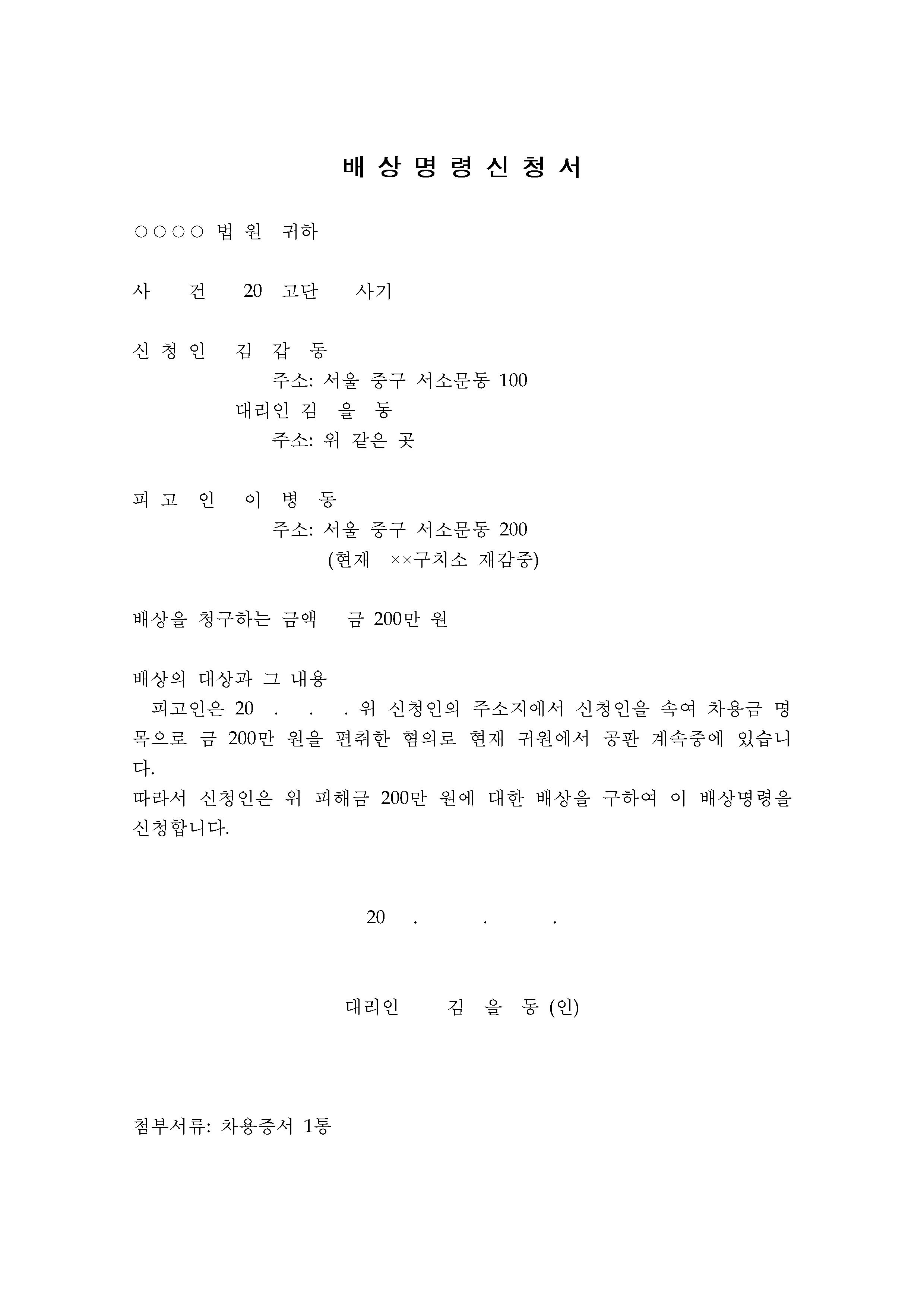 신청인과 피고인의 이름과 주소, 사건번호와 배상을 청구하는 금액과 배상 내용에 대해서 간단하게 작성되었습니다. 배상명령도 본인이 배상을 요청하는 내용에 맞게 문맥을 직접 수정하여 작성하시면 되시며 첨부서류로는 차용증서 1통입니다.