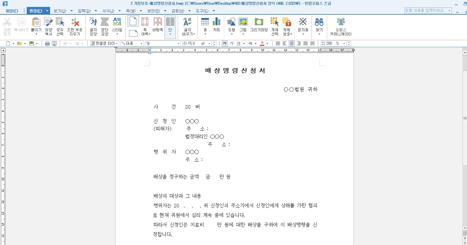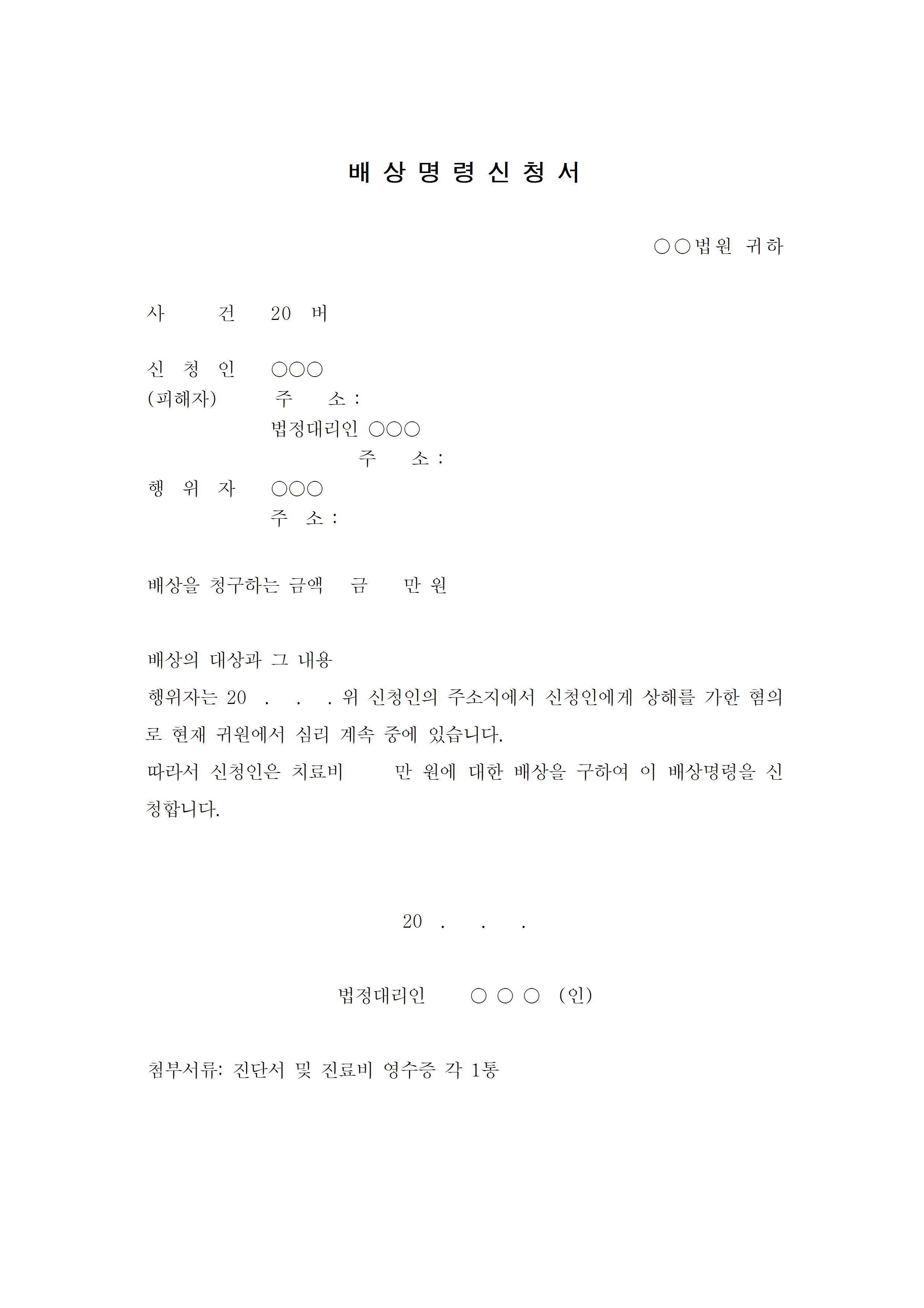 다음은 가정보호에 관한 배상명령신청서 양식입니다. 상해를 가한 혐의에 대해서 치료비에 대한 배상을 구한다는 내용으로 작성되어 있으나 마찬가지로 처한 상황에 맞게 문맥을 직접 수정하셔도 됩니다.