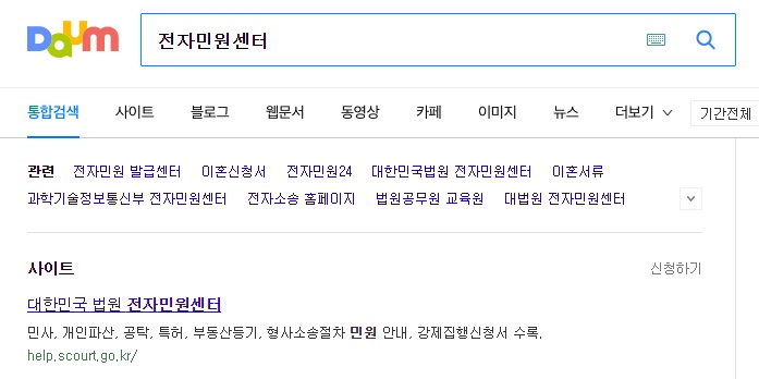 우선 다음이나 네이버 등 포털사이트에 '전자민원센터'라고 검색을 하면 help.scourt~라고 시작되는 '대한민국 법원 전자민원센터' 사이트로 방문합니다.