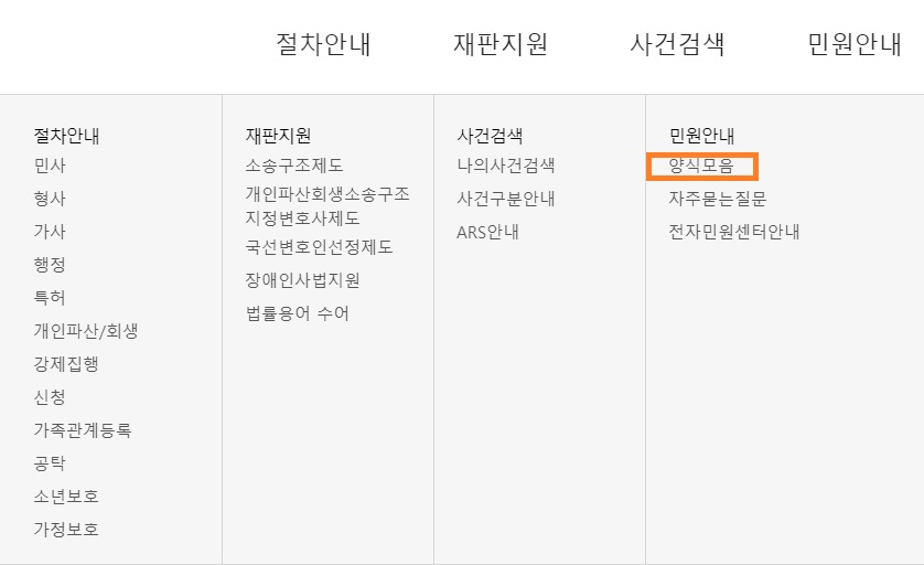 마지막으로는 아봉보호에 관한 배상명령 서식입니다. 위의 2번과 기본적인 구성은 동일하며, 첨부해야 할 서류로는 진단서 및 진료비 그리고 영수증 각 1통입니다. 그렇다면 직접 대법원 사이트에 방문하셔서 다운로드하는 방법입니다.