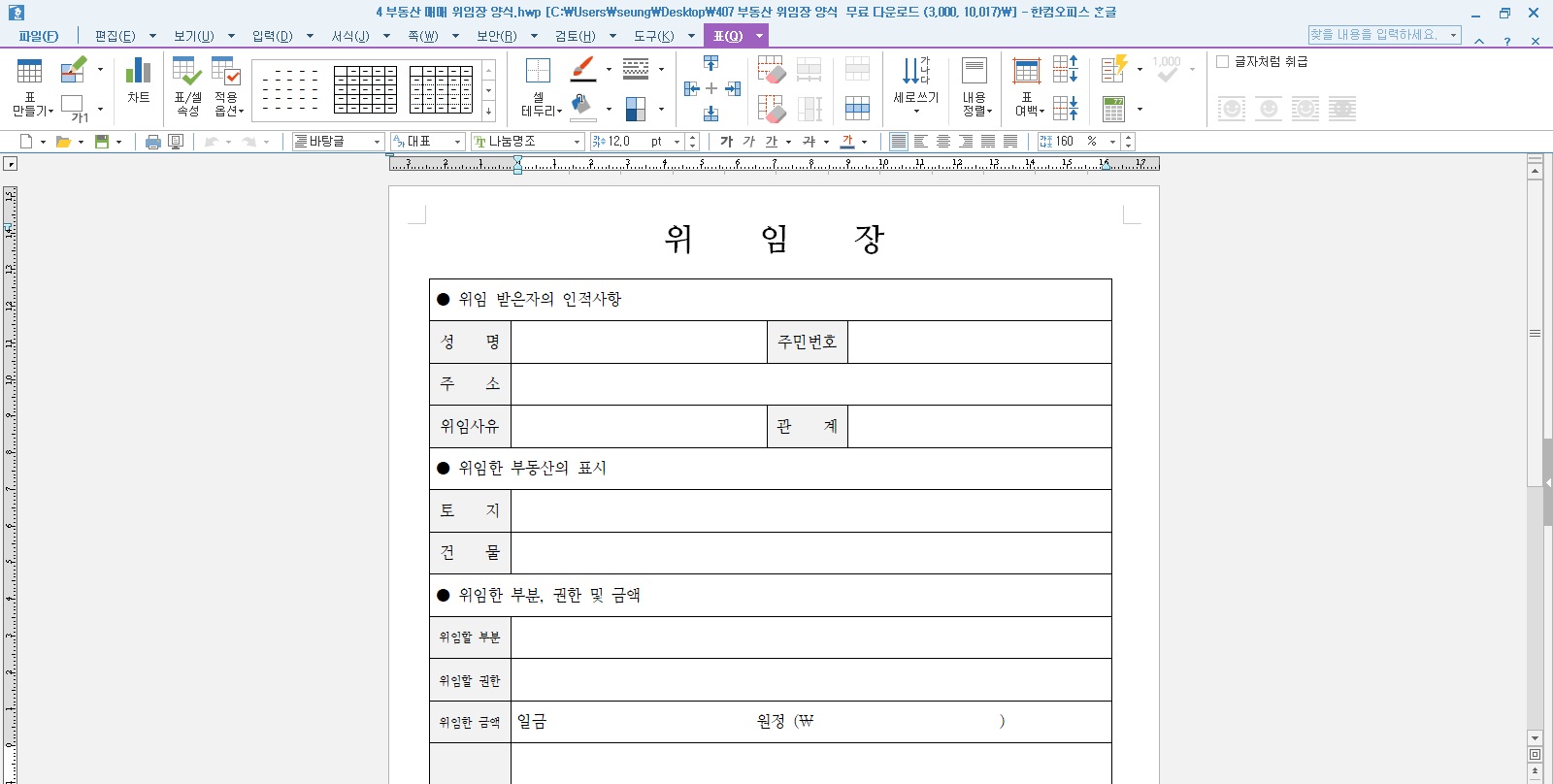우선 첫번째 부동산 위임장 양식이며, 아래 이미지 밑에 첨부된 한글 hwp 원본 파일을 다운로드한 후 파일을 열었을 때의 화면입니다. 우선 부동산 대리인 계약 시 위임장 양식 및 주의사항으로는 혹시나 생겨날 수 있는 분쟁을 대비하여 위임장에 날인이 된 인감도장에 관한 인감증명서를 첨부를 해야 하며, 위임자의 서명에도 반드시 인감증명서와 같은 인감으로 날인해야 합니다. 또한 위임자와 대리인 모두 19세 이상이어야 함과 정신에 아무런 문제가 없으며 강제된 것이 아닌 본인의 의사에 따른 효력을 갖게 됩니다. 따라서 거래하는 당사자 또한 어떠한 이유로 위임자가 나오게 되었는지 이유를 확인함과 동시에 직접 전화를 해서 대리 계약을 진행하게 되는 것이 맞는지 확인해야 할 필요가 있습니다.