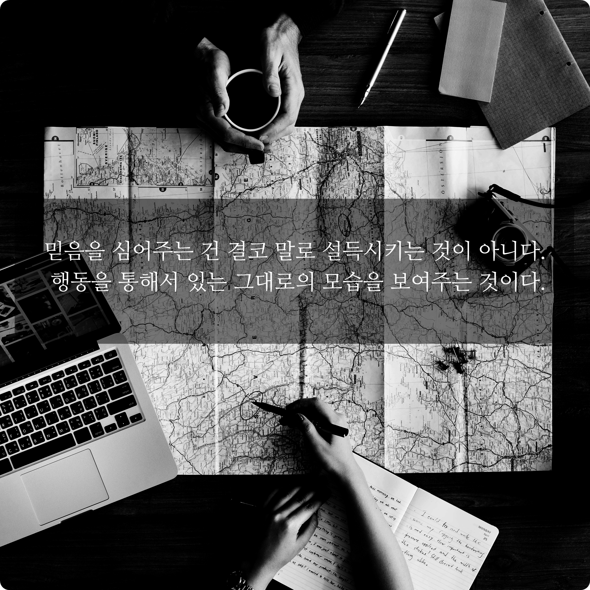 이것도 인간관계 또는 사람대 사람으로써의 관계에 대해서 얘기하고 싶은 메세지인데요. 어떤 사람에게 신뢰를 얻을 수 있는 방법은 특정한 행동이나 말로 그 사람의 환심을 사는 것이 아니라 오랜 시간을 두고 묵묵하게 한결같은 모습을 갖고 있을때 도리어 그 사람이 힘들고 어려울때나 나에게 기댈 수 있을만큼의 믿음, 그리고 마음을 갖게 되는 것 같습니다. 오랜 기간동안 그 사람이 마음에 들만한 행동들을 묵묵히 이행해하면서 한결같은 모습. 직장에서 상사에게 마음을 얻는 하나의 방법이 될 수도 있습니다.
