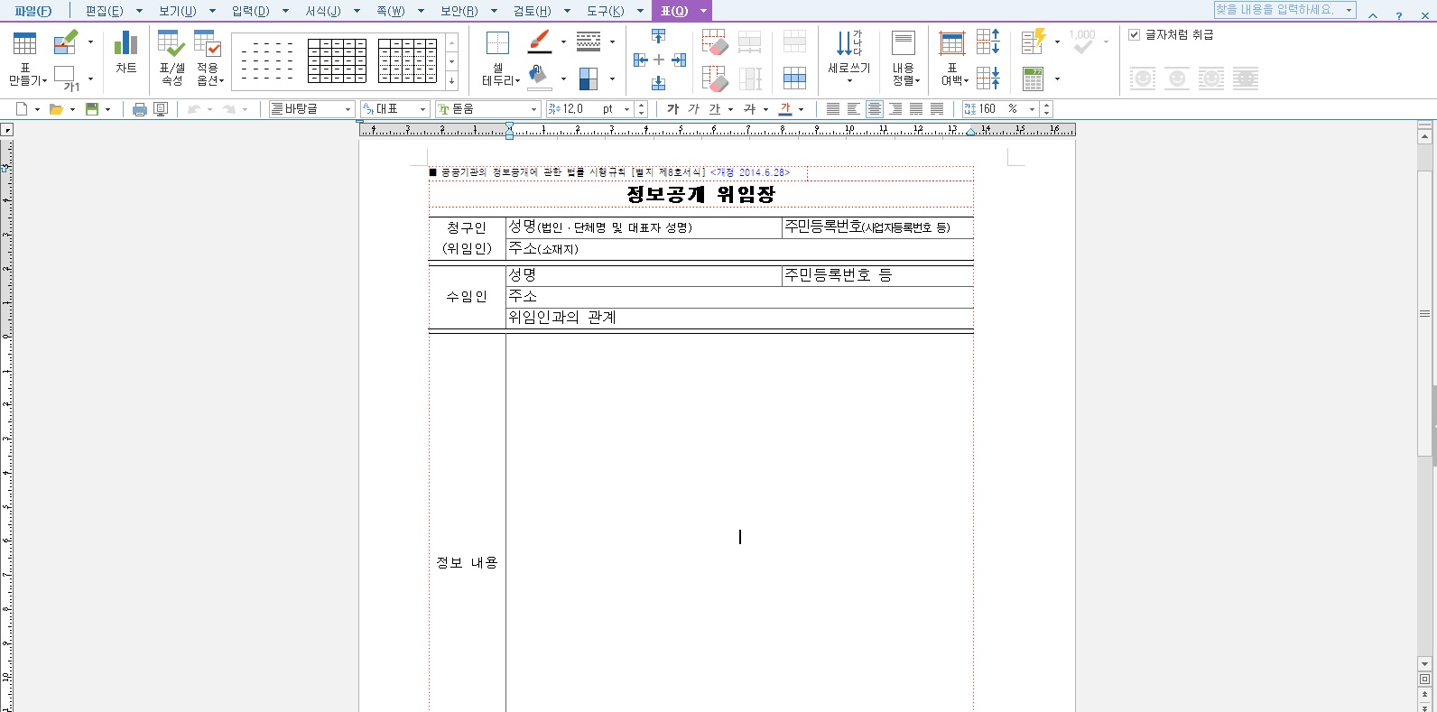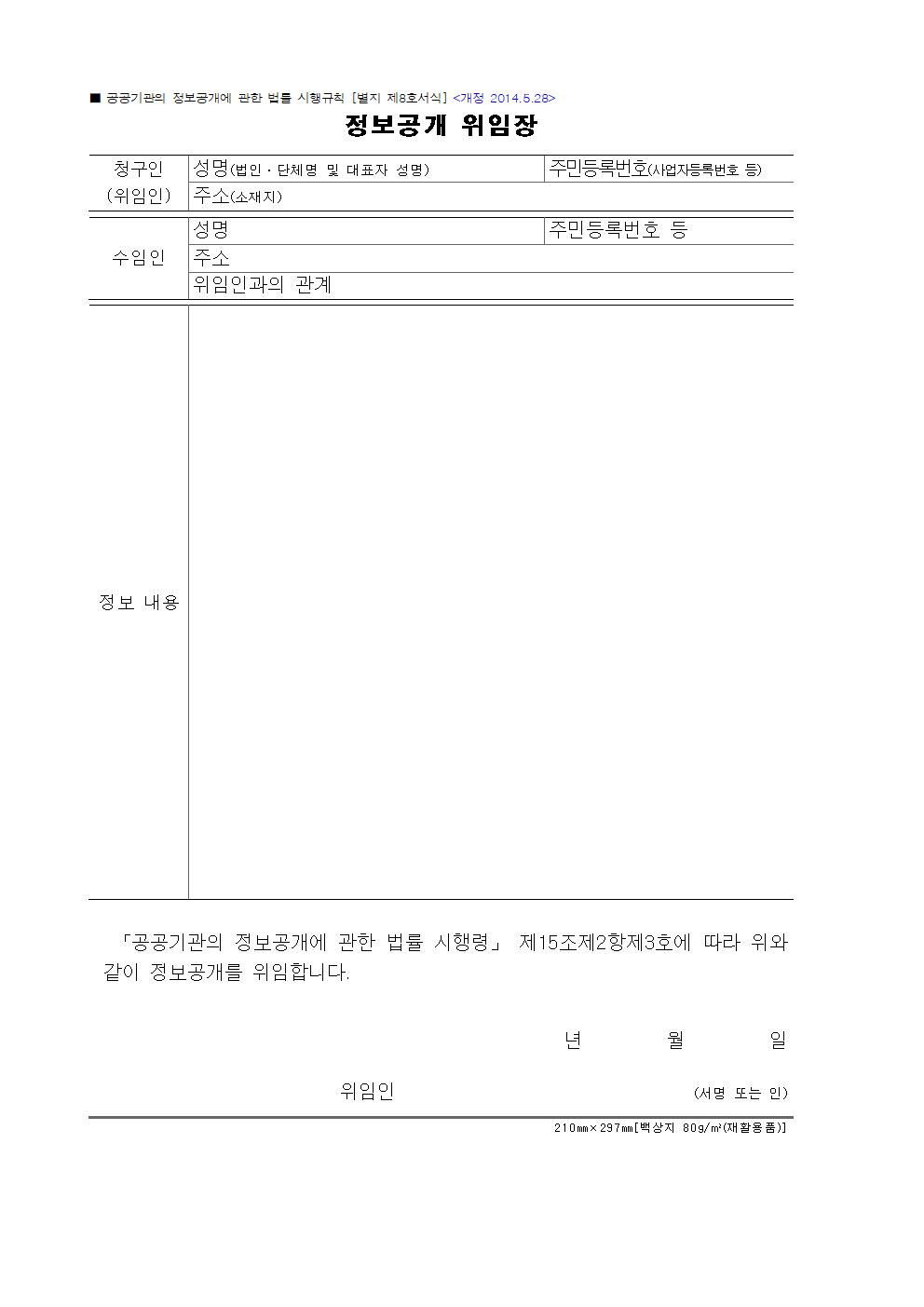다음은 정보공개시 청구인 외 임의대리인에게 공개하는 경우 정당한 대리인임을 확인해야 하는 정보공개 위임장 양식입니다. 구비서류는 청구인과 수임인의 신분증, 그리고 해당 위에 첨부되어 있는 정보공개 위임장 1부입니다.