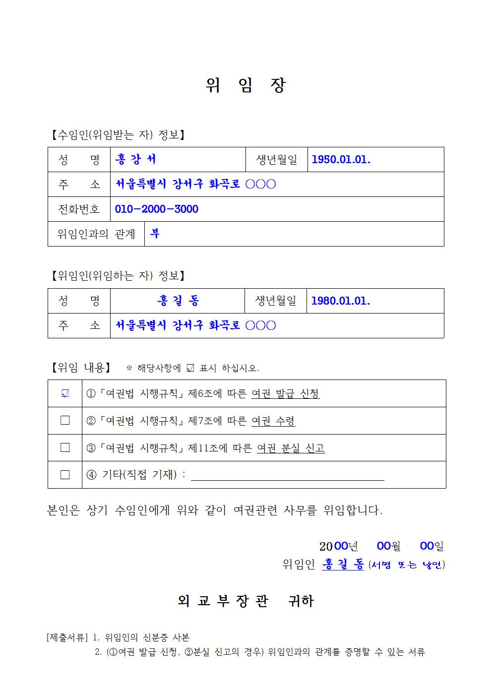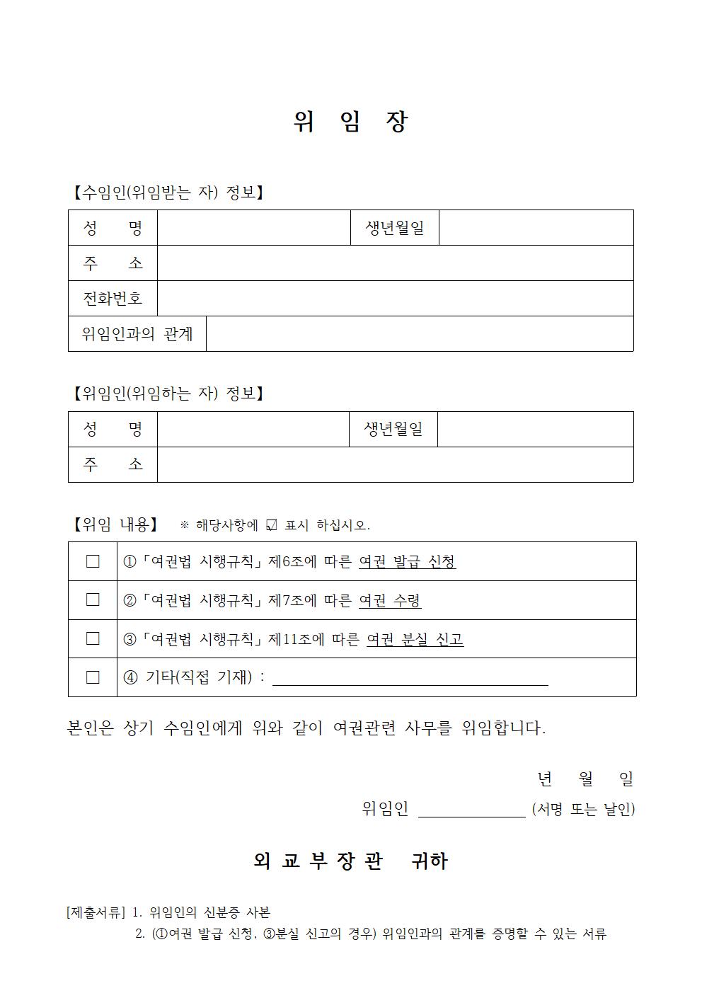여권 발급이나 신청 및 수령을 타인에게 위임할 경우에 작성되는 여권발급 위임장입니다. 해당민원사무의 신청서 및 위임자의 자필서명 또는 도장 날인이 들어간 위임장, 위임자의 신분증, 대리인의 신분증이 구비서류입니다. 대리 신청의 경우 미성년자 대리 신청 시에는 미성년자 본인의 2촌 이내 친족, 법정대리인의 배우자를 말하며, 여권기재 사항 변경 신청(사증란 추가)도 가능합니다. 또한 질병이나 장애, 사고로 인한 여권 대리 신청의 경우 전문의의 진단서나 소견서 첨부(대리인은 법정대리인, 배우자, 18세 이상의 신청인이나 배우자의 2촌 이내 친족)를 해야 합니다.