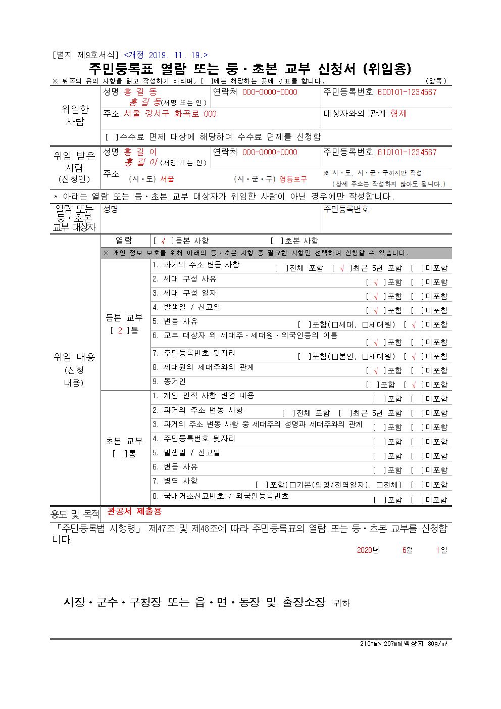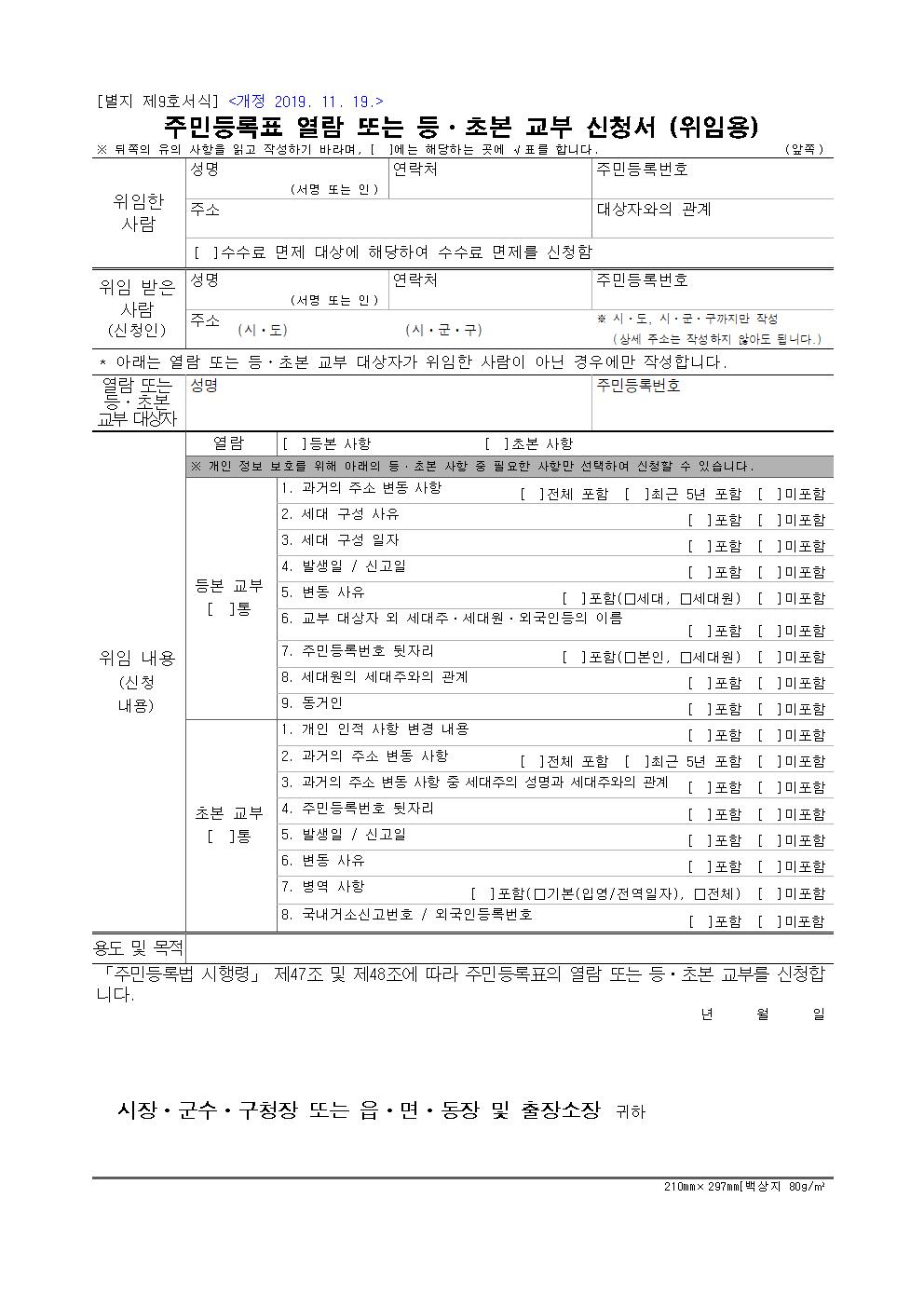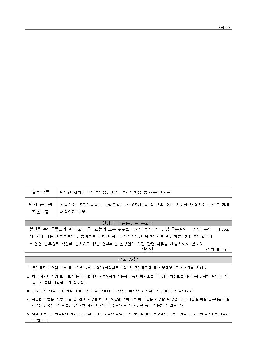 다음은 주민등록표 열람 또는 등본과 초본 교부를 신청 위임장입니다. 본인 또는 세대원과 세대주의 직계 존비속, 배우자가 방문하기 곤란하여 위임한 경우에 필요한 서류이며, 위임자의 신분증(사본가능), 방문자의 신분증, 위임장이 각각 필요합니다. 구청과 읍사무소, 면사무소, 동사무소 및 주민센터에서 가장 많이 활용되는 서식입니다.