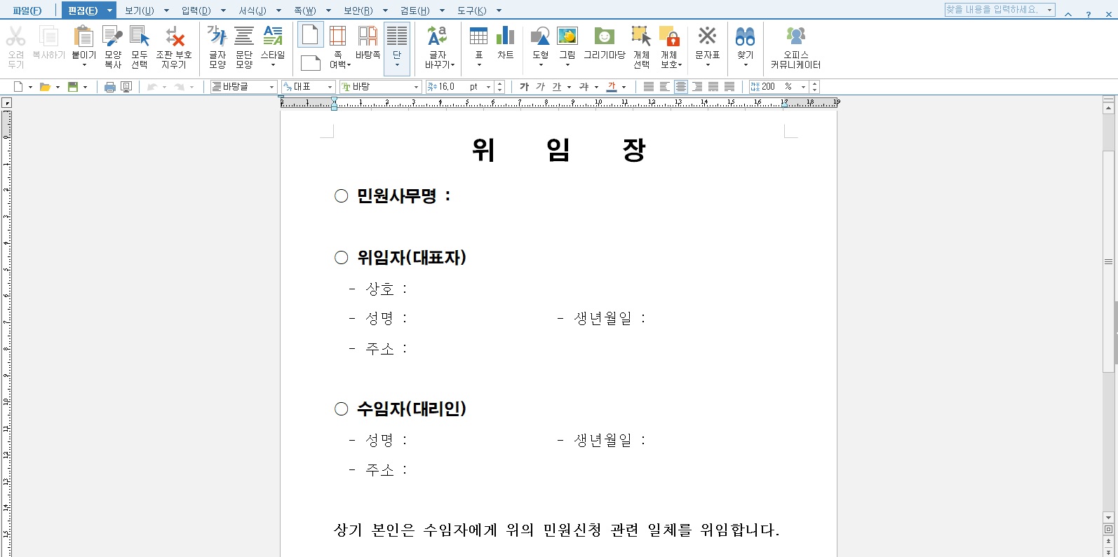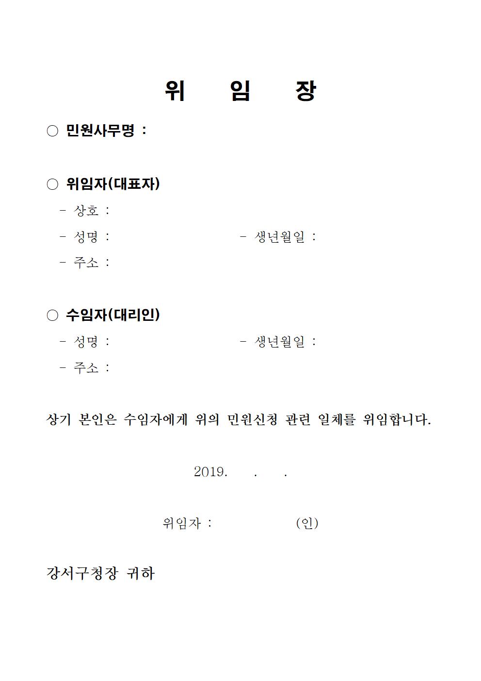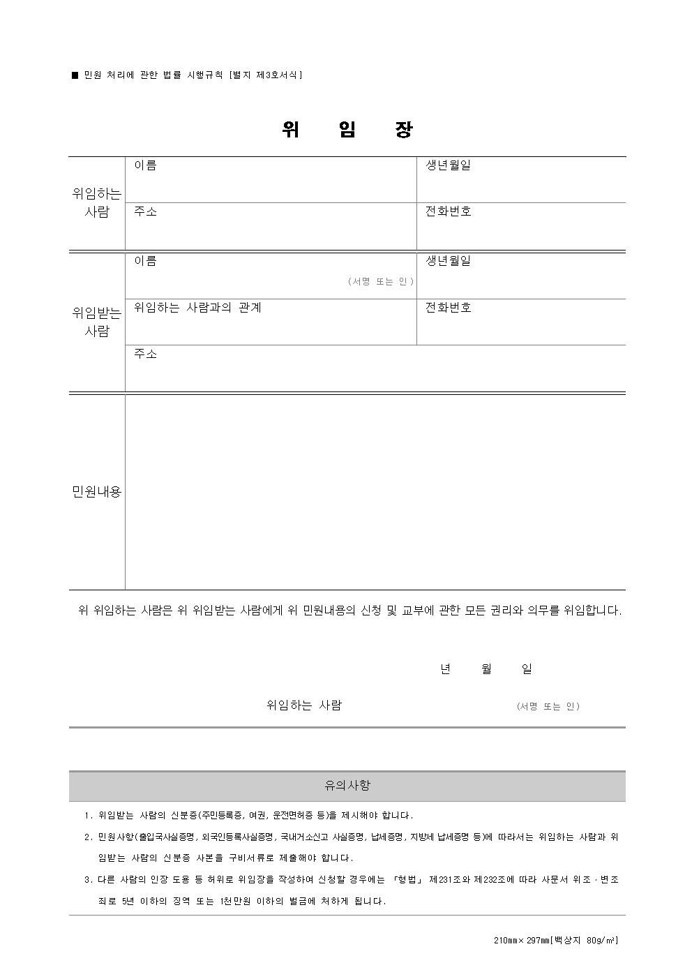 그리고 다음은 좀 더 심플하며 간결하게 작성된 민원서류입니다. 상호와 생년월일 성명과 주소 등의 위임자 또는 대표 위임자와 대리인에 해당되는 수임자의 인적사항을 작성하는 서식이며, 간단한 민원사무명을 작성하는 란과 날짜와 위임자의 인란이 있습니다.
