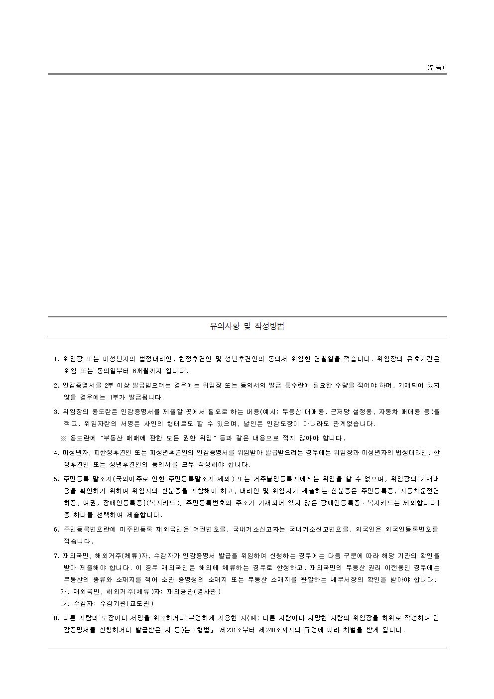 위에 첨부되어 있는 해당 인감증명서 위임장 서식 안에도 유의사항과 작성방법에 대해서 상세하게 표기가 되어있습니다.