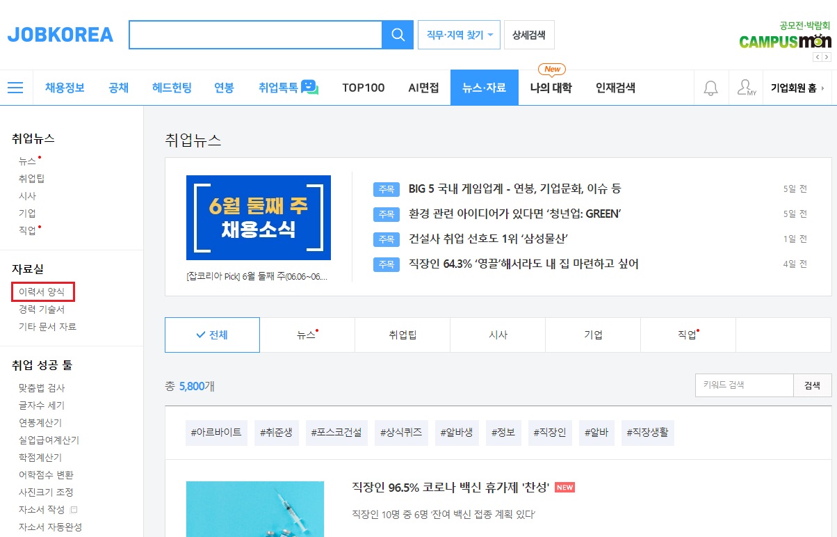 우선 앞전에 서식 자료를 따로 편집을 해서 올린적이 있으나 고전적인 자료들이 많아서 최신 트렌드를 반영하기 어렵다는 단점이 있고 또한 웹문서를 온라인 상에서 다운로드하게 되면 바이러스 위험도 있기 때문에 우리나라 3대 구인 사이트라고 하는 구인 사이트에서 이력서를 다운로드하면 좋을 것 같다는 생각이 듭니다.