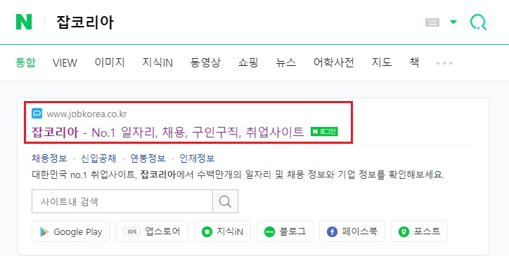 우선 네이버나 다음에 국내 3대 구인 구직 사이트인 '잡코리아'로 검색을 하면 다음과 같은 사이트에 대한 정보가 나옵니다. 우선 첫번째로 뜨게 되는 '잡코리아 - No.1 일자리, 채용, 구인구직, 취업사이트'부분을 눌러 방문합니다. 그러면 아래와 같은 화면으로 이동됩니다.