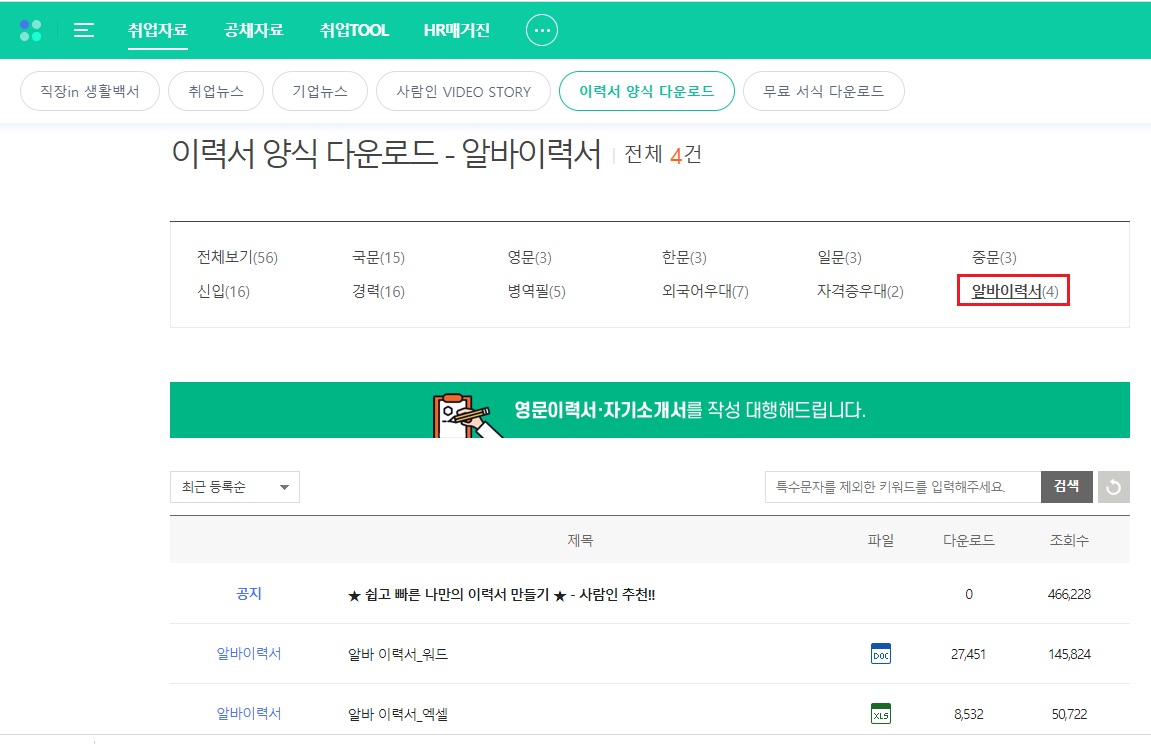 잡코리아 이력서 양식 무료 다운로드 할수있는 경로