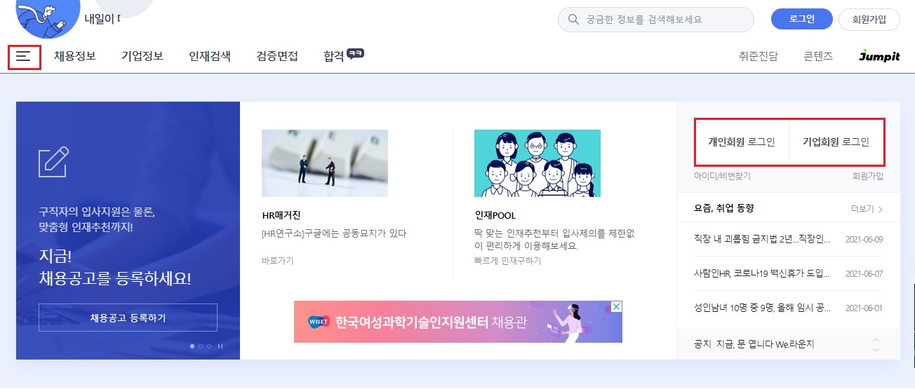 우선 다운로드를 받기 위해서는 로그인을 반드시 해야 합니다. 그래서 오른쪽에 빨간색으로 체크된 부분에 개인회원 로그인, 기업회원 로그인을 하시고 아이디가 없으신 분들은 그 밑에 회원가입을 눌러 가입을 먼저 하시길 바랍니다. 그런 상단 왼쪽에 보이는 채용정보 기업정보 카테고리 가장 왼쪽에 있는 빨간색으로 체크된 삼선으로 되어있는 부분을 누릅니다.