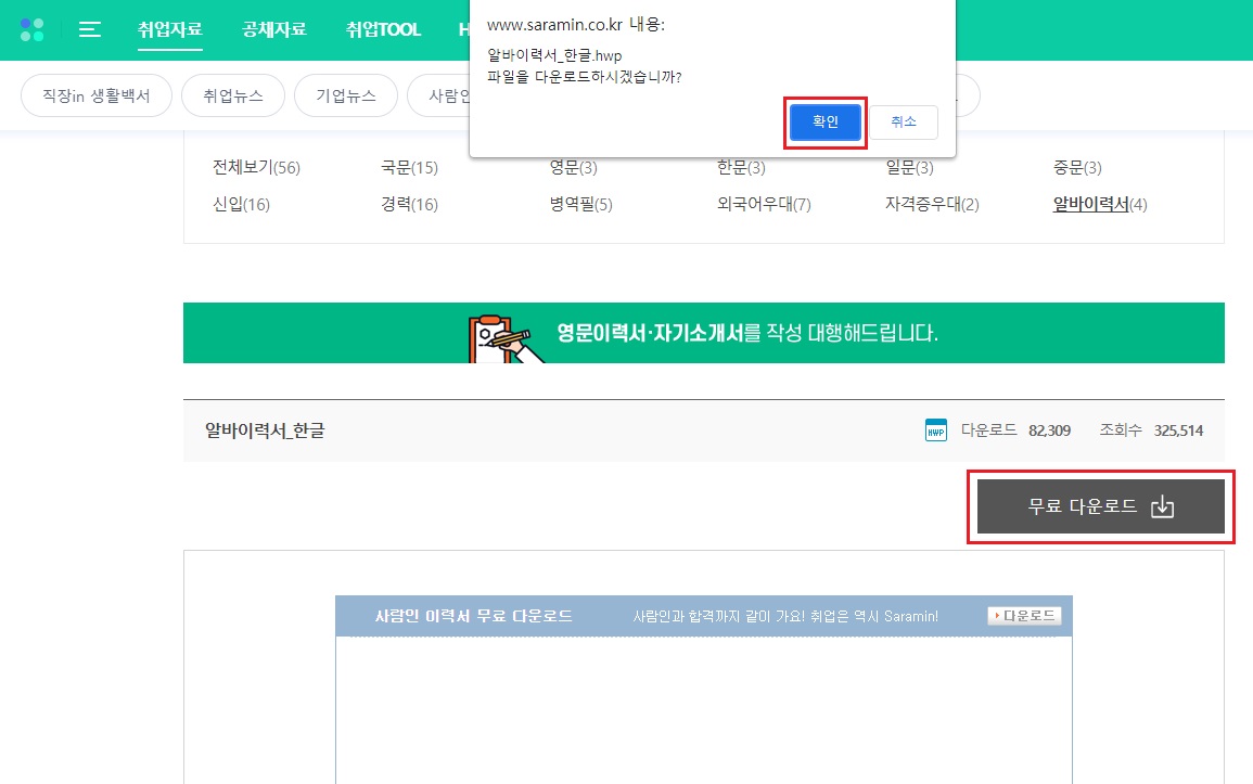 그러면 원문 게시글을 확인할 수 있고요. 검은색 박스로되어있는 '무료 다운로드' 버튼을 누르면 알바이력서 한글.hwp 파일을 다운로드하시겠냐는 물음 창이 뜨고 확인을 누르면 다운로드가 시작됩니다.