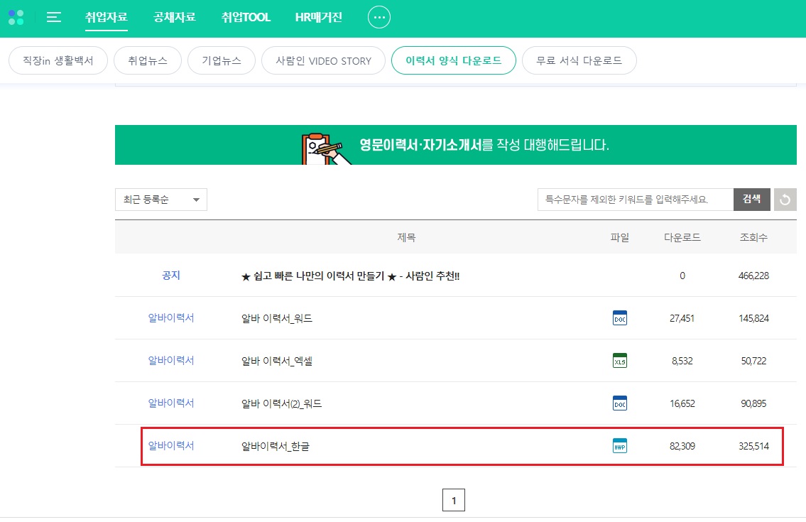 내려보니 조회수가 상당한 이력서를 발견~!! 대부분 워드 파일이 많은지라 한글 파일이 조회수나 다운로드 수가 월등하게 많습니다. 조회수가 높은 알바이력서 한글 파일을 누릅니다.