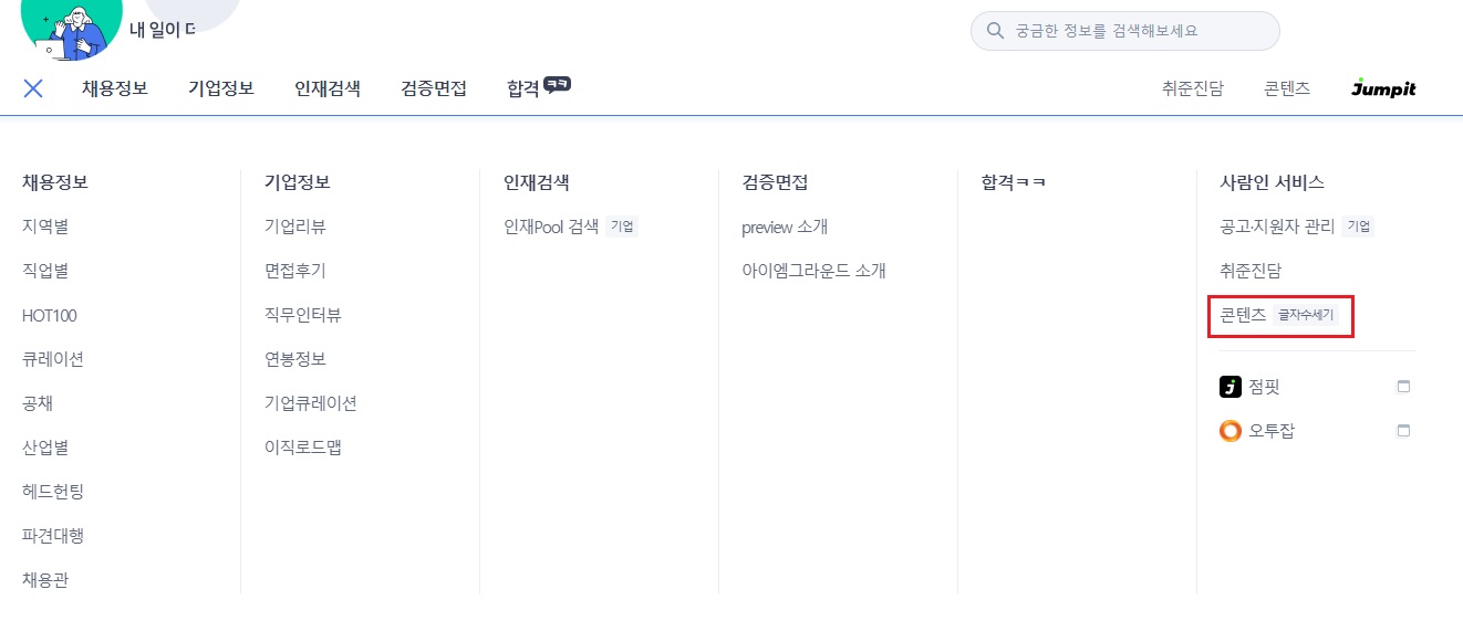 그러면 채용정보, 기업정보, 인재검색, 검증면접, 합격, 사람인 서비스 등의 전체 카테고리가 나오는 것을 확인할 수 있습니다. 그중에서 가장 오른쪽에 있는 제가 빨간색으로 표시해둔 '콘텐츠' 부분을 누릅니다.