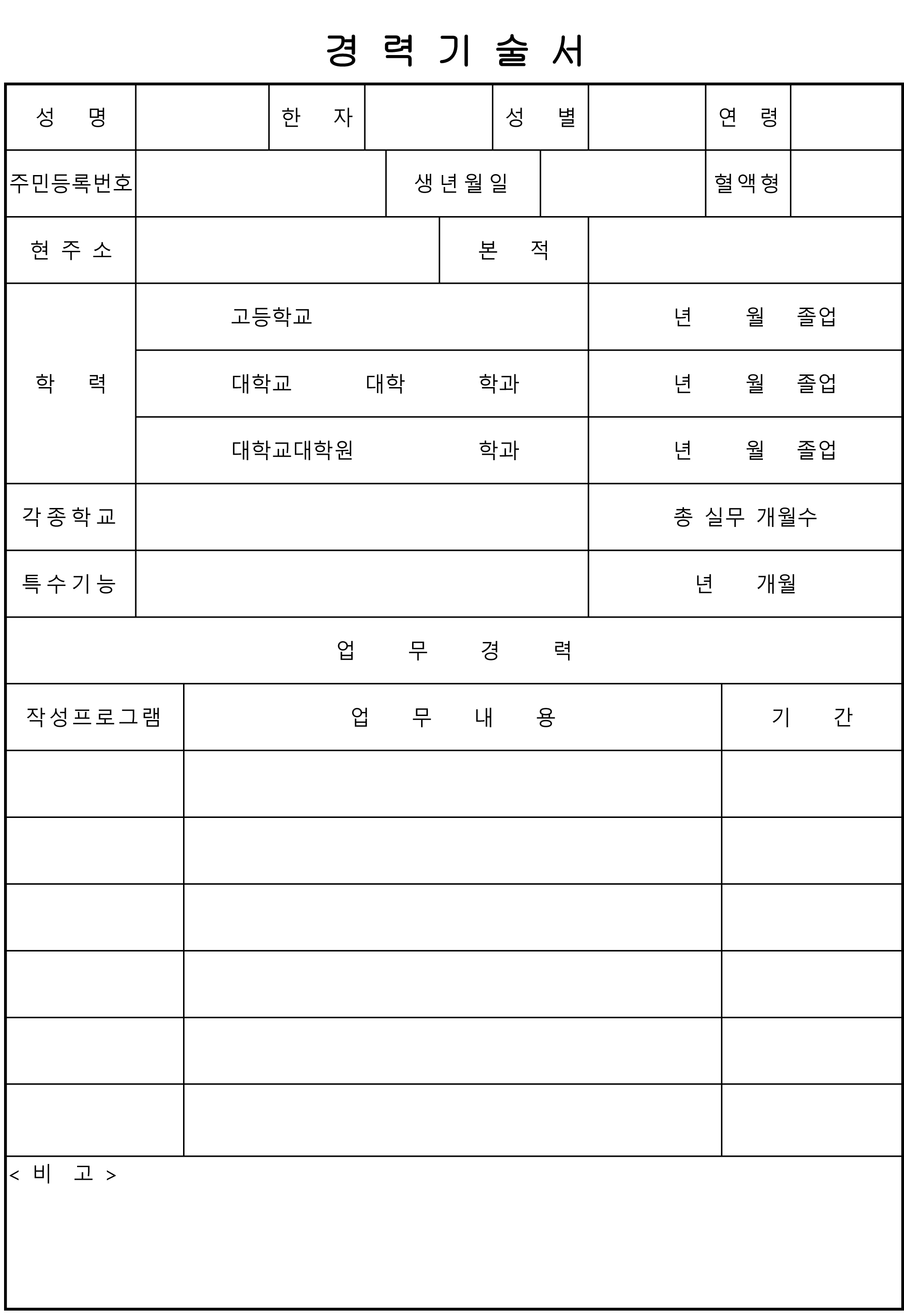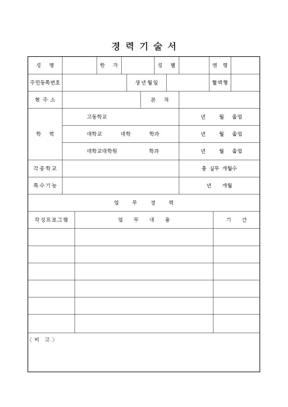 성명과 한자, 성별과 연령, 주민번호와 생년월일, 혈액형, 학력과 특수기능, 작성프로그램 및 비고 등을 기재할 수 있는 경력기술서 양식입니다.