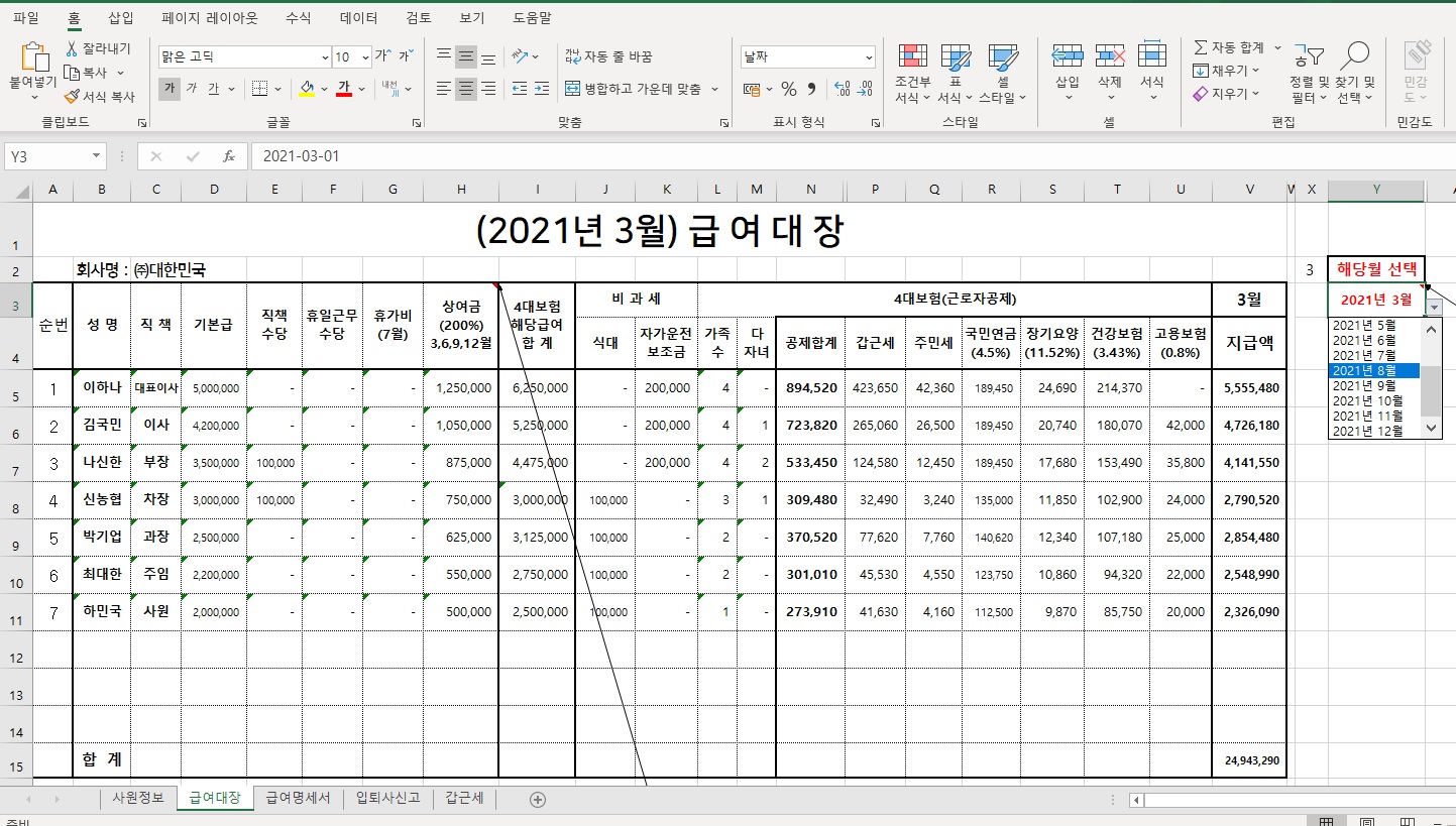 다음은 2021년 사원정보와 급여대장, 급여명세서와 입퇴사신고 및 갑근세가 묶여있는 급여대장 서식입니다. 성명과 직책, 기본급에 따라서 4대보험이 계산이 되며, 공제합계, 주민세, 국민연금, 장기요양, 건강보험, 고용보험 등의 세율이 계산이 되는 4대보험란과 식대와 자가운전보조금 등의 비과세 항목들이 지급 합계 총액으로 계산이 되는 서식입니다.