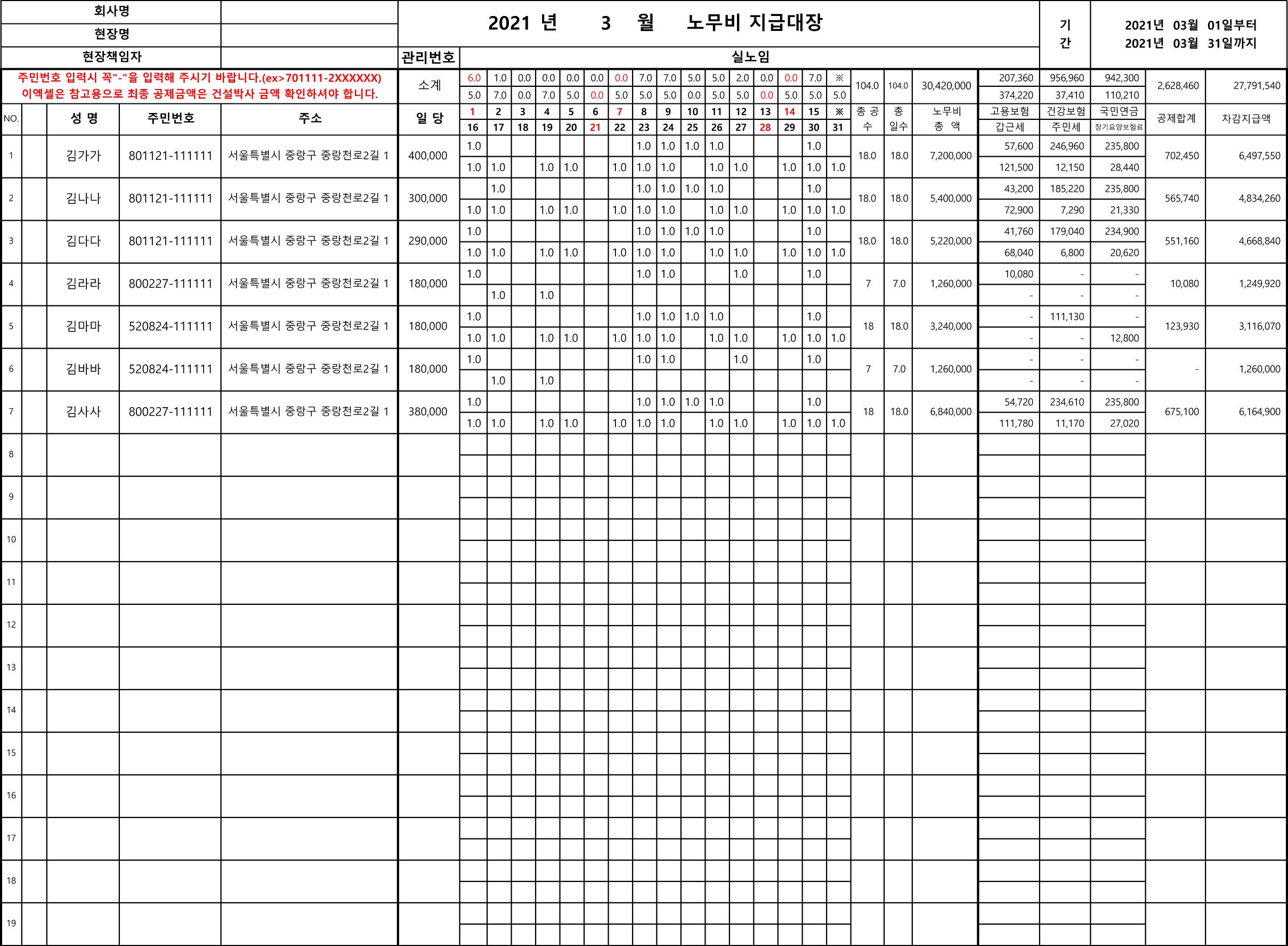 다음은 노임별 실노무비 지급대장 서식입니다. 일용직 근로자 4대보험 자동계산이 되는 서식이며, 갑근세 천원 미만이 미징수로 계산되며, 65세 고용보험이 미징수된다는 점을 참고하여 제작된 문서입니다. 원천징수 세액이 1천원 미만이 될 때에는 소득세를 미징수가 되며, 첫 근무월의 근무하는 날이 1일이 아닌 상황에서도 건강보험료가 징수되지 않아 공란이 되지만 국민연금은 미부과 선택이 가능합니다. 또한 날짜를 기입하여 출근한 근무 일수가 자동으로 계산이 되도록 실노임부분에 출근시 기입을 '1'로 입력하시면 됩니다. 또한 고용보험요율, 건강보험요율, 장기요양보험, 연금보험요율 퍼센트를 각각 기입했으니 해마다 조금씩 달라질 수 있는 요율을 참고하시어 수정 기입하시면 됩니다.
